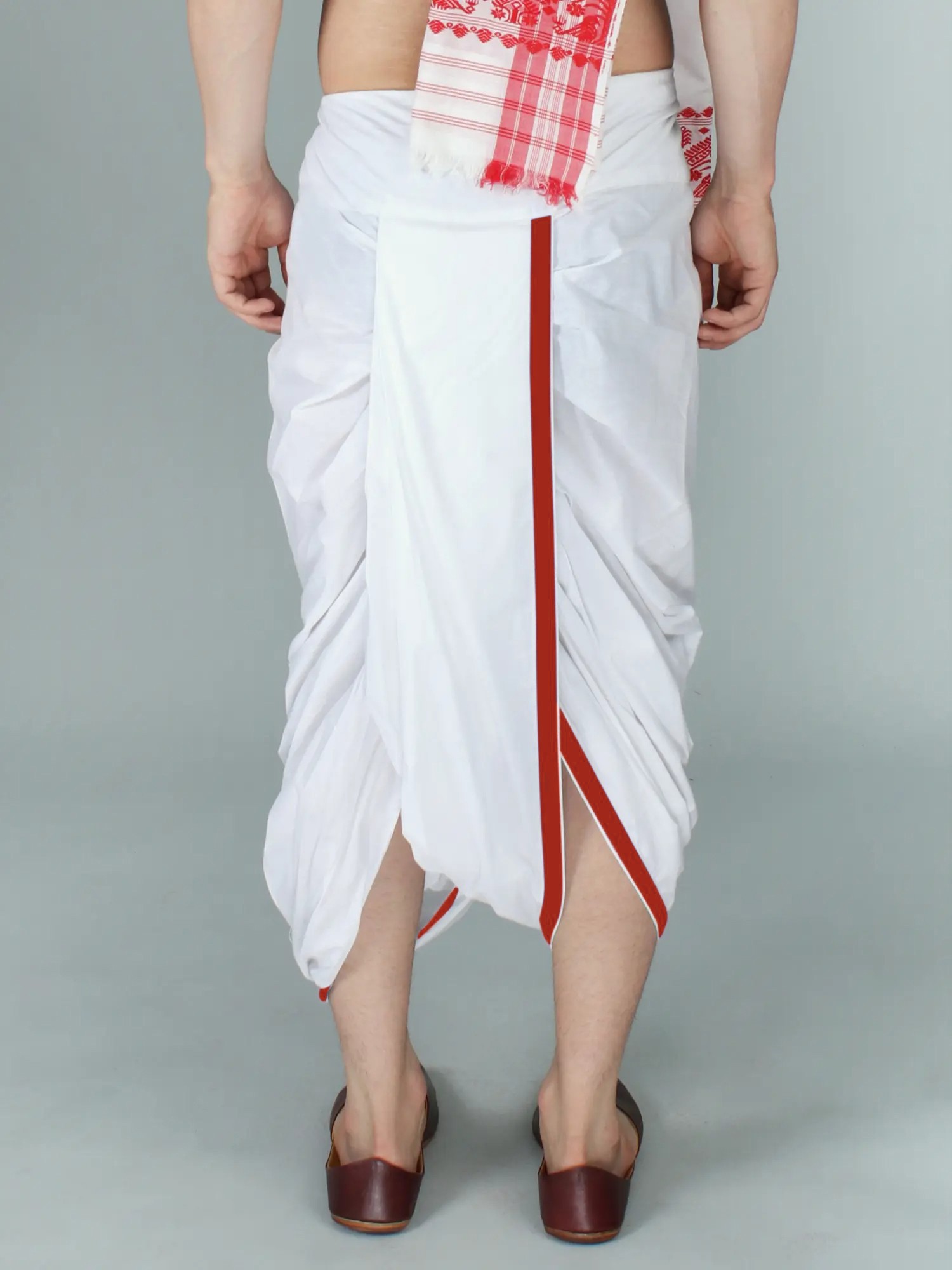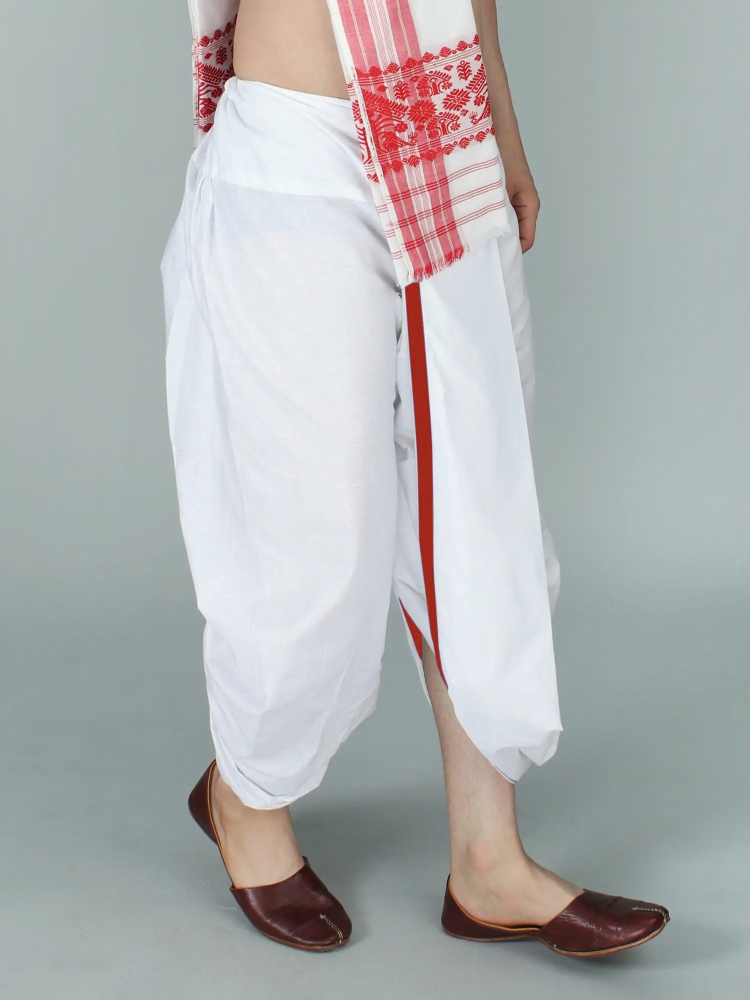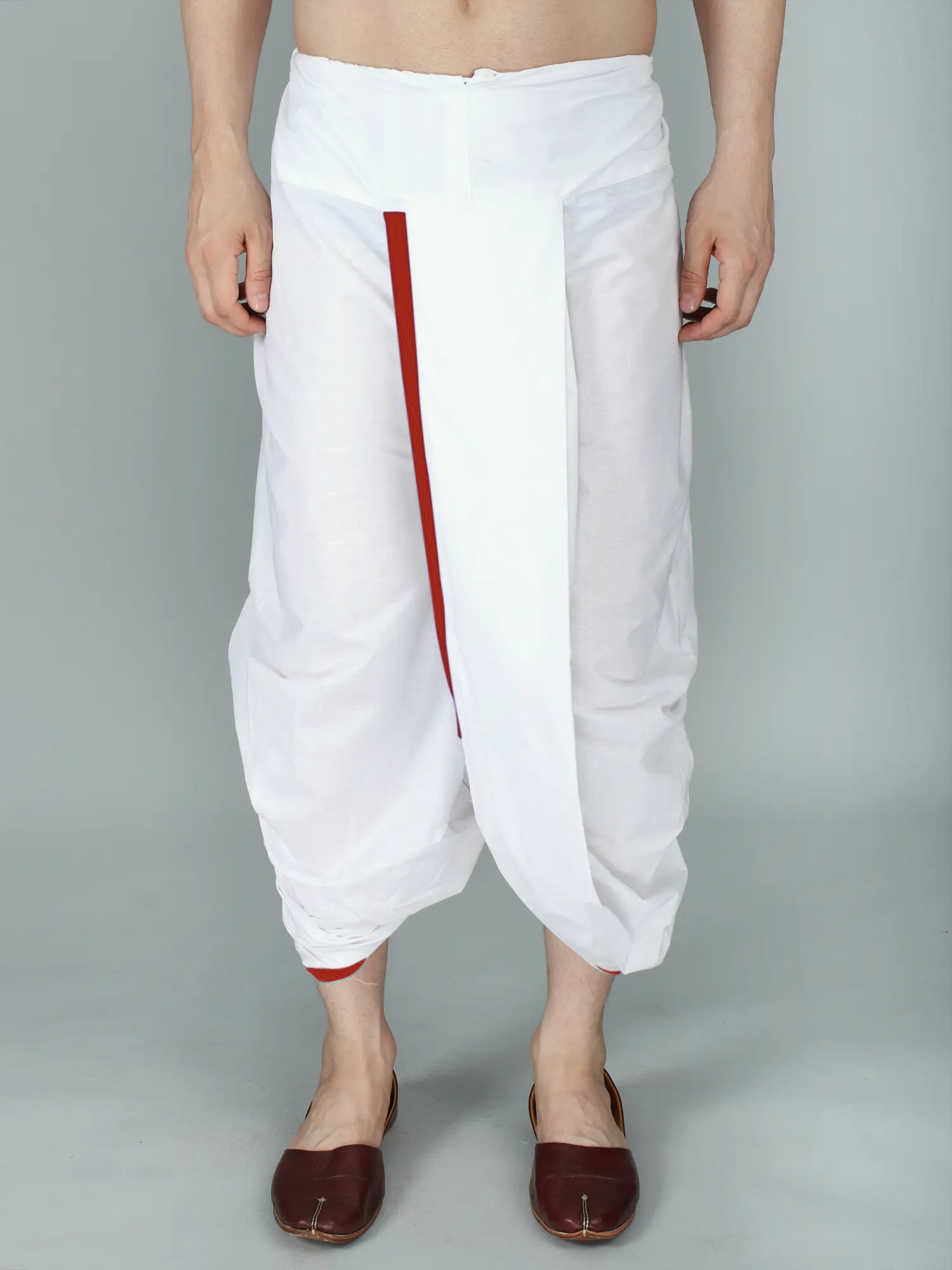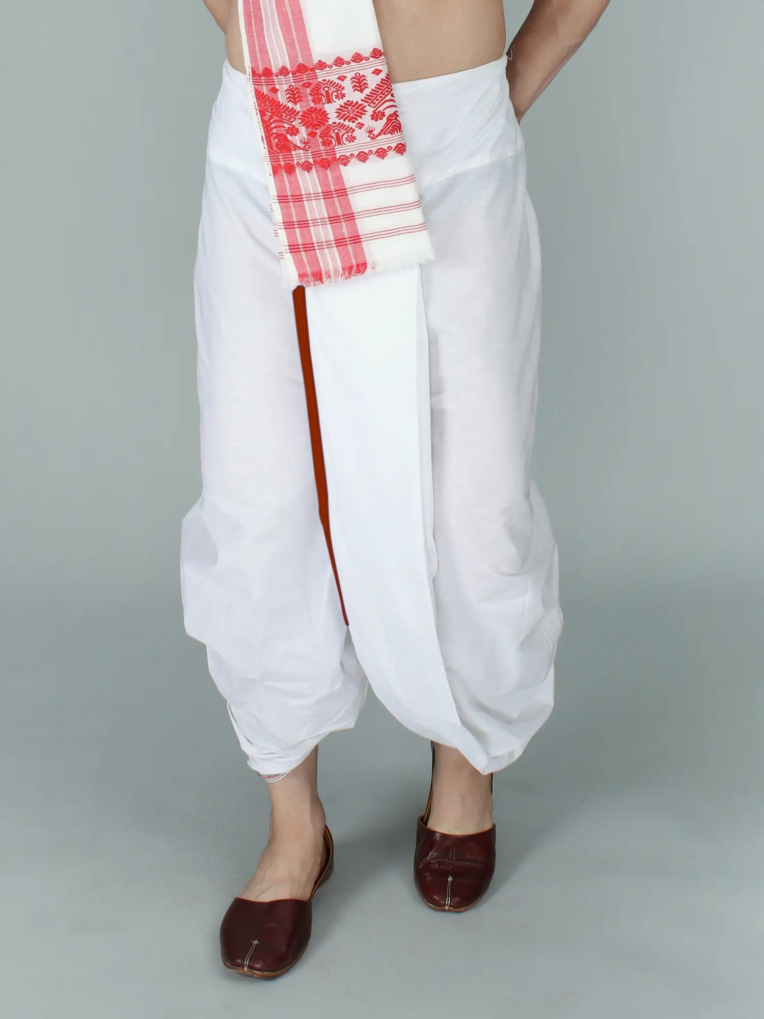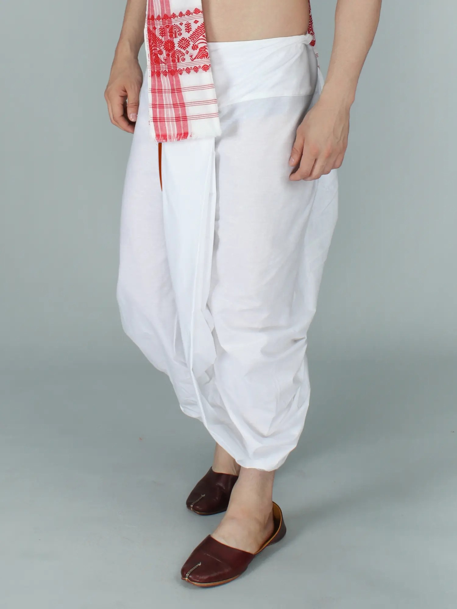 It may be tough to dress traditionally in today's fast-paced environment. Ethnic dress integrates easy-to-wear ways for men to wear traditional apparel on special occasions as men's fashion improves. This bright-white ready-to-wear Dhoti made of 100% cotton is the answer to your Dhoti-wearing concerns. Because of the delicate weave and regal color, the cloth exudes a royal luster. The waistband's elastic guarantees a snug fit and easy wearability, enabling the user to move with comfort and elegance. This dhoti, with its easy-to-wear design and basic yet attractive appearance, is guaranteed to draw attention on special occasions.