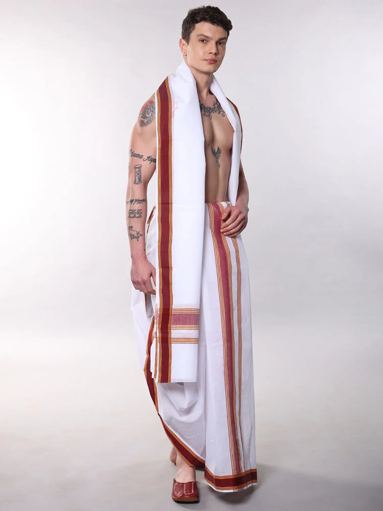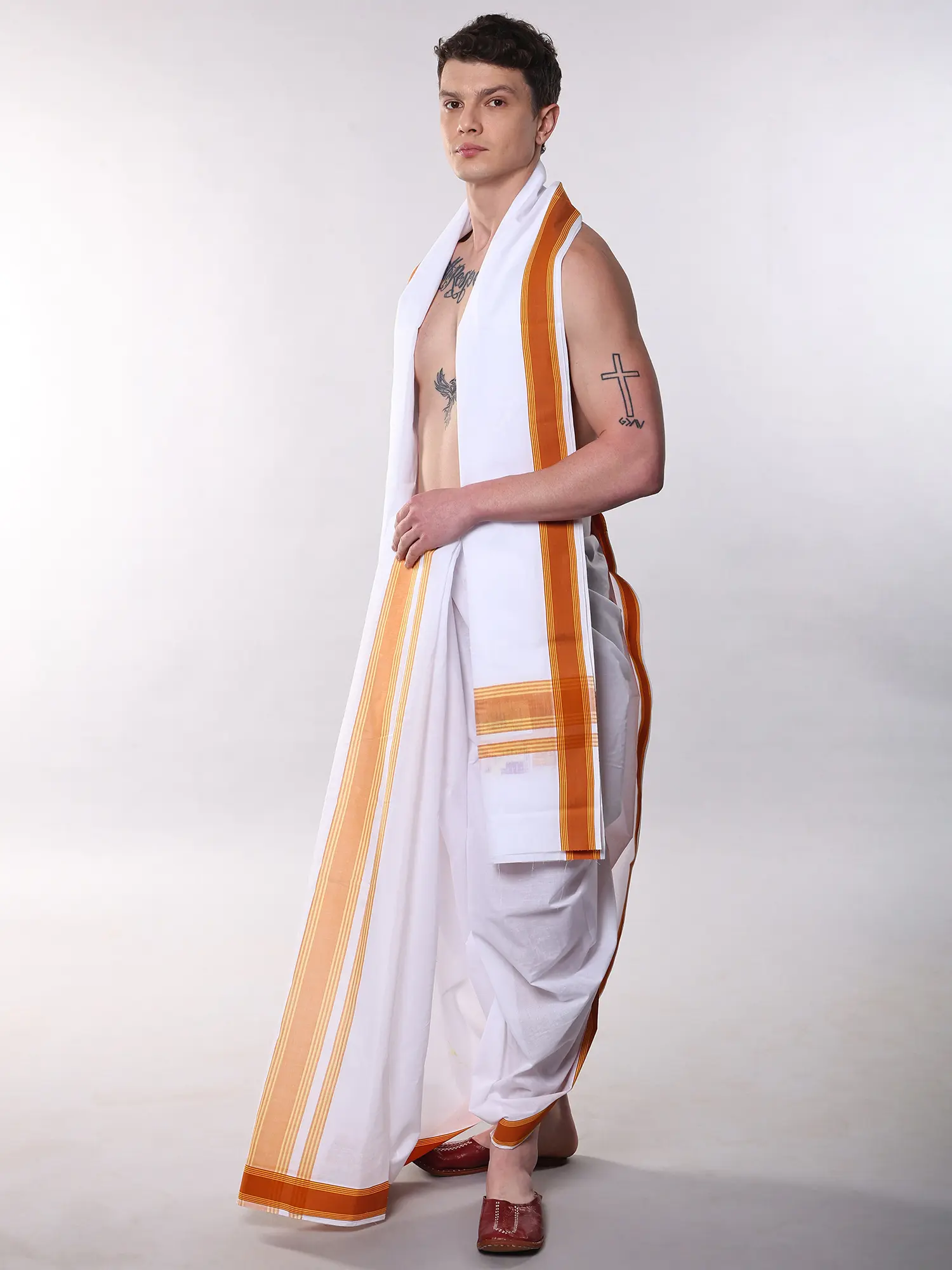 This dhoti and angavastram set transcends fleeting trends, offering a style that is enduring and always in vogue. Its versatility allows it to be worn for a multitude of events. For religious observances, it provides an authentic and respectful appearance. For cultural celebrations, it embodies the spirit of tradition and festivity. Even for everyday comfort, the soft cotton and relaxed drape make it an excellent choice. The classic design ensures it will be a cherished addition to your wardrobe for years to come, a piece that you can rely on to make a statement of refined taste.