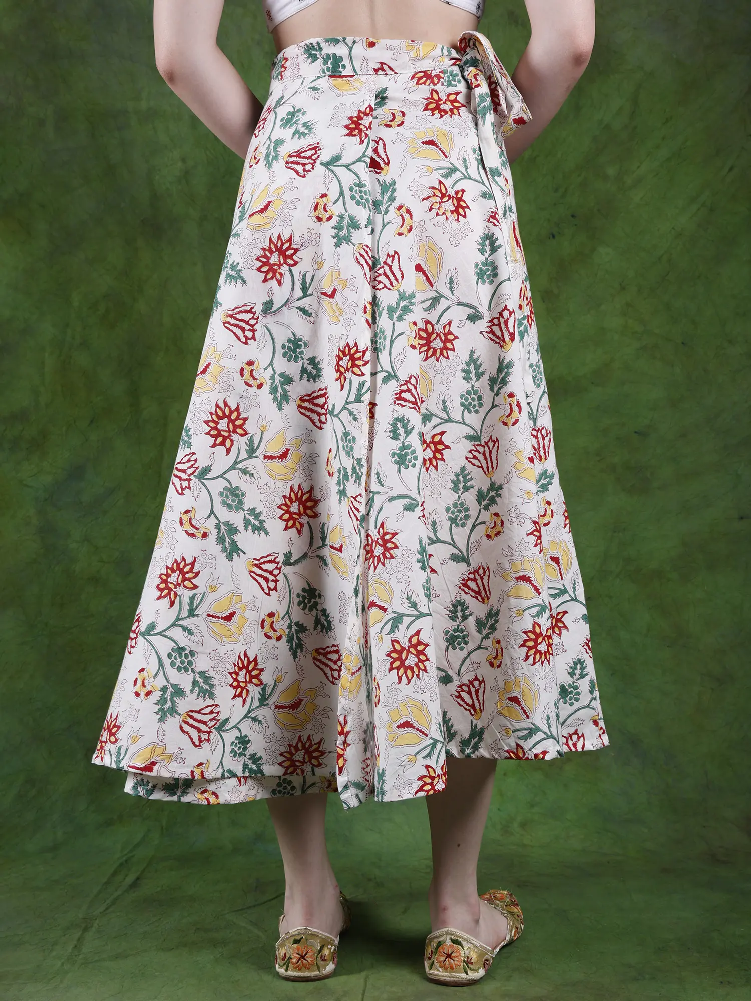 This Bright-White Printed Pure Cotton Wrap-Around Long Summer Skirt offers timeless elegance with its vibrant floral prints decorating every inch of the fabric.