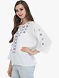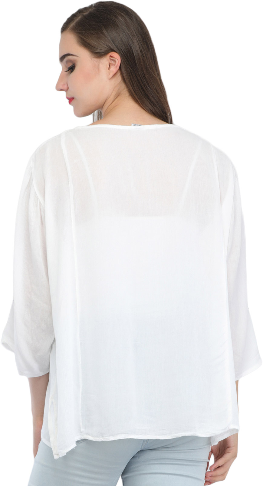 Lightweight to wear, breathable, and effortlessly fashionable clothing, this bright-white short kurti is a beautiful and chic way to experience the charm of traditional Indian wear in your casual fashion. The kurta has been made with pure cotton and beautified with threadwork that creates fine details on the torso and sleeves, with a Dori or thread securing the look on the neck.