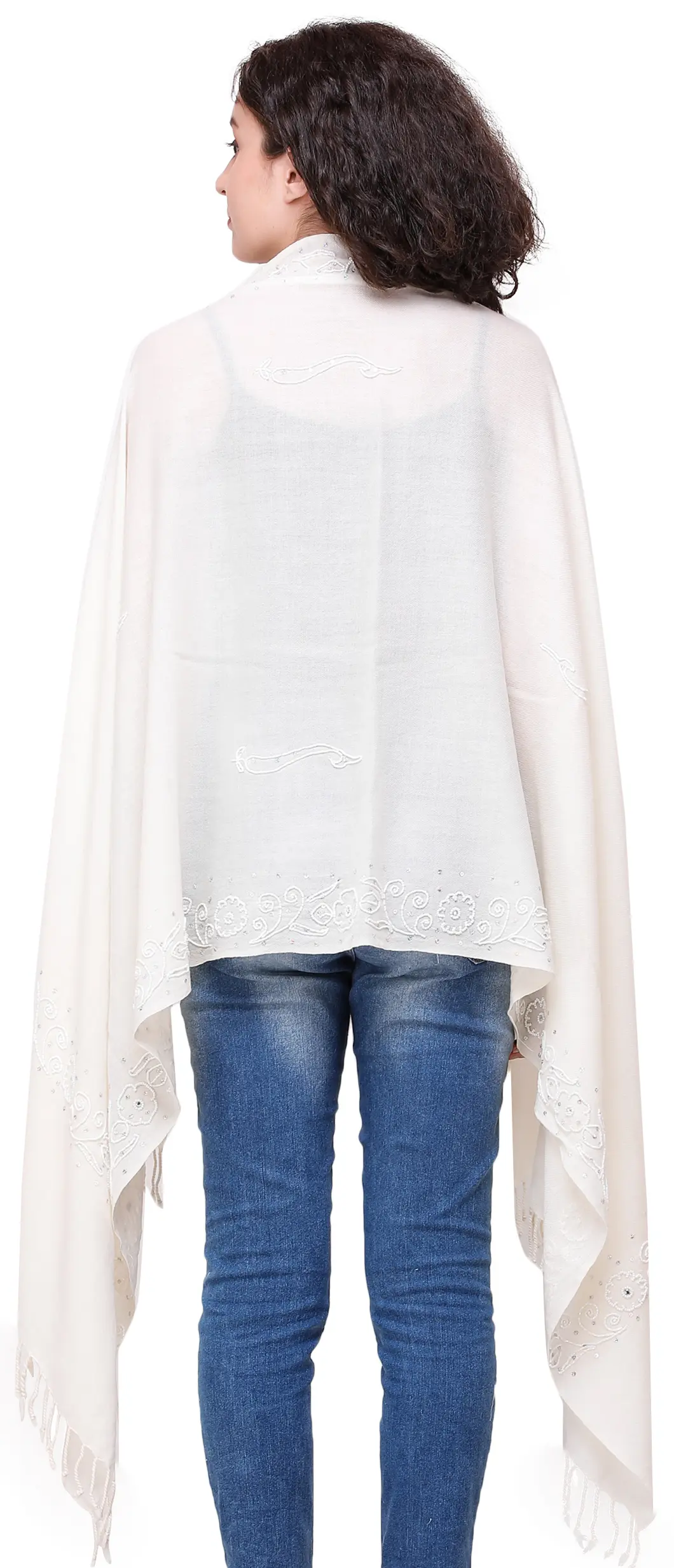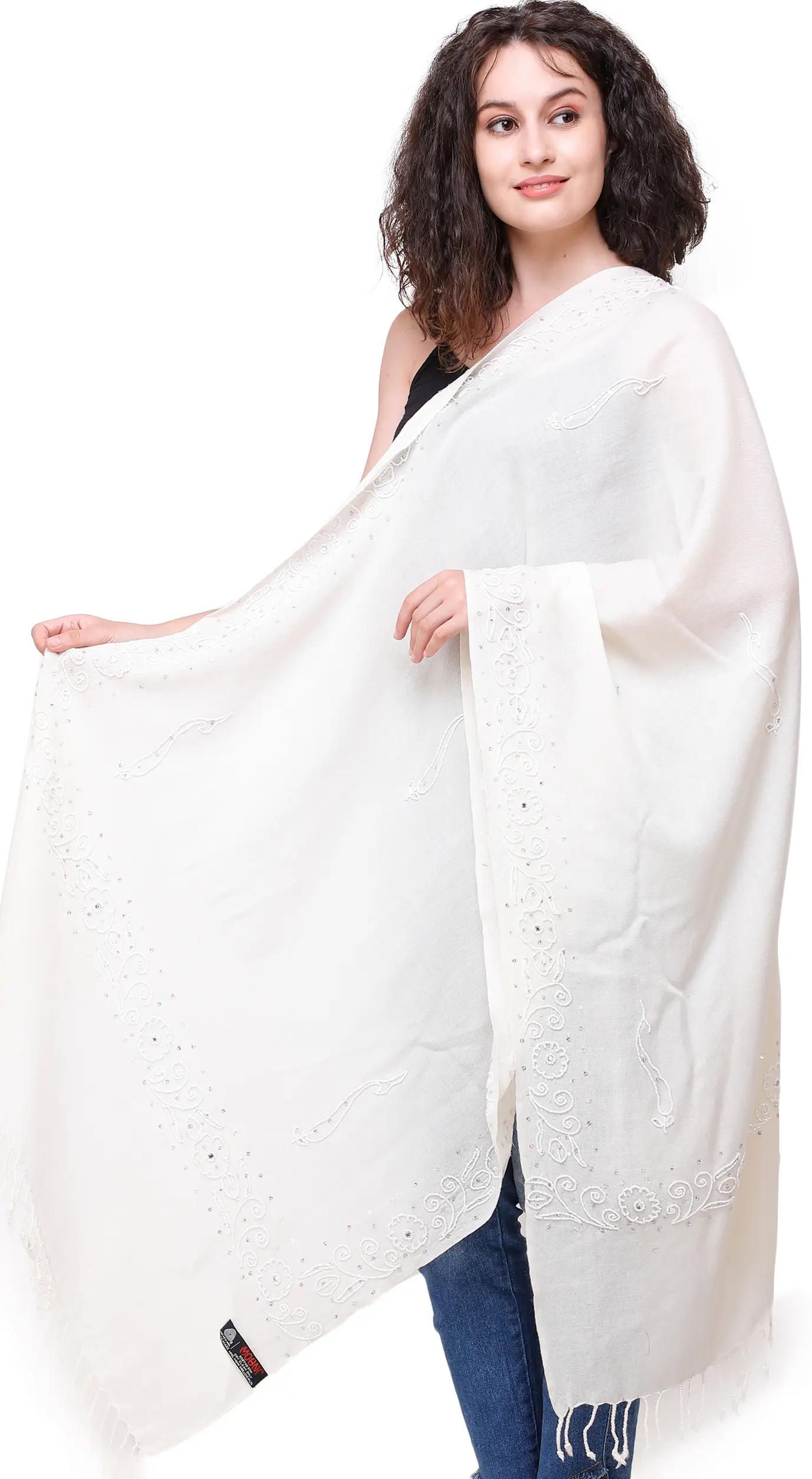 Whisper-White Traditional Woolen Stole from Kashmir with Hand-Embroidered Paisleys and Flowers