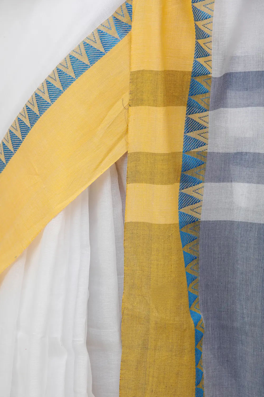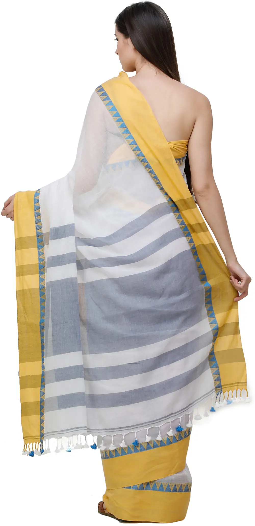 The Bright-White Tangail Puja Sari from Kolkata is a pristine masterpiece, embodying the pure heart of its wearer. Its immaculate white color symbolizes purity, making it the perfect choice for Puja ceremonies. The subtle tones and delicate cotton fabric combine to create a beautiful and serene drape, invoking a sense of tranquility and devotion. To add a touch of charm, matching tassels grace the endpiece, enhancing the sari's elegance and grace. Wearing this sari is not just a tradition; it's a spiritual experience, a reflection of one's inner purity and devotion, and a celebration of Kolkata's rich textile heritage.