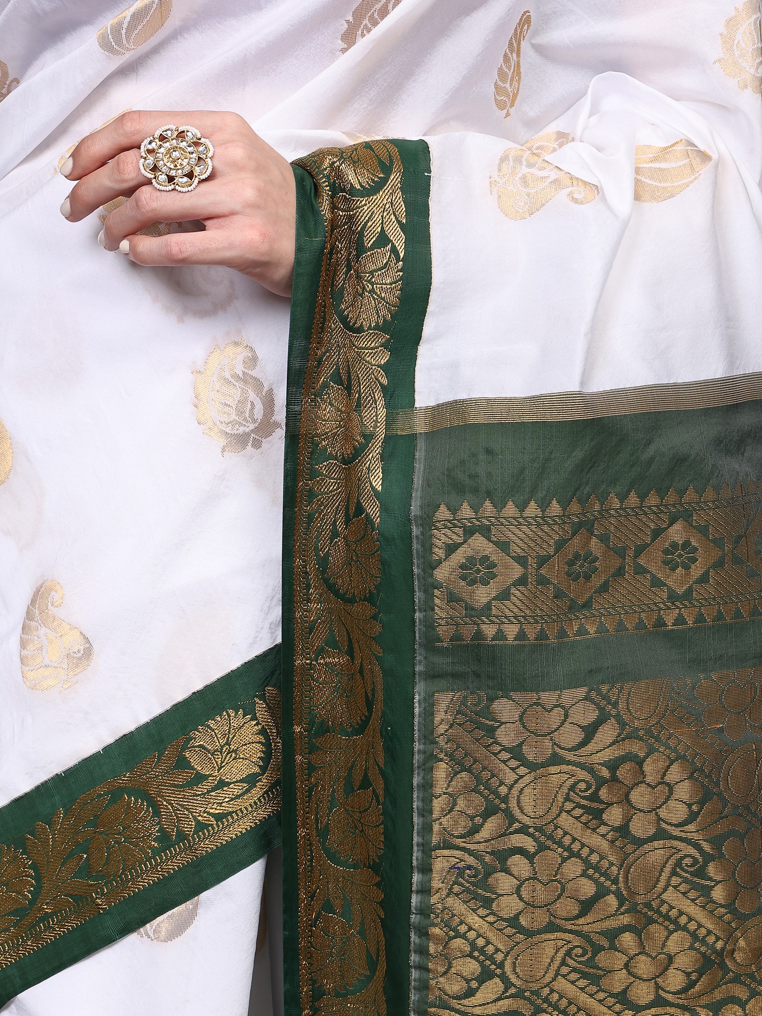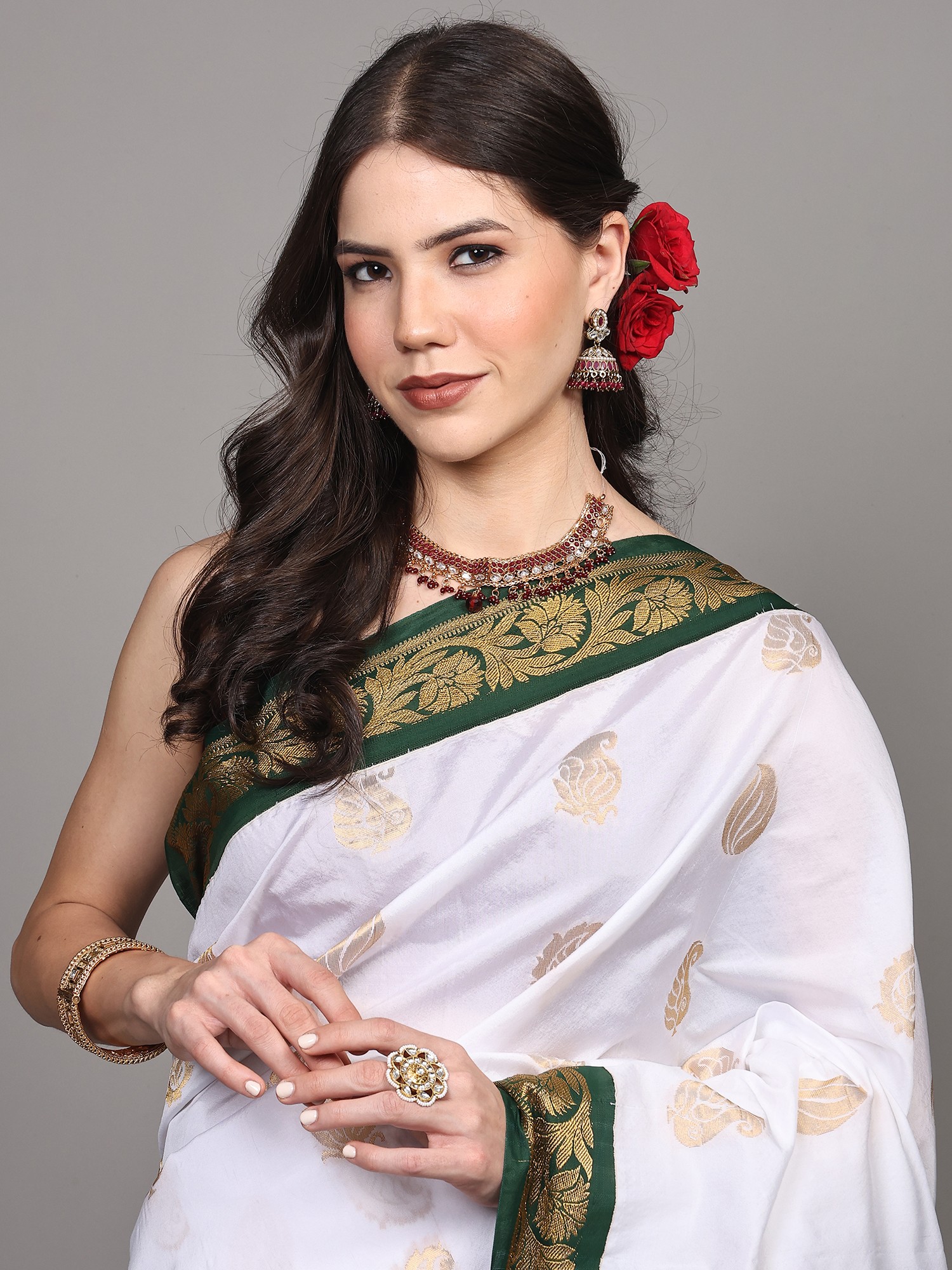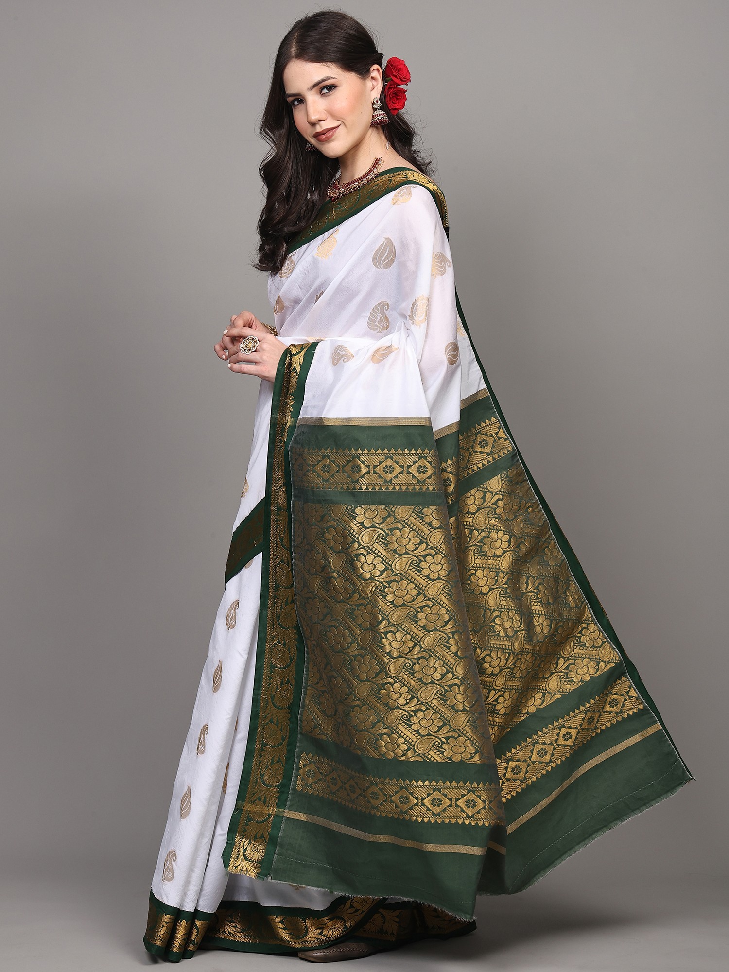 Snow-White Temple Saree with Zari Woven Motifs and Contrast Pallu-Border from Kumbakonam