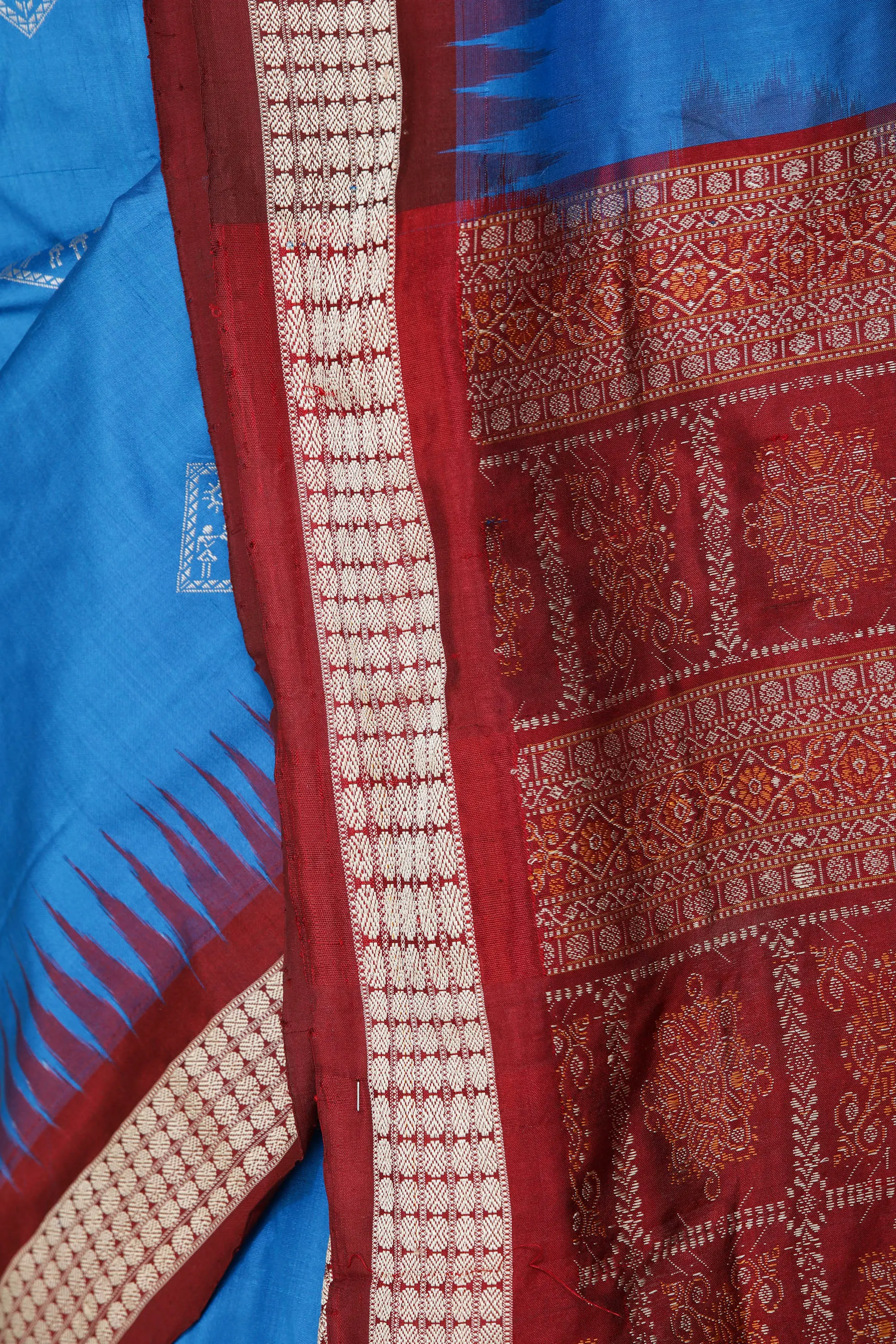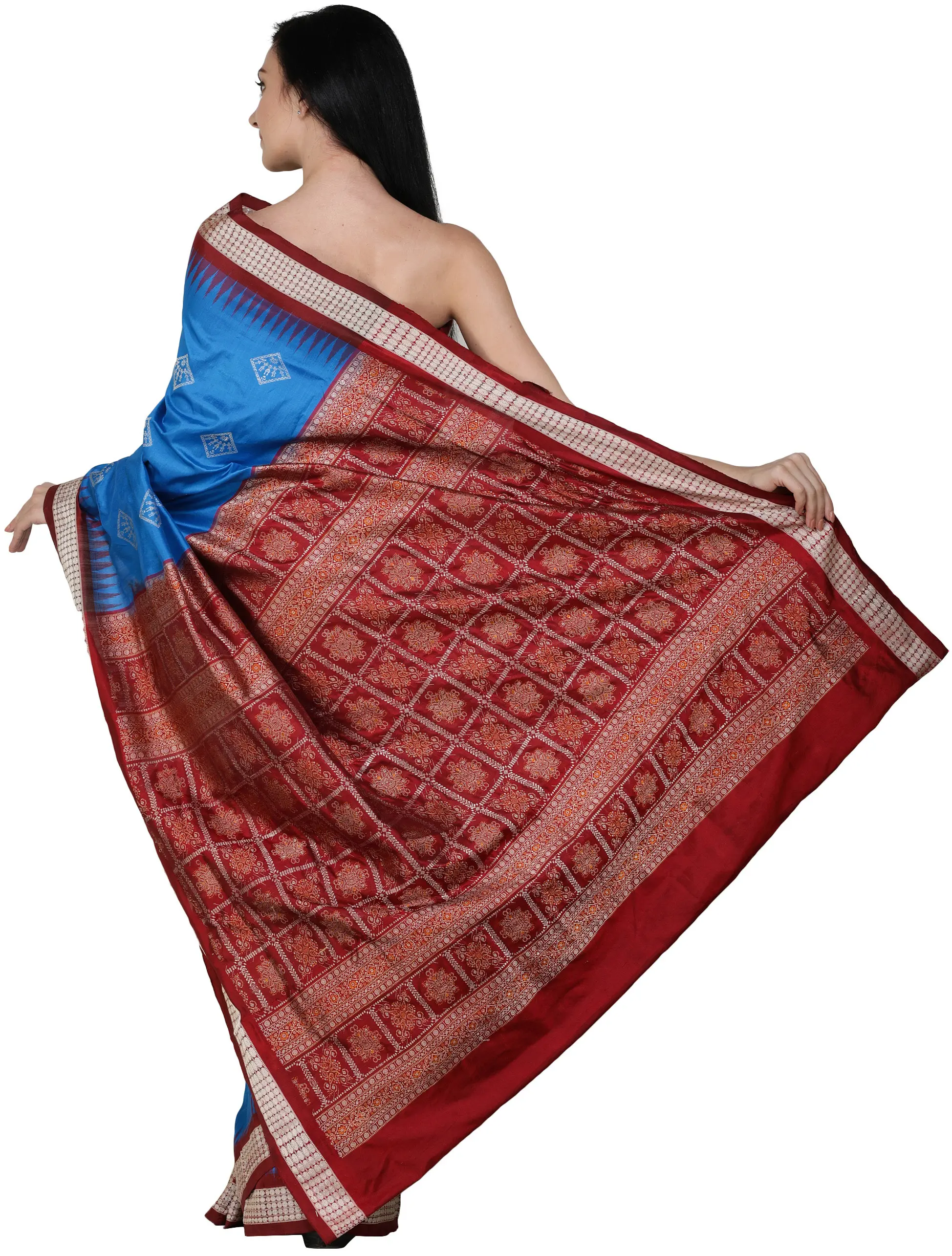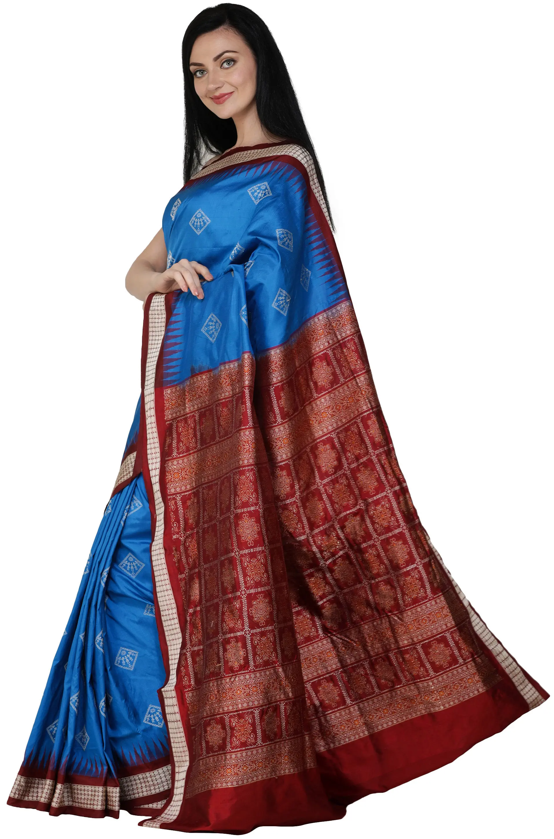 Crafted from pure silk, this saree offers a luxurious drape and a lustrous sheen that is characteristic of this esteemed fabric. The silk ensures that the saree feels sumptuously soft against the skin while holding its form beautifully, creating graceful pleats and a flattering silhouette. The natural properties of silk allow it to catch the light in a way that enhances the vibrancy of the blue and the richness of the maroon, making the woven motifs stand out even more. This pure silk composition guarantees not only comfort but also a timeless appeal that will be cherished for years to come. Experience the exquisite feel and the unparalleled elegance that only pure silk can provide with this magnificent Bomkai creation.
