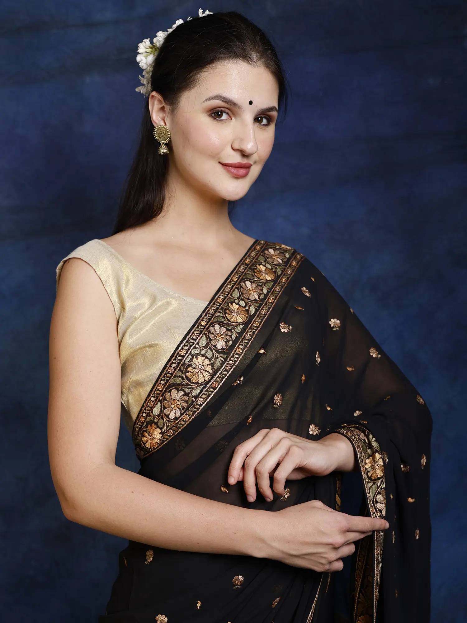 The drape is a piece of art, with the endpiece decorated with embroidered paisleys and figures of women inspired by traditional Indian paintings, making it a celebration of Indian heritage you can wear!