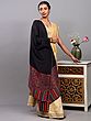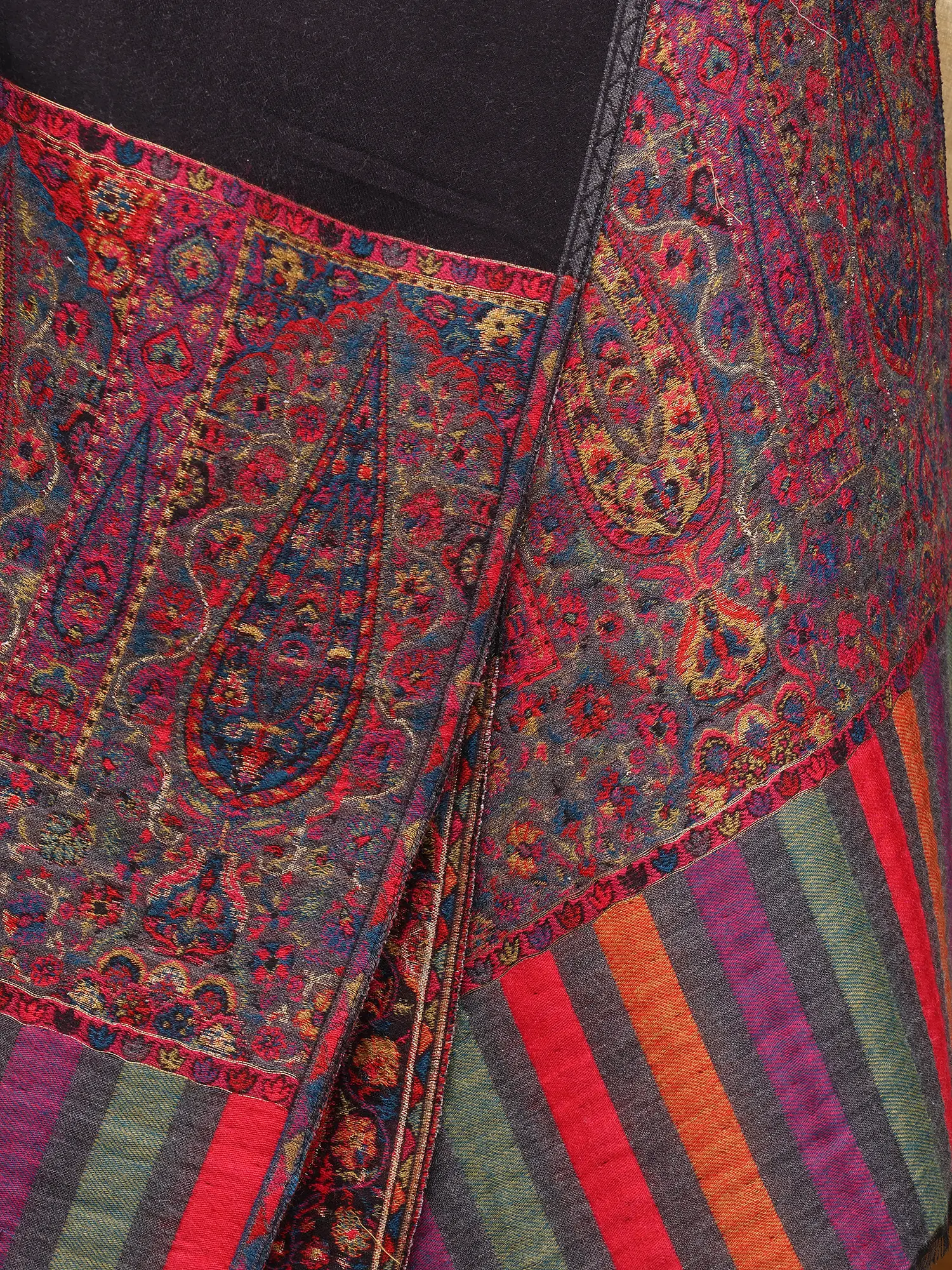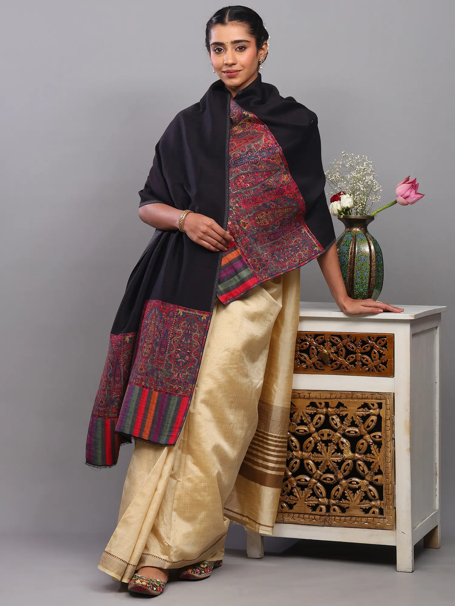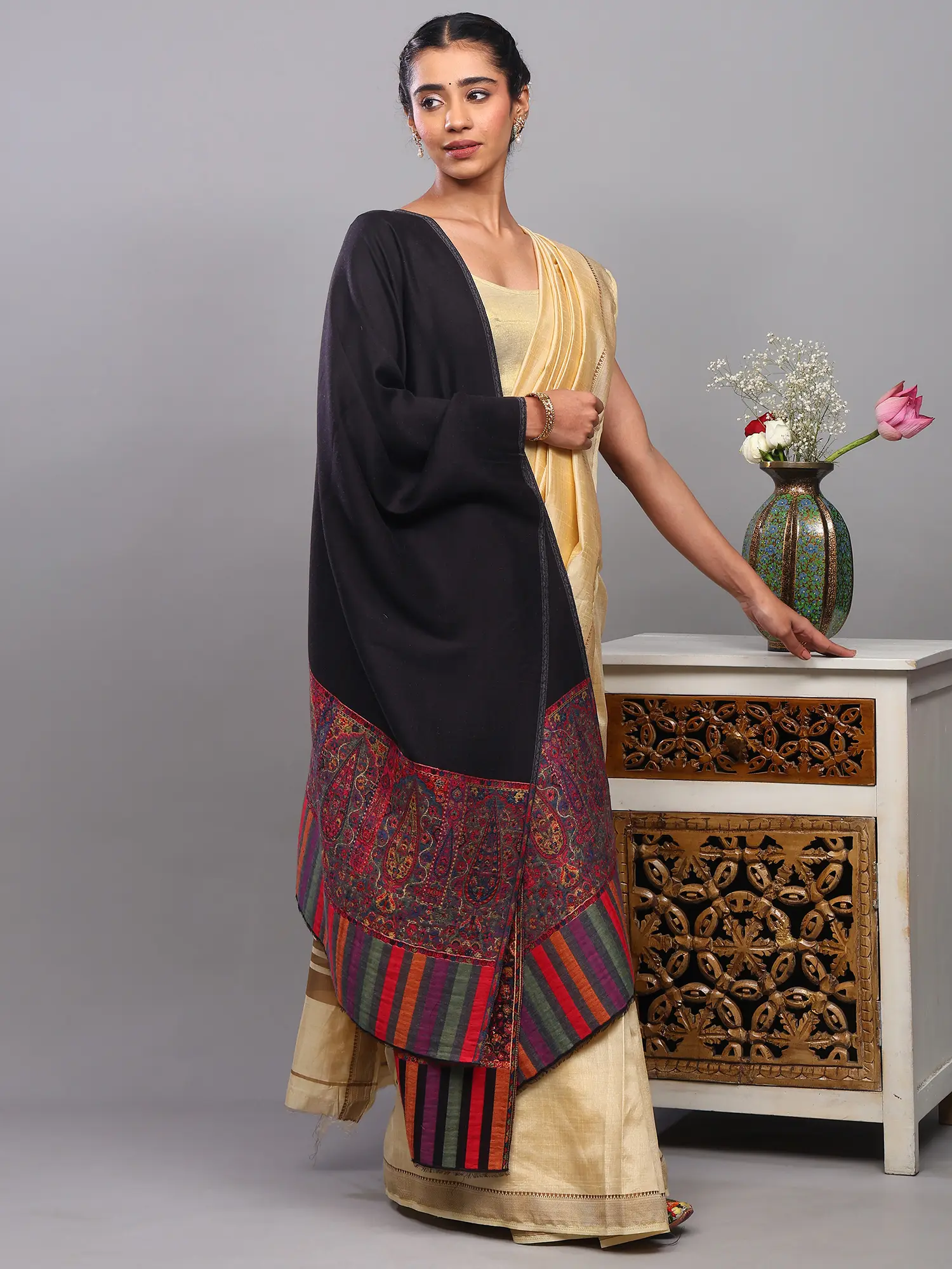 Pirate-Black Pure Wool Stole from Kashmir with Paisleys Aari Embroidery by Hand in Multicolor