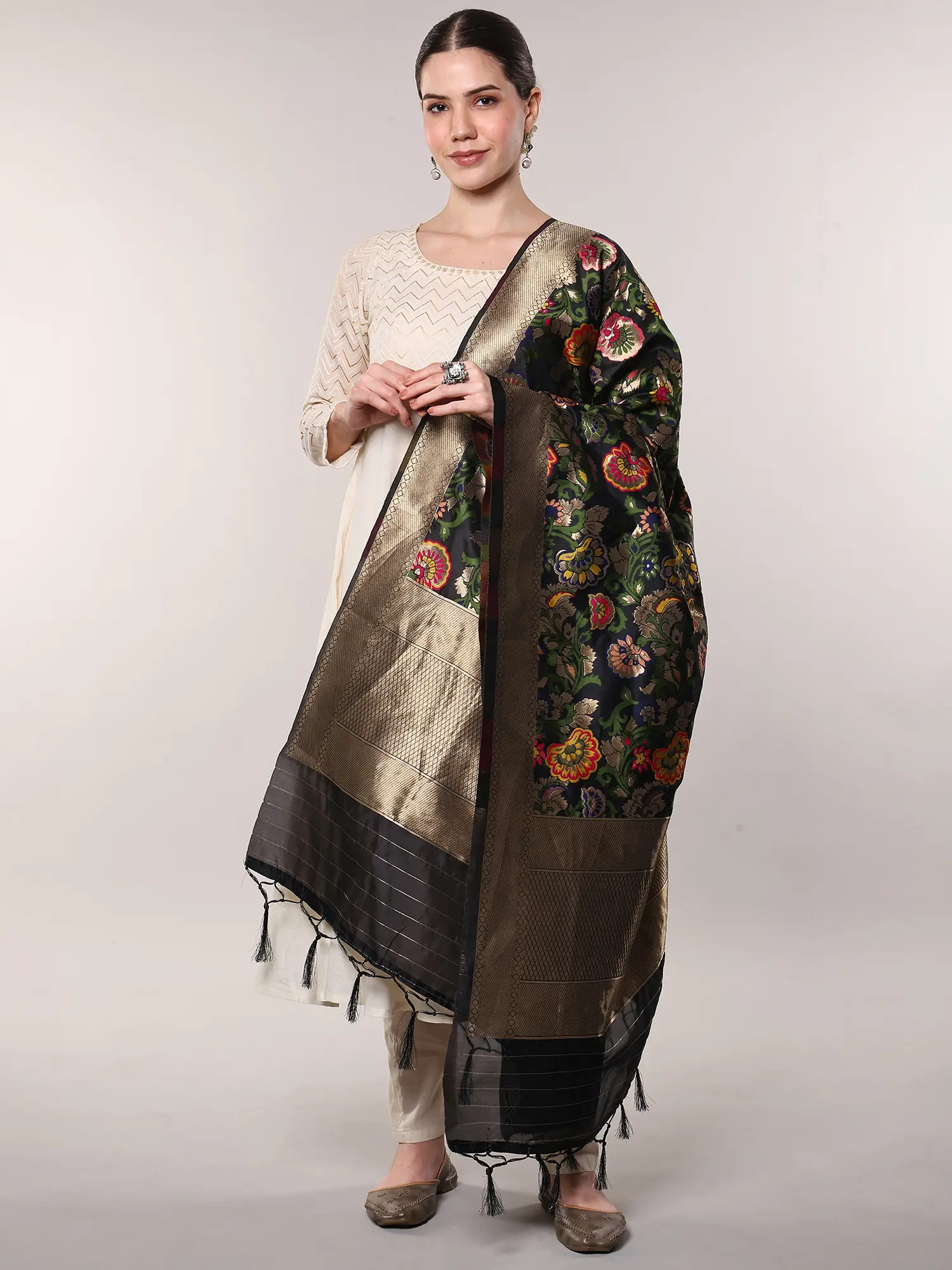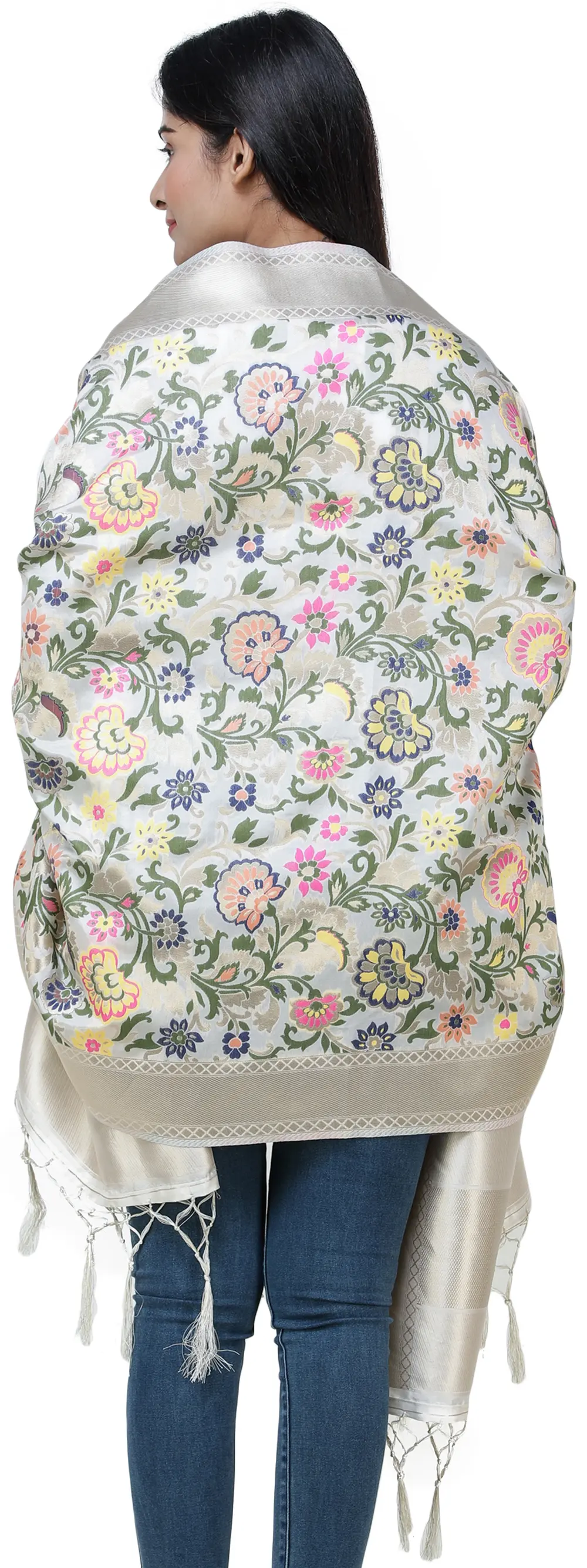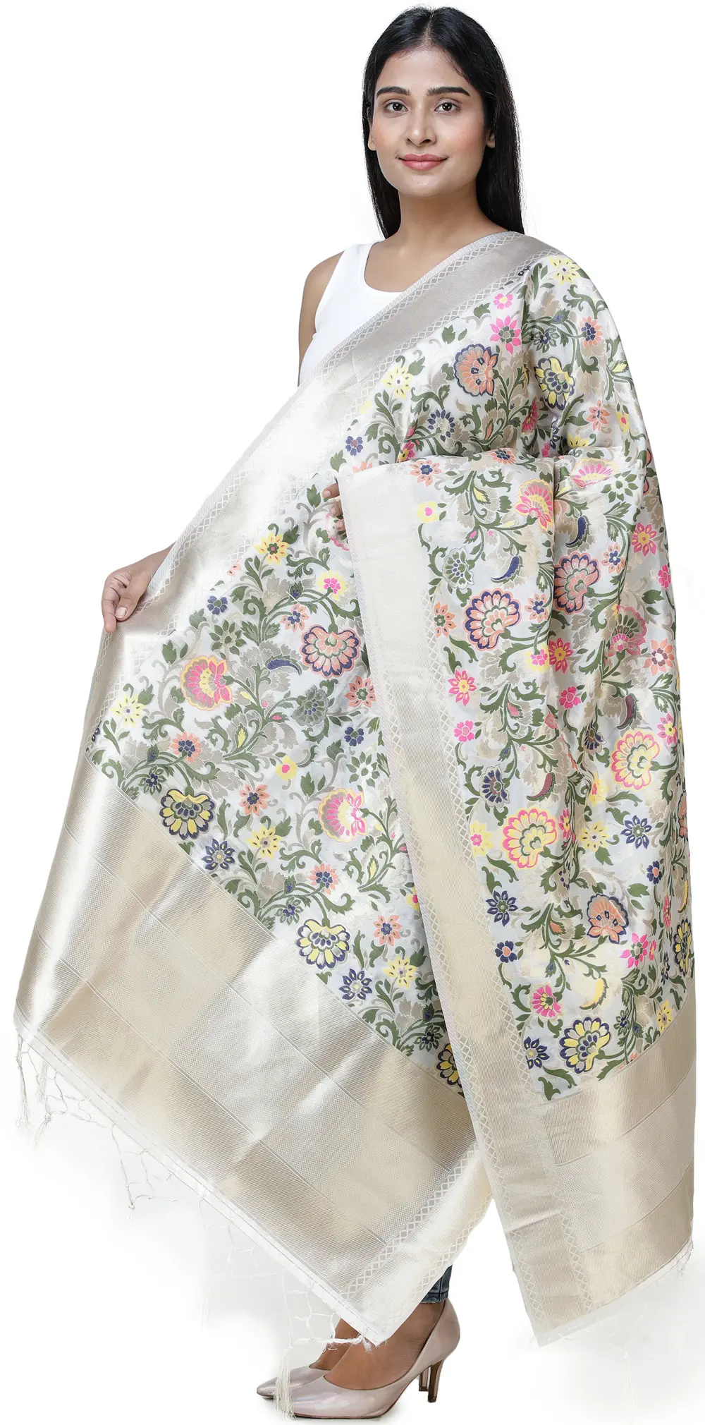 Our Brocade Dupatta from Gujarat with Woven Floral Motifs all over is a vibrant tapestry of culture and creativity. With a pinch of love from rich silk threads, this piece represents the artistry of skilled artisans of Gujarat. Each floral motif is woven meticulously, reflecting the essence of traditional craftsmanship. These designs have a fascinating heritage history, born from the vibrant traditions of Gujarat. Today, they seamlessly blend with contemporary fashion, making this dupatta a style statement. The array of colors used in this masterpiece adds a touch of elegance to any outfit, making it a cherished possession for those who appreciate intricate artistry.