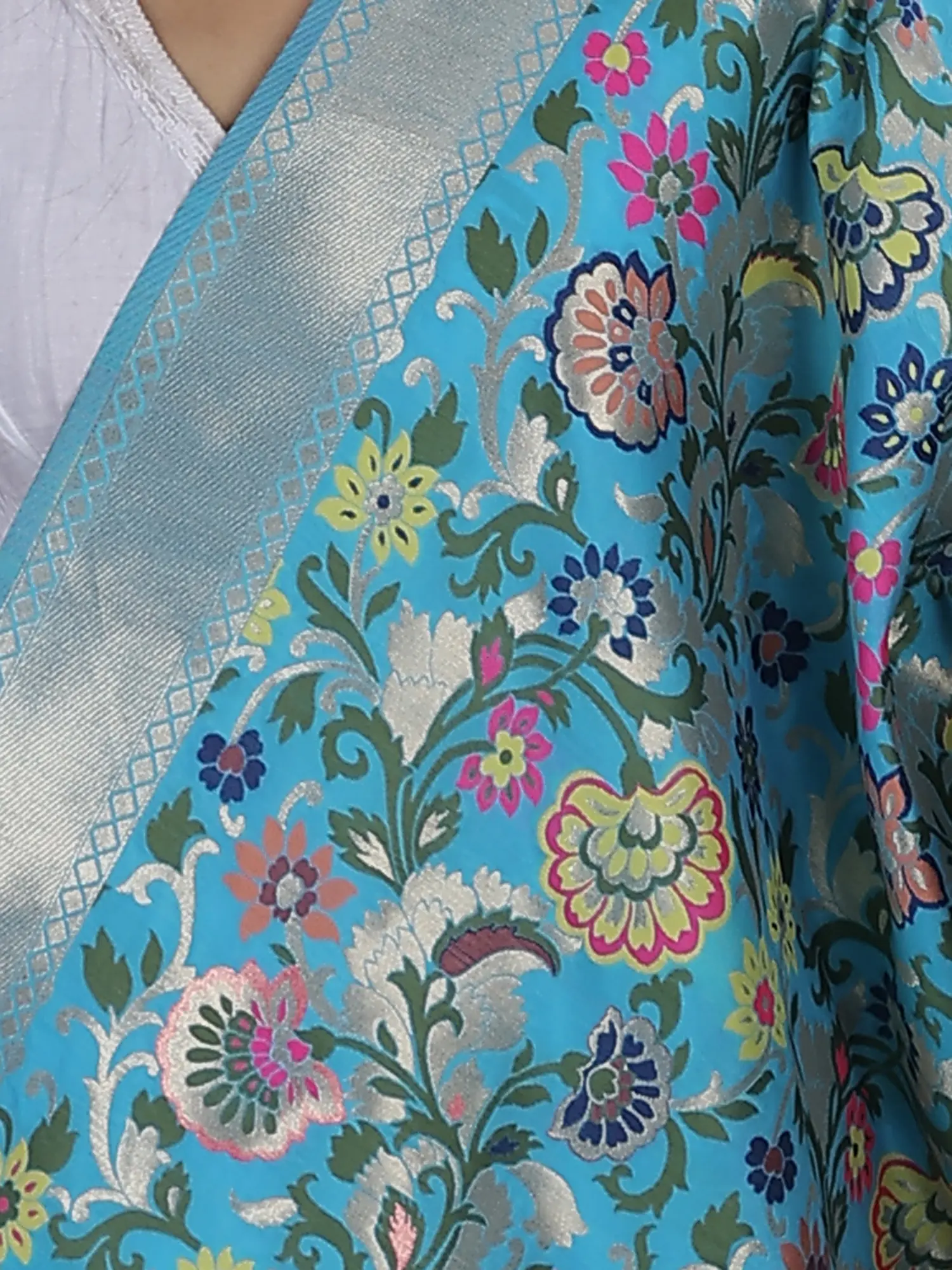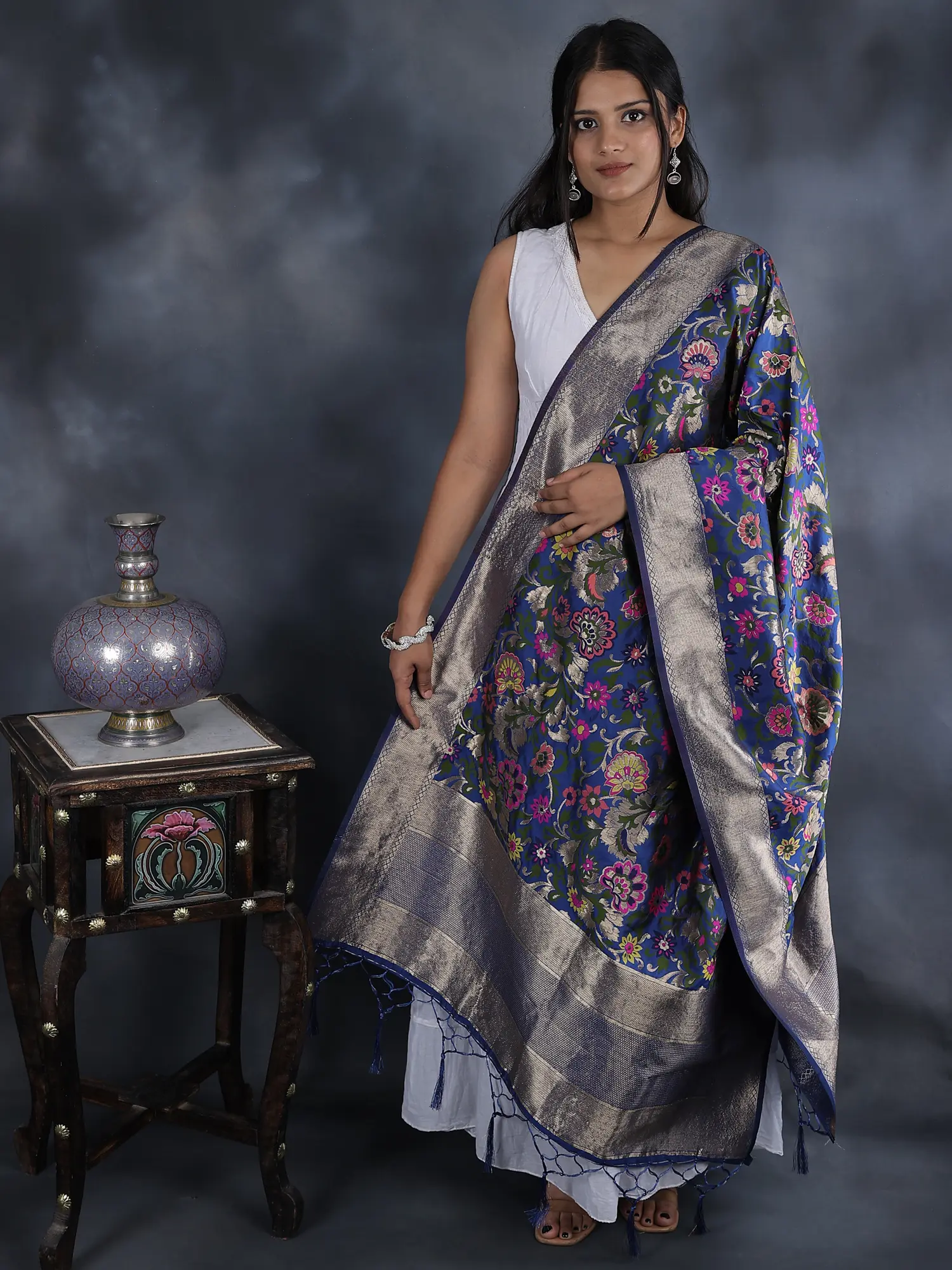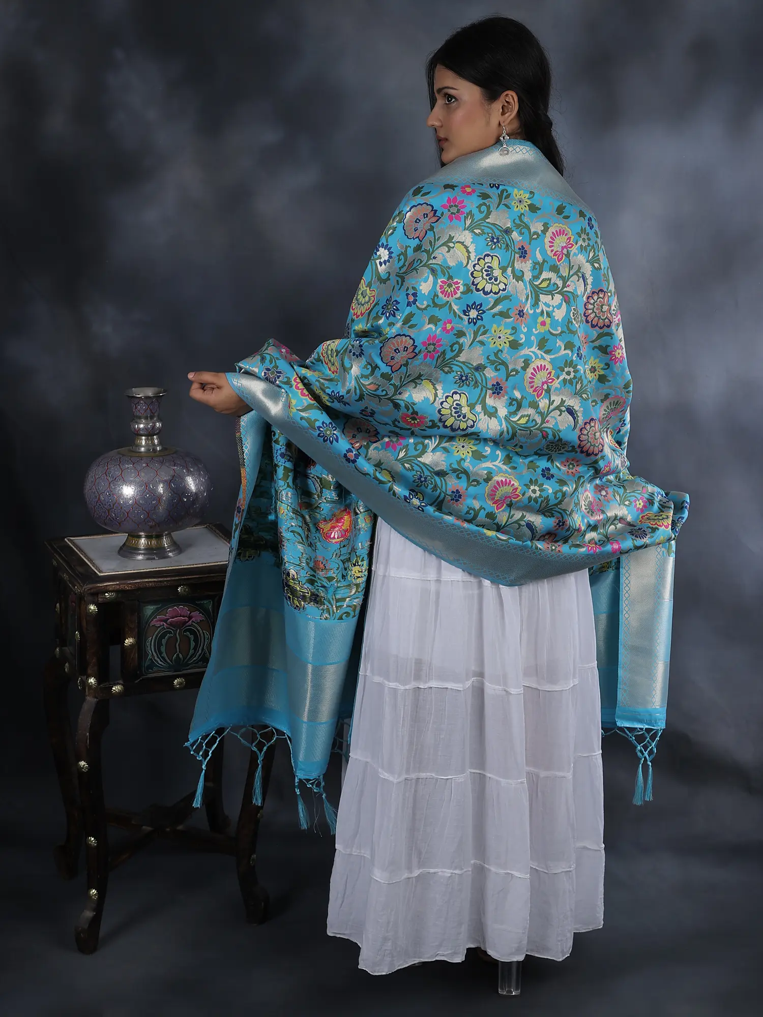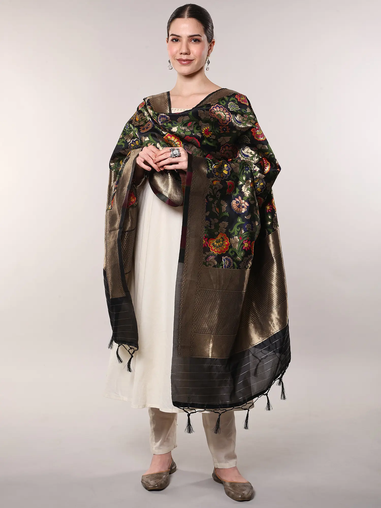 Our Brocade Dupatta from Gujarat with Woven Floral Motifs all over is a vibrant tapestry of culture and creativity. With a pinch of love from rich silk threads, this piece represents the artistry of skilled artisans of Gujarat. Each floral motif is woven meticulously, reflecting the essence of traditional craftsmanship. These designs have a fascinating heritage history, born from the vibrant traditions of Gujarat. Today, they seamlessly blend with contemporary fashion, making this dupatta a style statement. The array of colors used in this masterpiece adds a touch of elegance to any outfit, making it a cherished possession for those who appreciate intricate artistry.