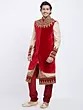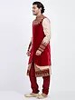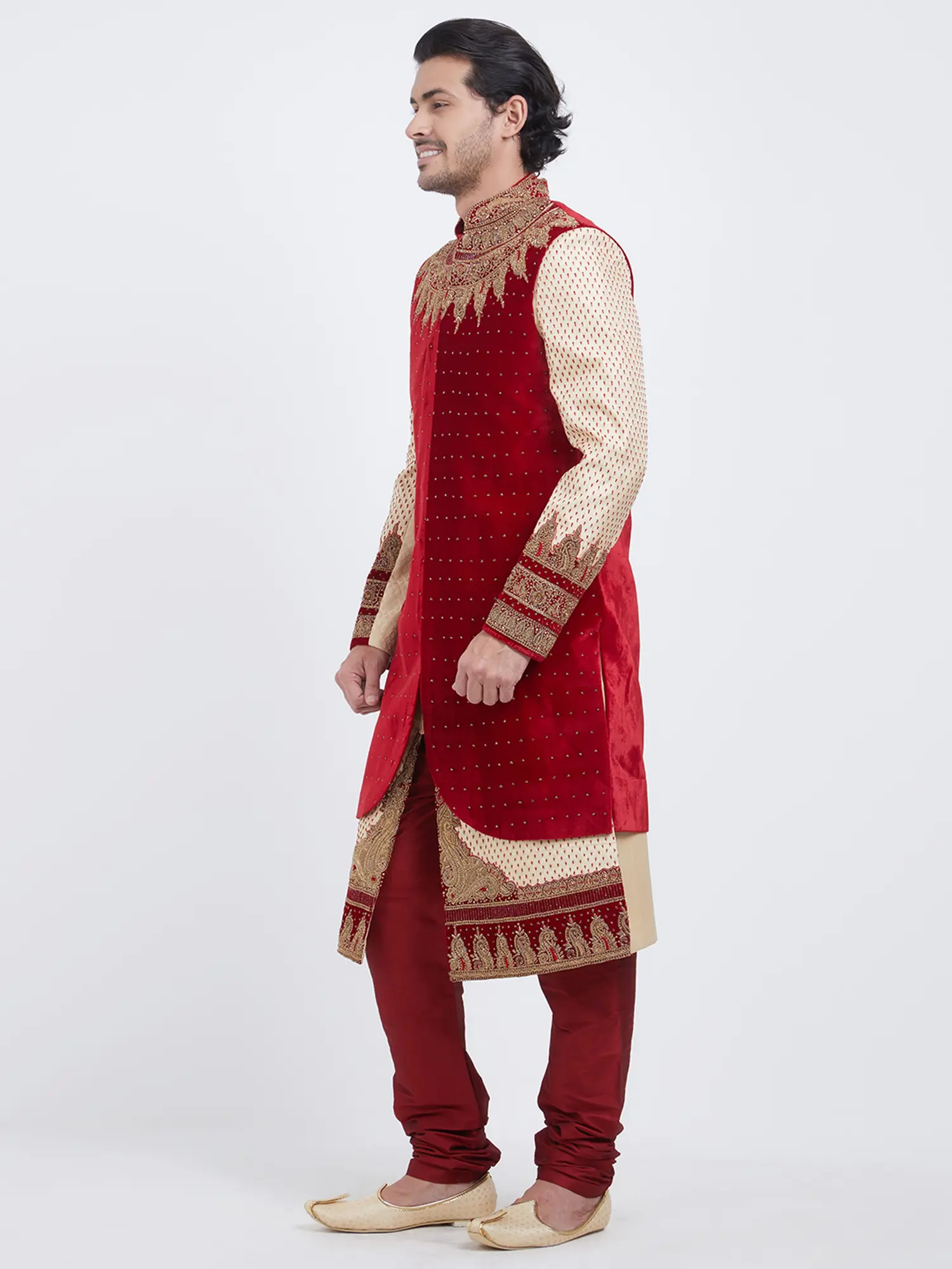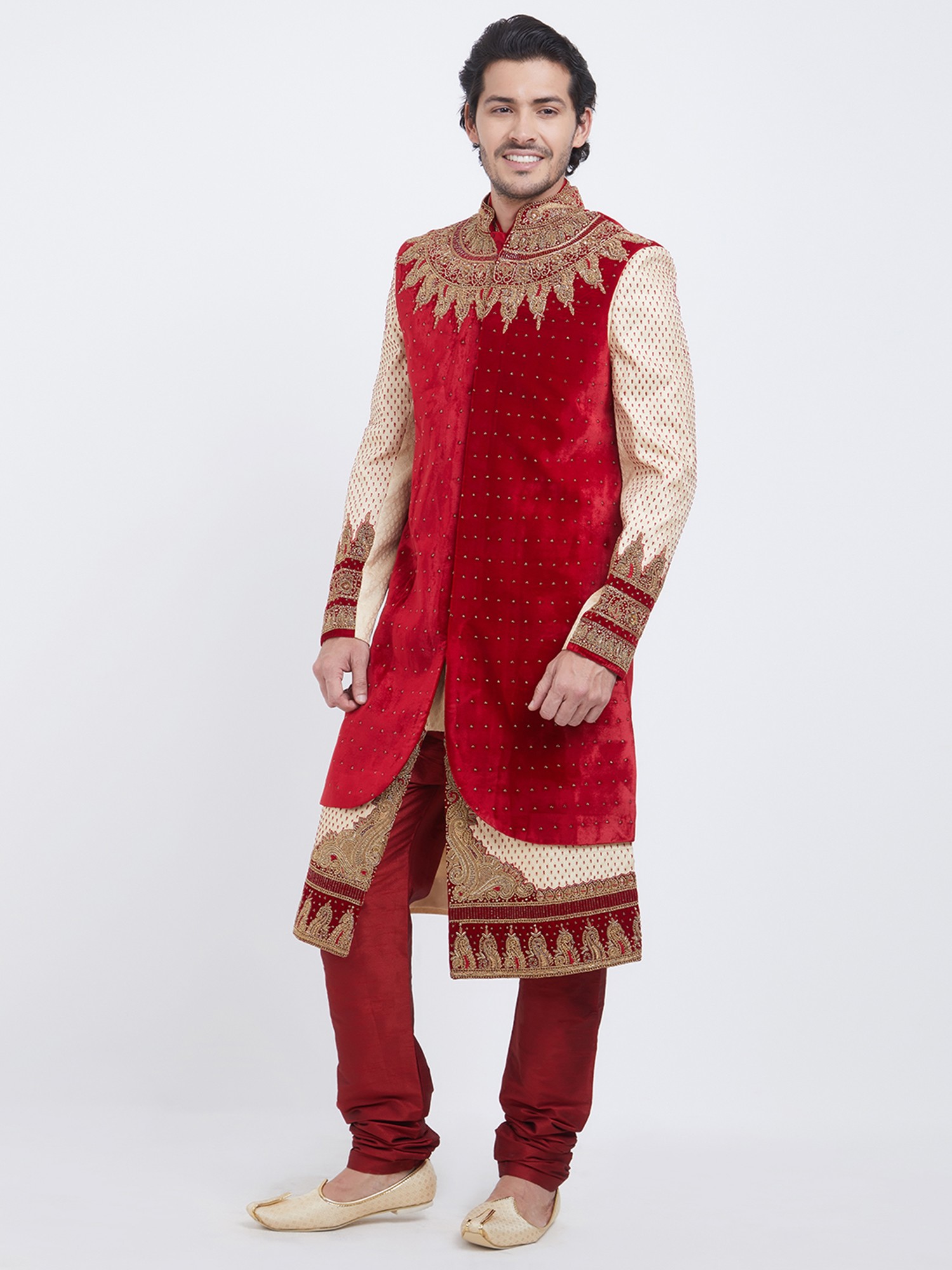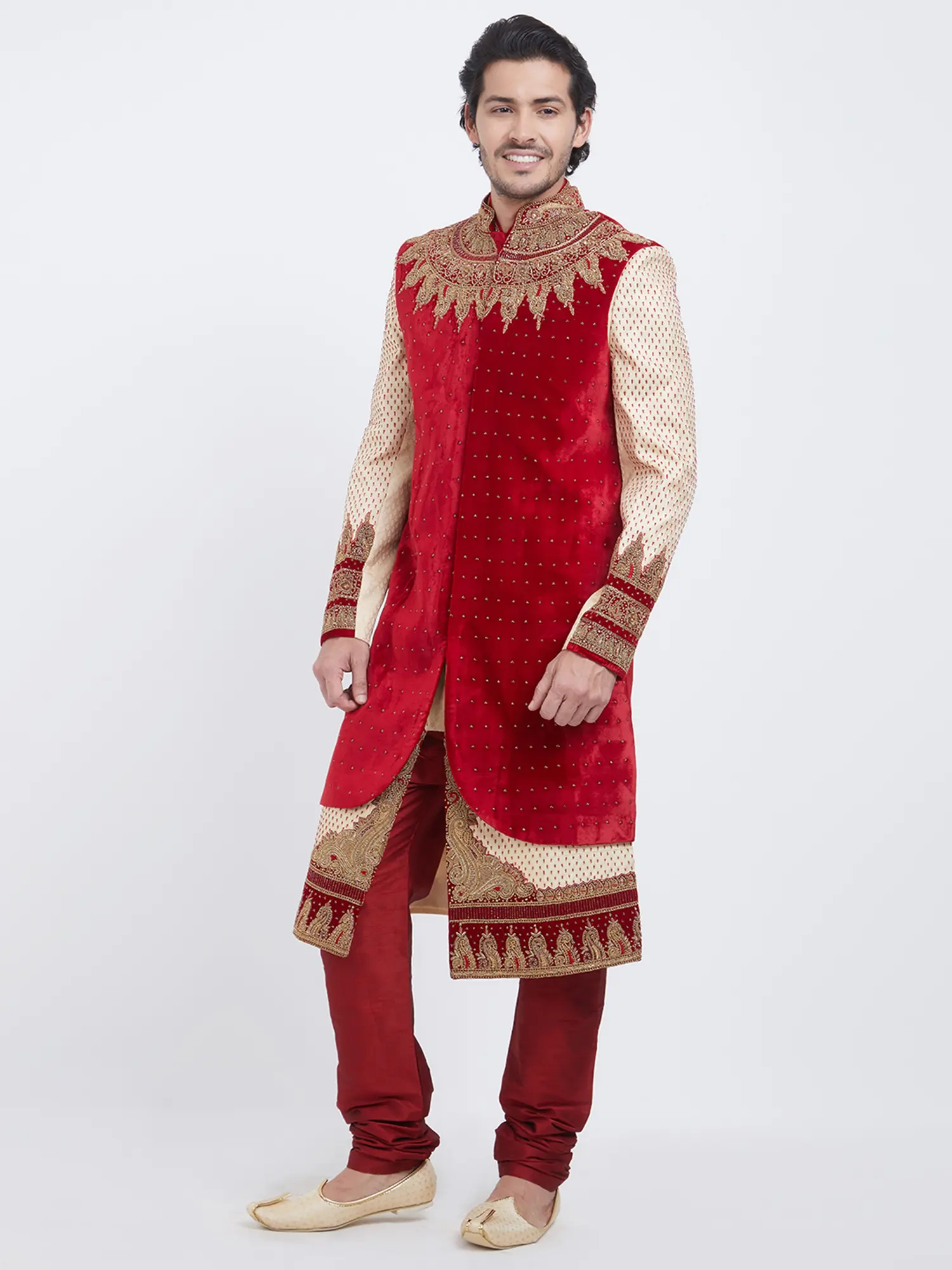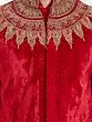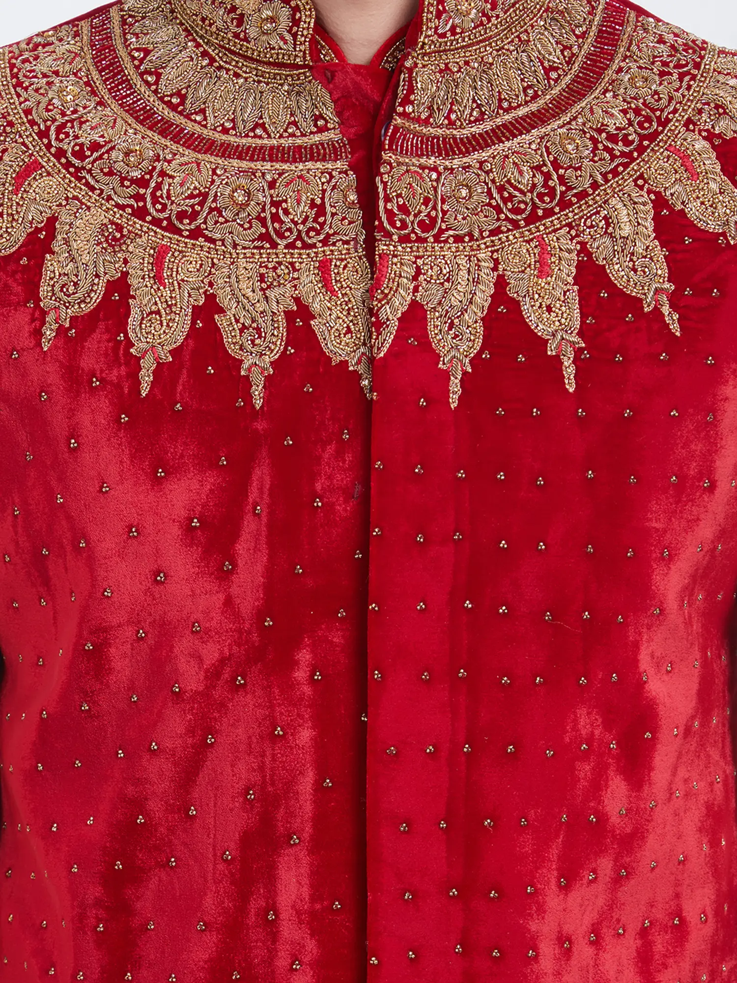 Features intricate golden embroidery on a rich red velvet yoke and cuffs.