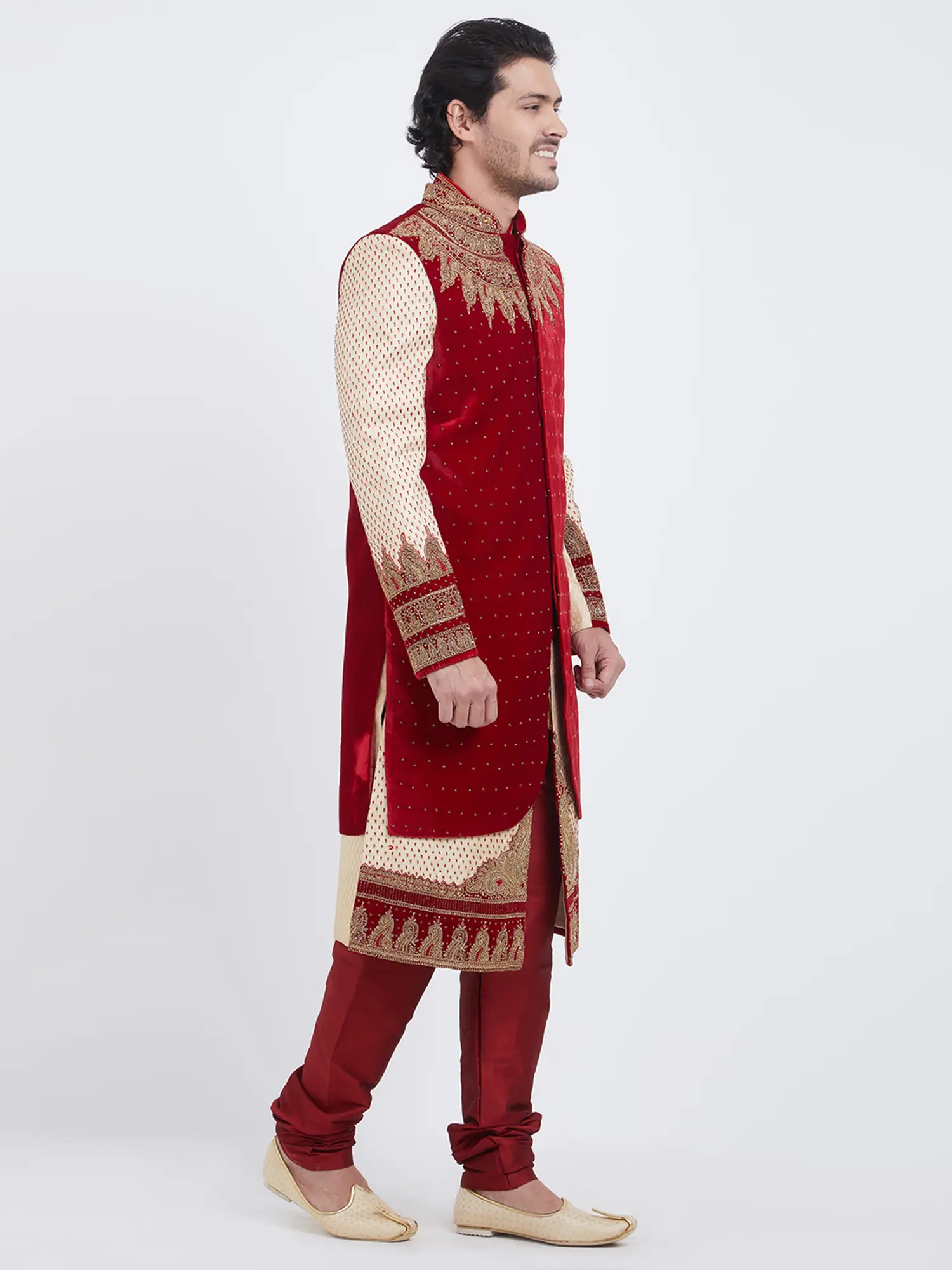 The sherwani is adorned with metallic embellishments that catch the light.