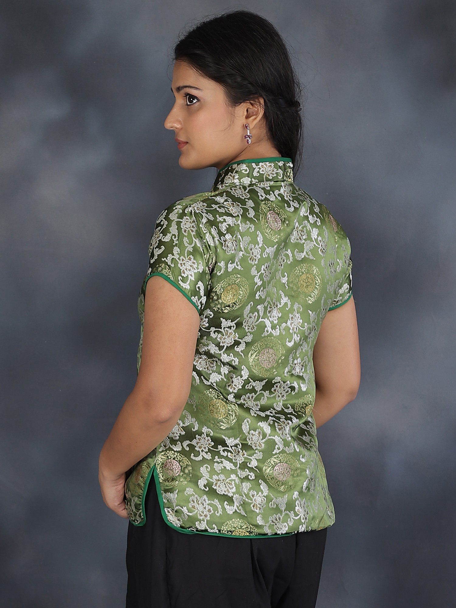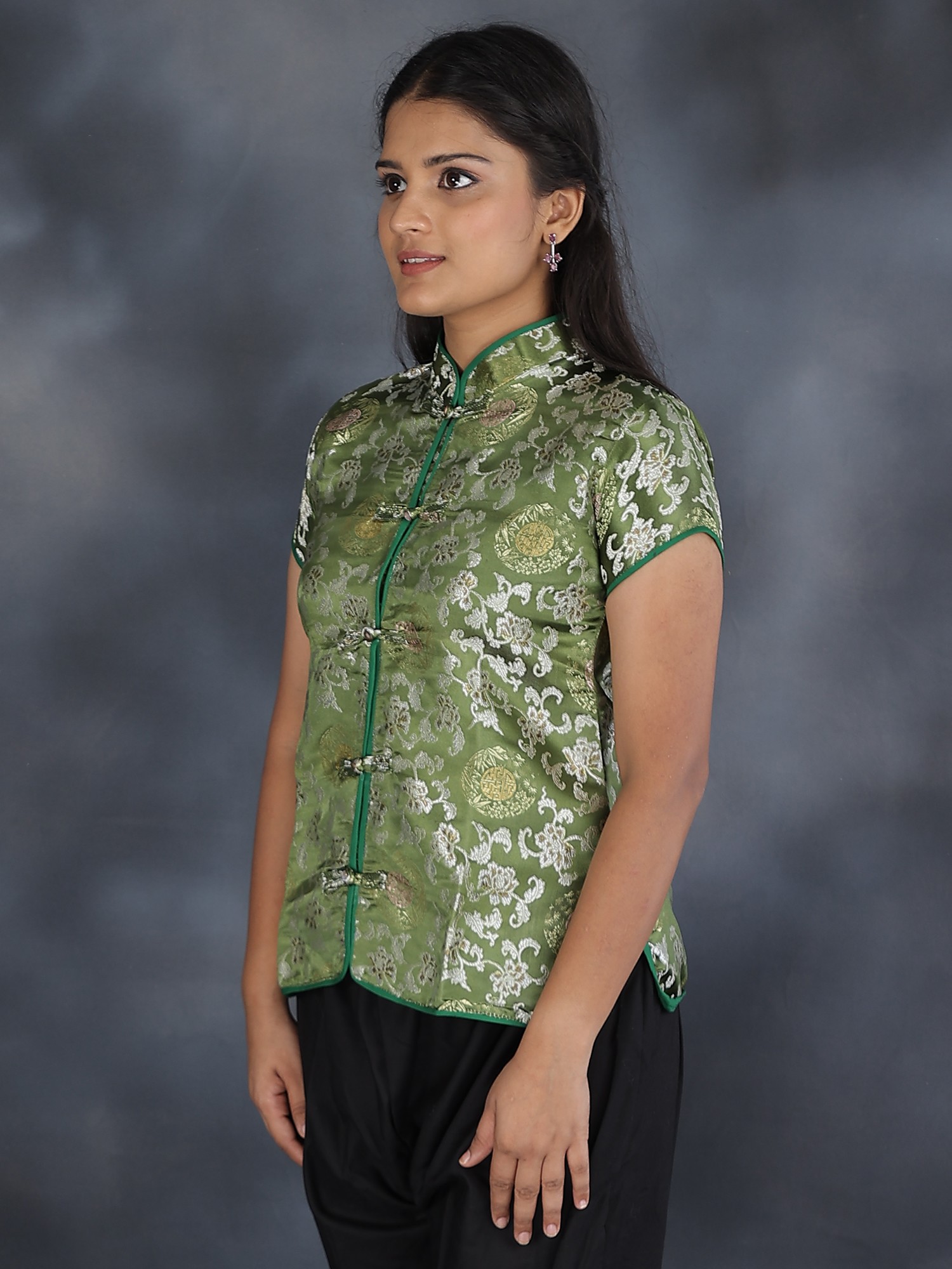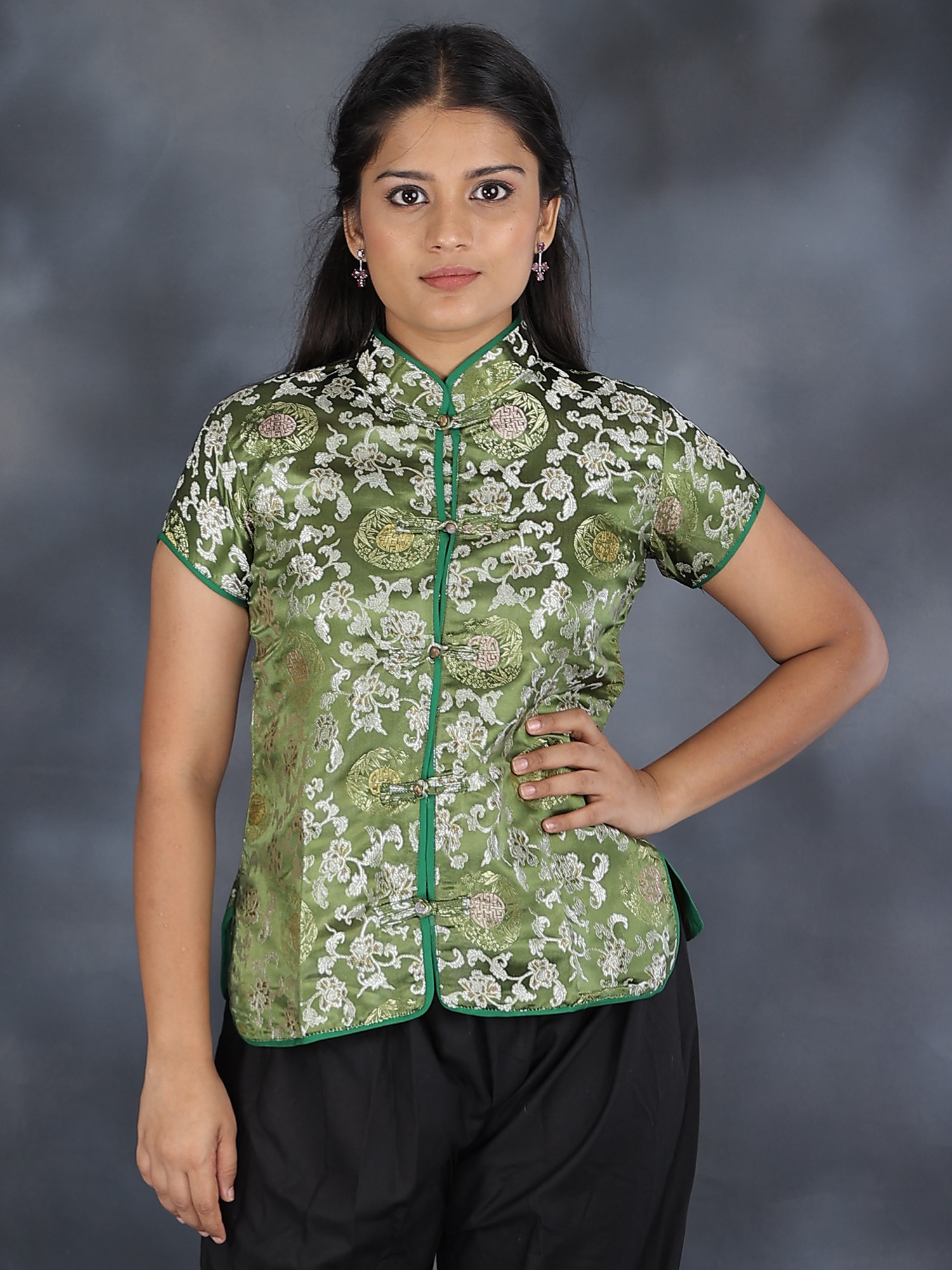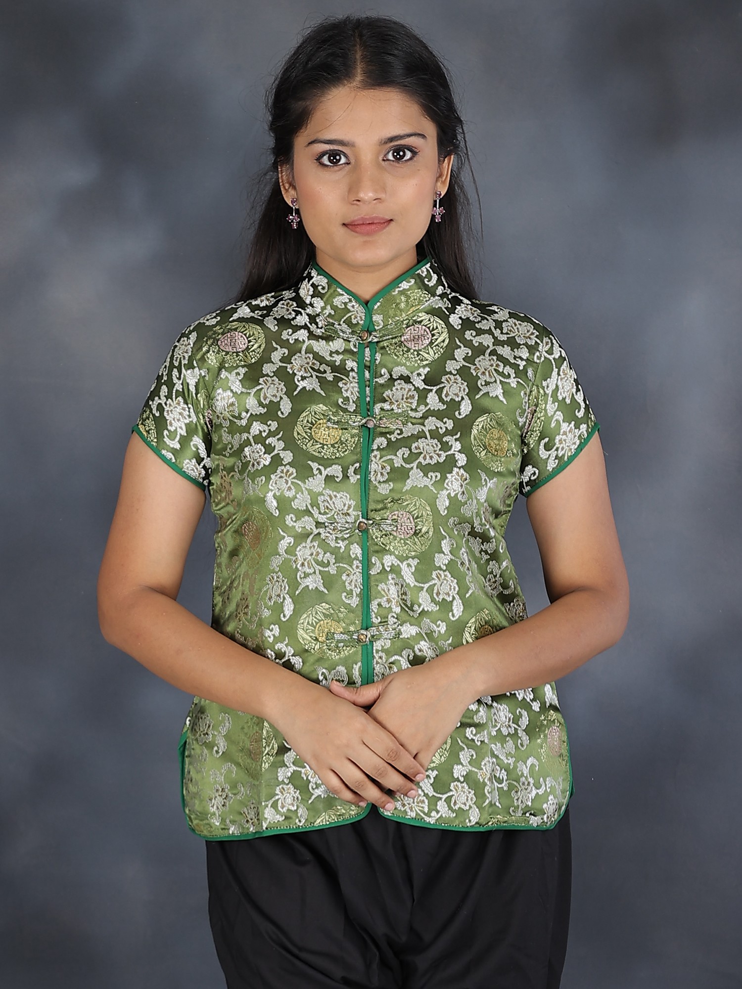 Inspired by the gorgeously fitted Chinese gown of Cheongsam, this brocaded jacket from Sikkim offers you a graceful and trimmed appeal. The art silk fabric makes the jacket a thing of regal beauty, adorned with brocade weave which is synonymous in Indian culture and world with an elite fashion. Available in fashionable variants, this Cheongsam jacket is a charming way to appear effortlessly classy.