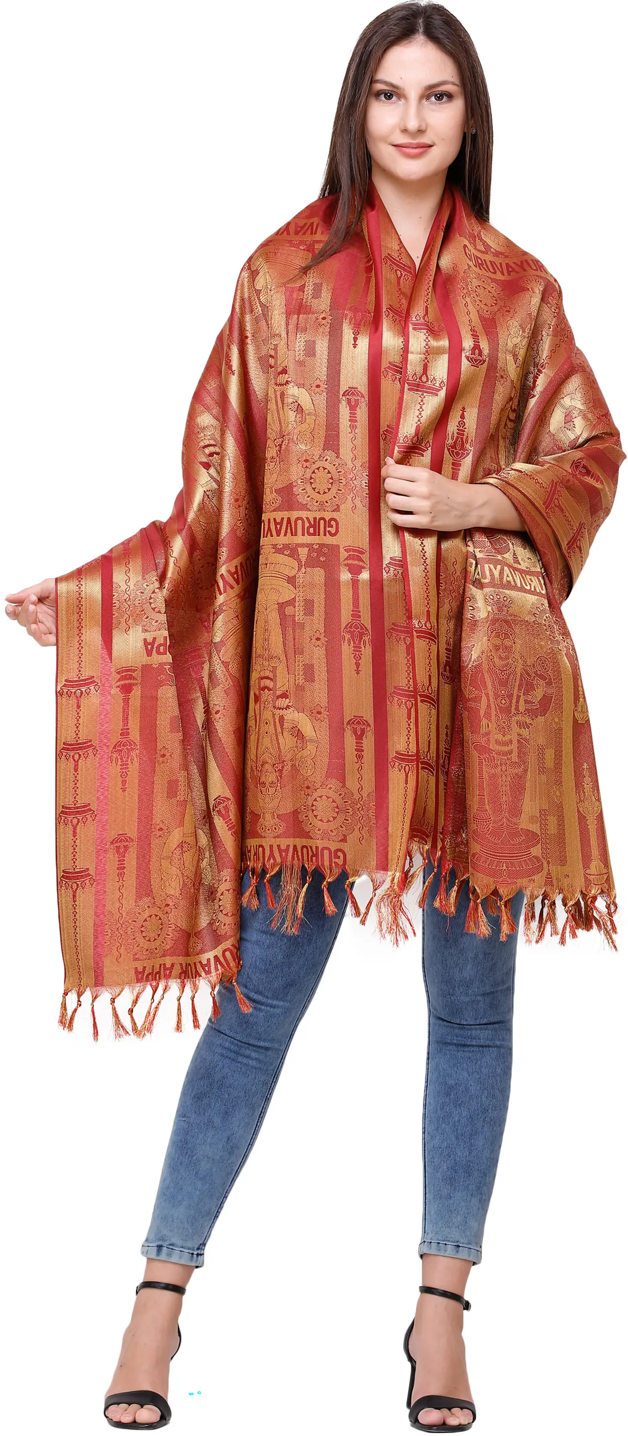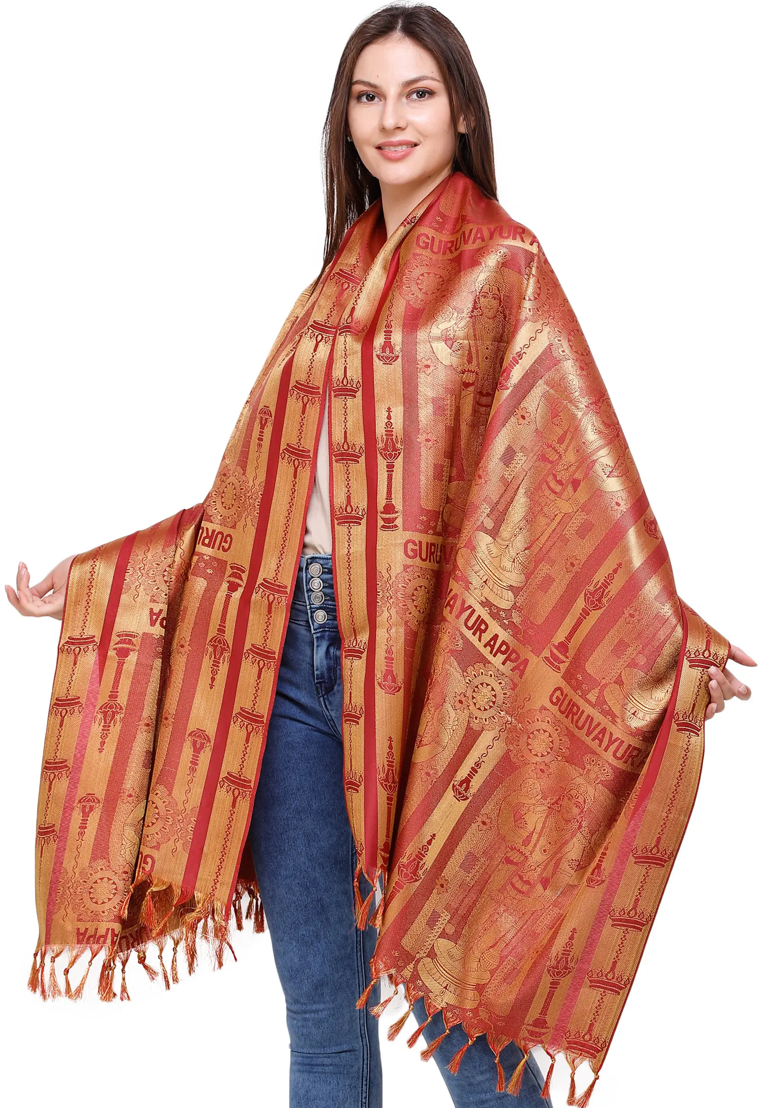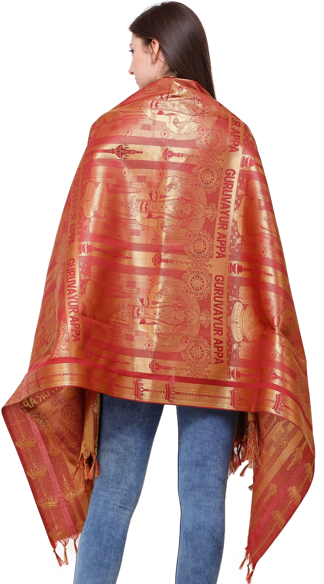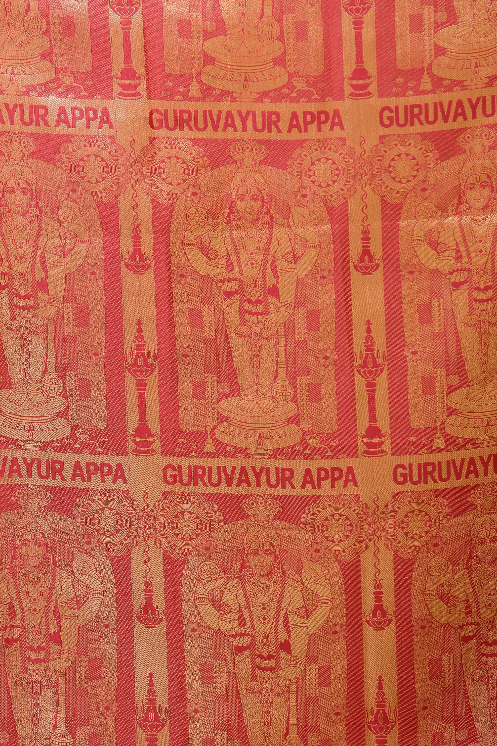 This captivating brocaded “Guruvayur Appa Prayer Shawl” from Tamil Nadu is a magnificent blend of tradition and artistry. This magnificent shawl, made of rich art silk, honours Guruvayur Appan, a heavenly avatar of Vishnu revered in Kerala. Ideal for prayer or meditation, the elaborate brocade pattern captures the spiritual essence of “Guruvayur Unnikkannan,” Krishna’s infant form.