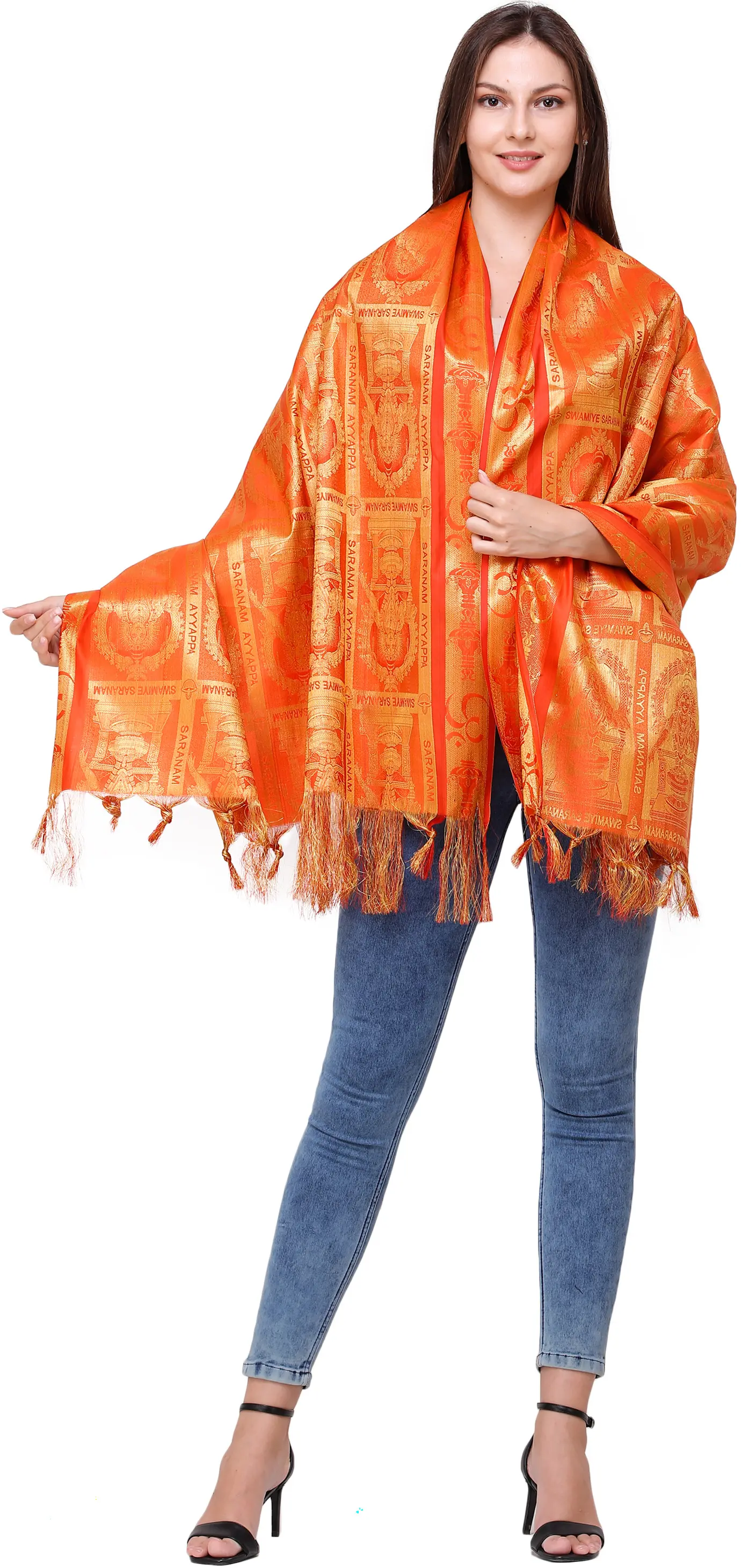 Measuring 5.6 feet in length and 3.0 feet in width, this prayer shawl offers ample coverage, allowing you to drape it comfortably around your shoulders or use it as a sacred covering during your puja or meditation sessions. The soft art silk fabric drapes beautifully, adding an element of grace to your devotional attire. Whether you are attending temple services, performing rituals at home, or seeking a moment of quiet contemplation, this shawl provides a sense of comfort, reverence, and spiritual focus. The fringes at the ends add a traditional touch and a subtle movement as you move. This shawl is also a thoughtful gift for loved ones who hold Lord Ayyappan in high regard, offering them a tangible symbol of their faith and a piece of devotional art.