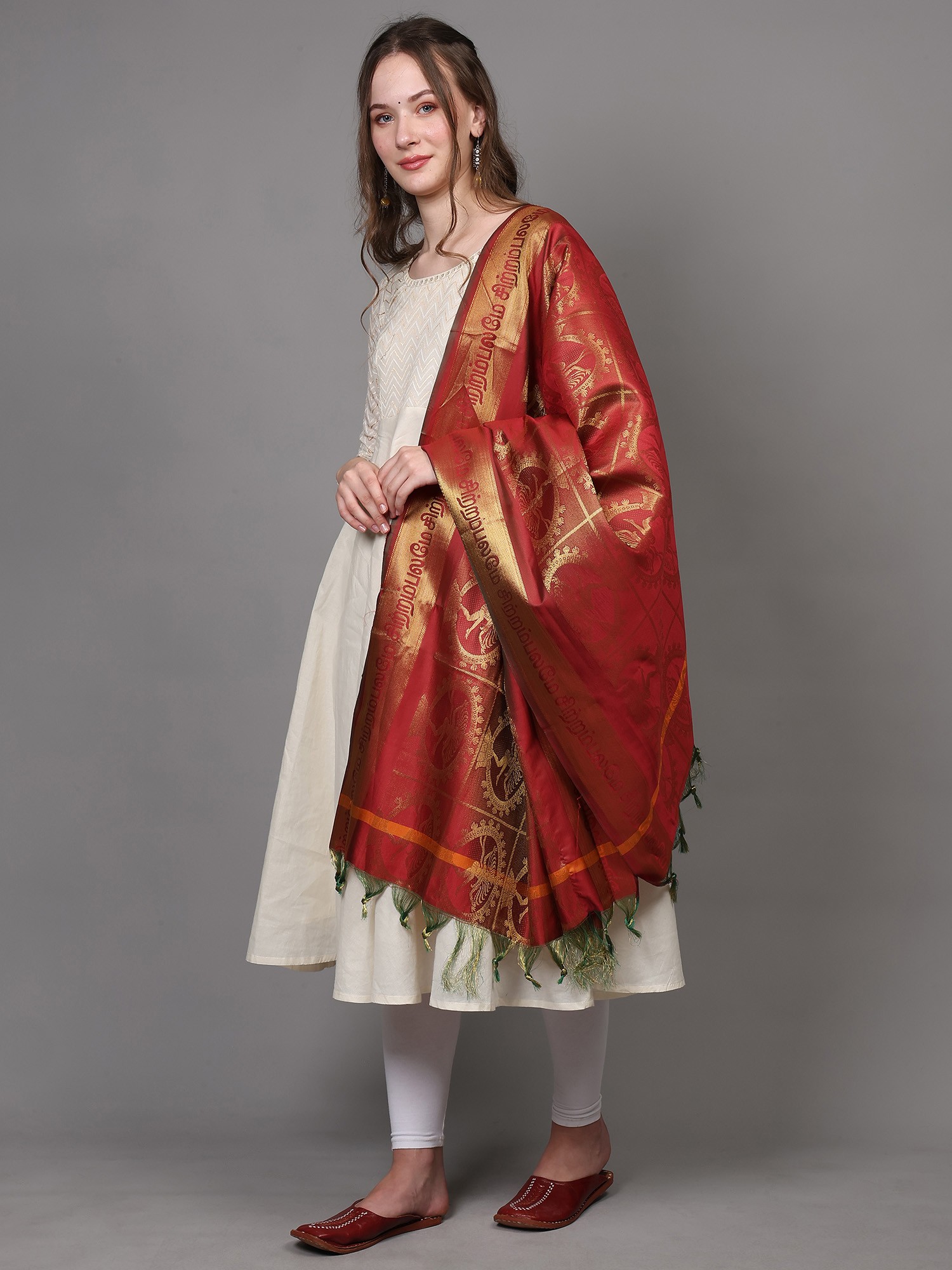 This piece is not just a garment; it is a versatile accessory that can enhance your personal style. Drape it over your shoulders for a touch of warmth and sophistication on cool evenings. Wrap it around your neck as a chic scarf to add a pop of color to your everyday attire. Use it as a head covering for a touch of modest grace. Whether you are dressing up for a special occasion or simply adding a touch of elegance to your daily routine, this shawl is sure to become a cherished part of your wardrobe. At 60 inches long and 35 inches wide, it offers ample coverage and styling options. This shawl invites you to experience the beauty and grace of Tamil Nadu's rich textile heritage.