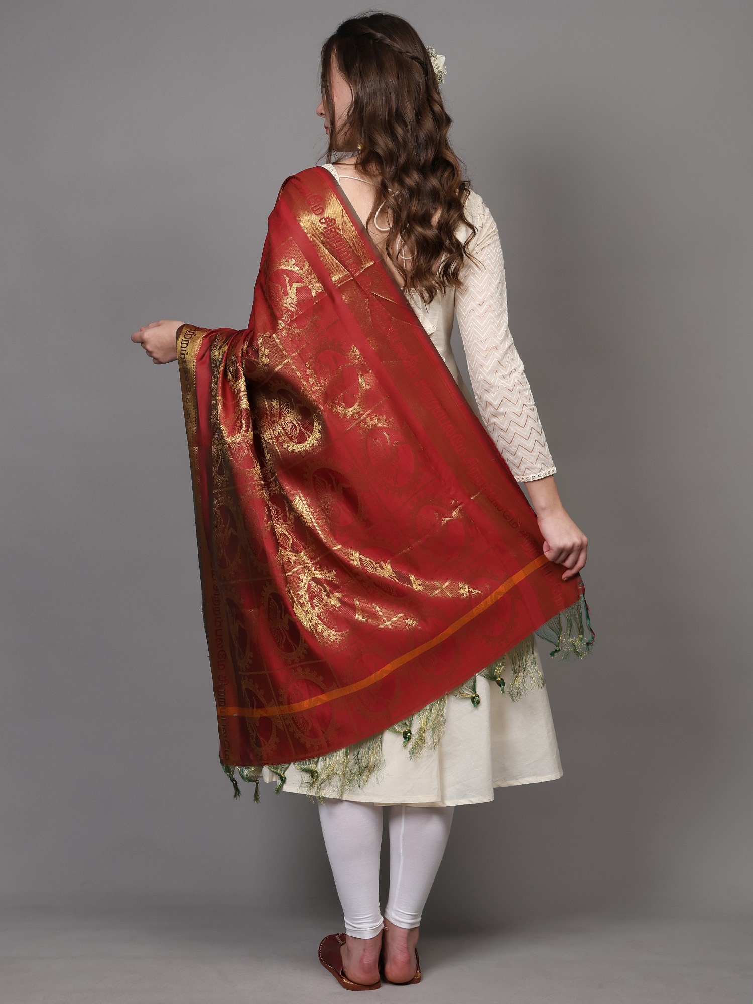 Wrap yourself in the essence of South India with this exquisite shawl. Woven from fine art silk, this piece showcases the rich artistic heritage of Tamil Nadu. The delicate sheen of the fabric lends a subtle luxury, making it perfect for adding a touch of elegance to any outfit. The lightweight feel of the art silk ensures comfort and ease of wear, allowing it to drape beautifully whether worn as a shawl, scarf, or head covering.