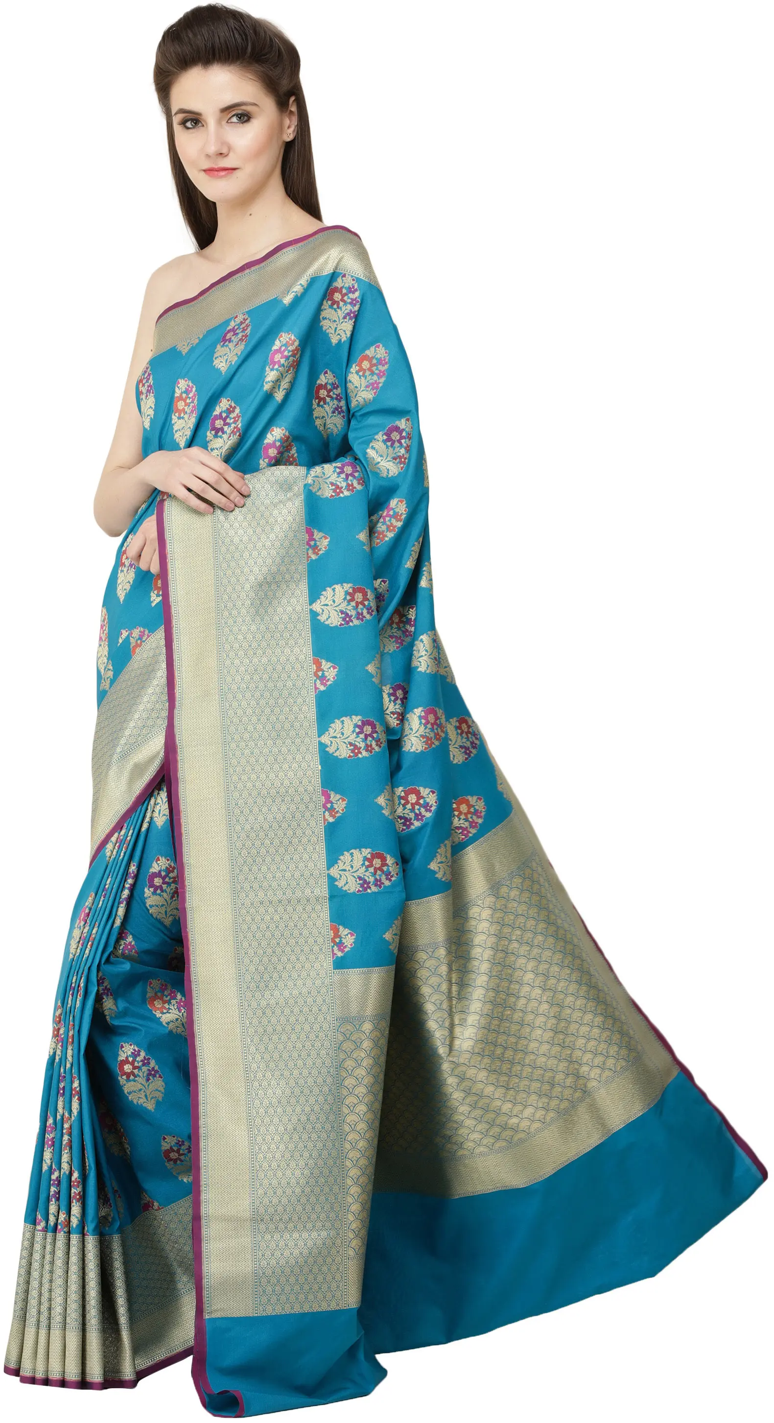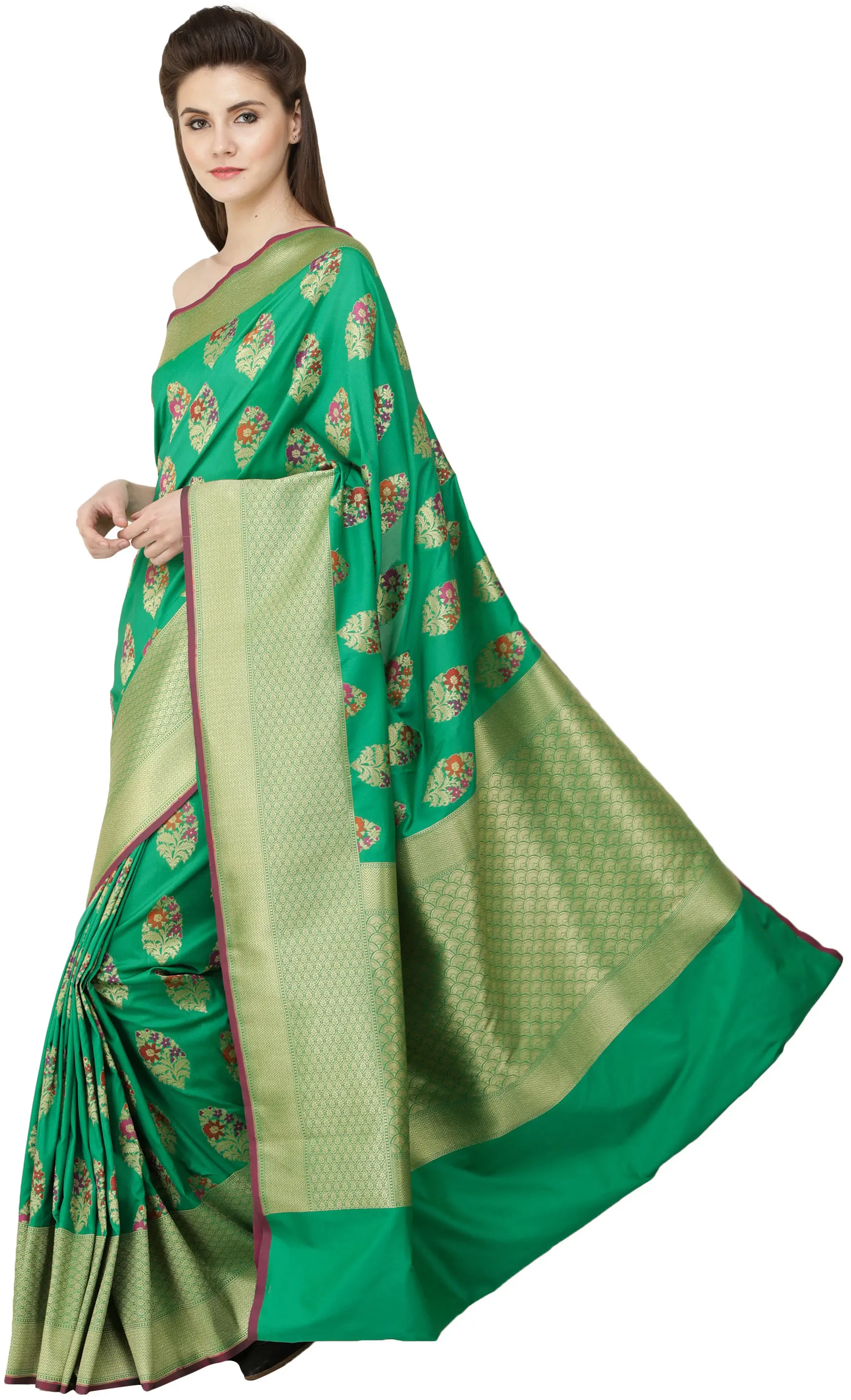 This is one saree that would ensure the eyes of onlookers are glued to you all evening. The border of gorgeous gold zari becomes thicker along the pleats as it nears the endpiece and emerges into the signature endpiece. The superfine embroidery is such as to look against the wide variety of colour variations this ensemble comes in. What sets this saree apart from the rest of the Bangalore brocades in our collection are the complex booties across the field - a closed-in gathering of gold foliage featuring a bunch of pastel-coloured petals in each booti. Paired carefully with the jewellery, this saree would turn you into the life of the party.