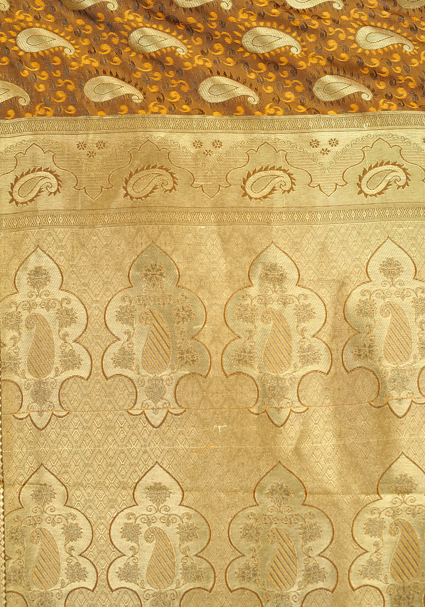 Step into a world of refined beauty with this exquisite bronze-brown sari, a testament to the rich weaving traditions of Bangalore. Crafted from luxurious art silk, this garment drapes with an unparalleled grace, promising to make you the cynosure of any occasion. The deep, earthy tone of bronze-brown forms a sophisticated canvas, elegantly adorned with a tapestry of intricately woven paisleys. Each paisley motif, rendered in a contrasting golden hue, cascades across the fabric, creating a mesmerizing pattern that speaks of heritage and artistry. ––––––––––––––––––––