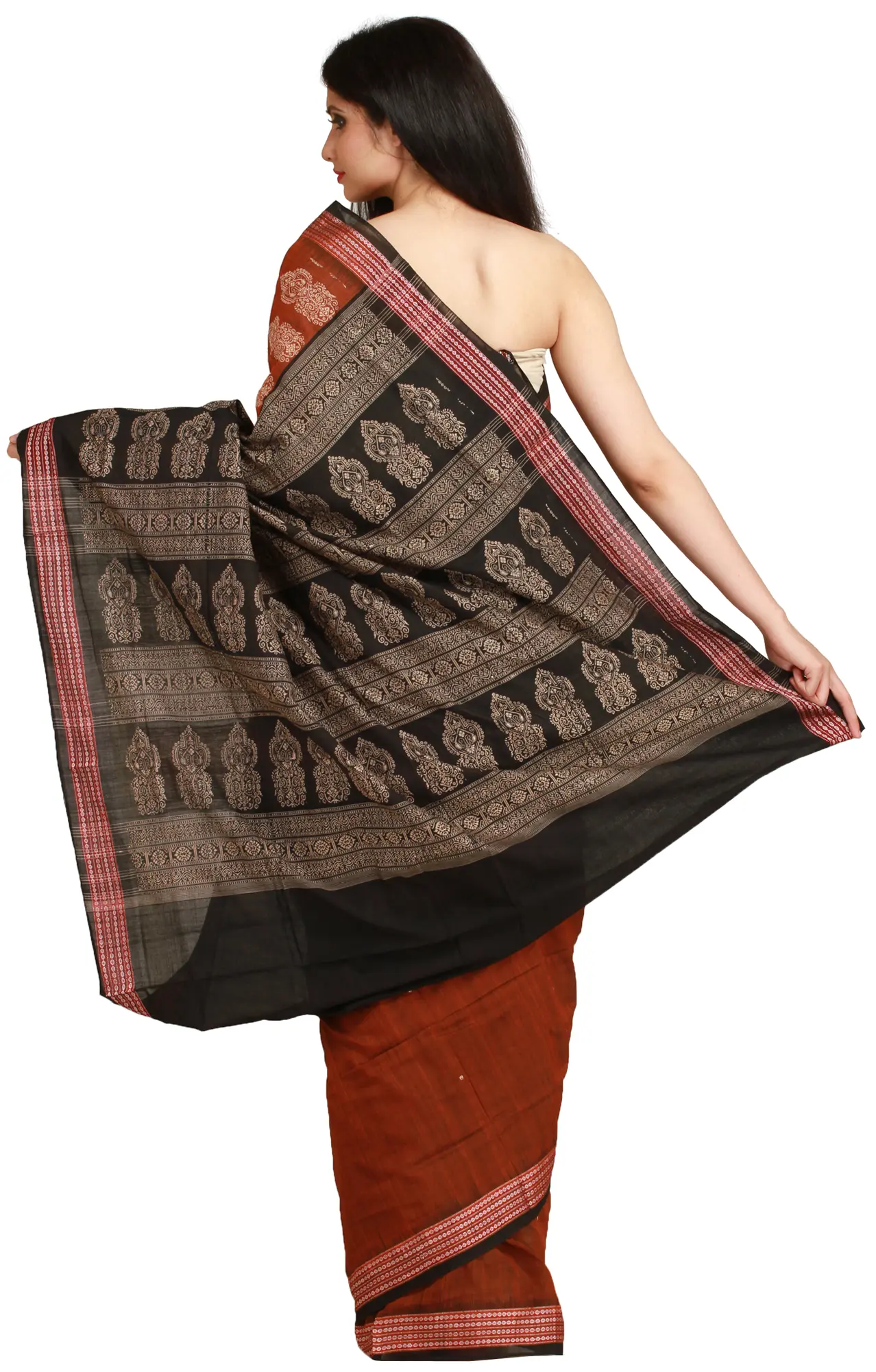 Immerse yourself in the rich heritage of Odisha with this exquisite Bomkai cotton sari. Crafted from pure, breathable cotton, this sari offers the perfect blend of comfort and timeless elegance. The striking contrast of a warm, earthy brown body against a deep black pallu creates a visually captivating piece that is sure to turn heads.