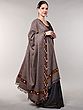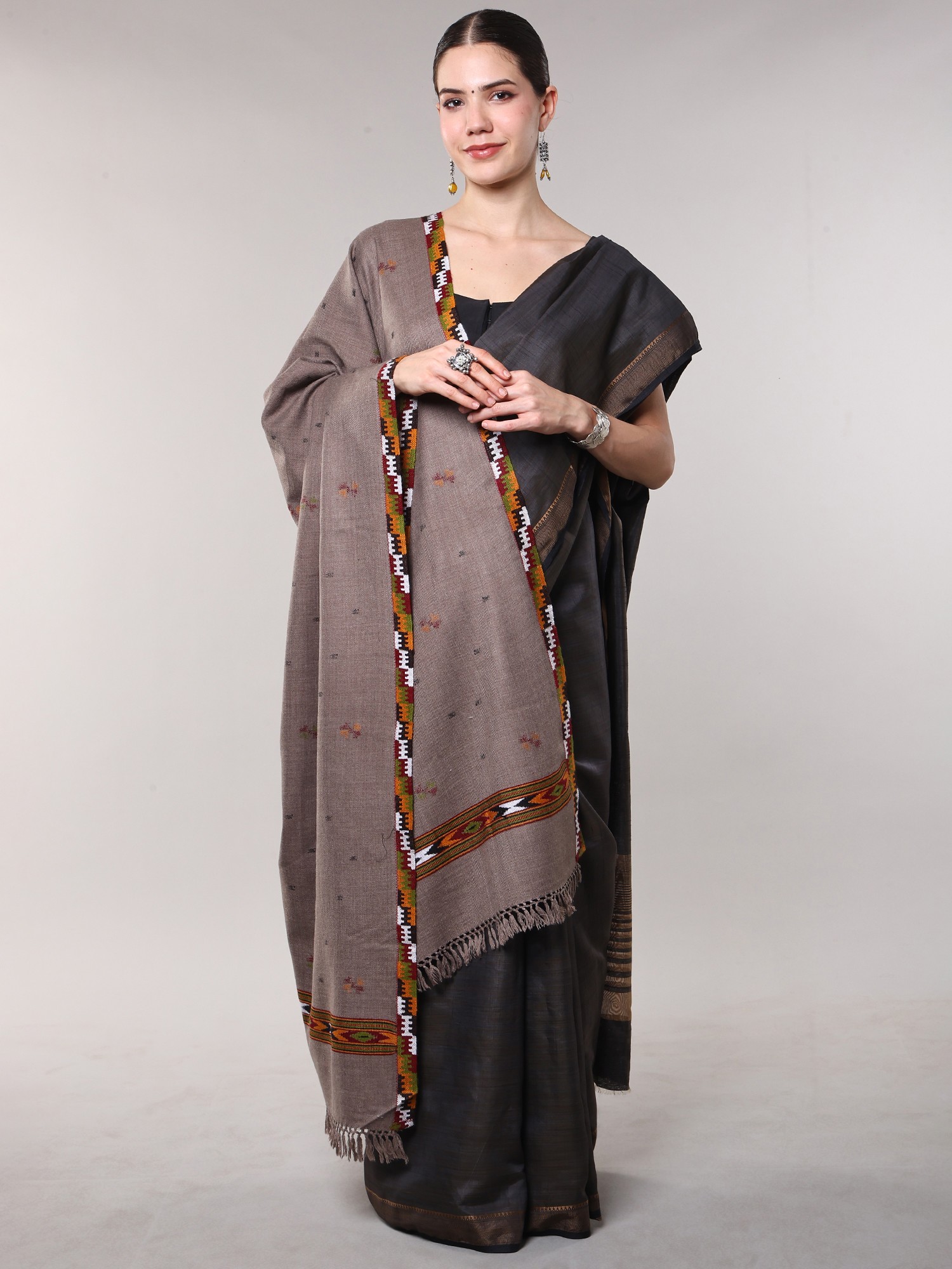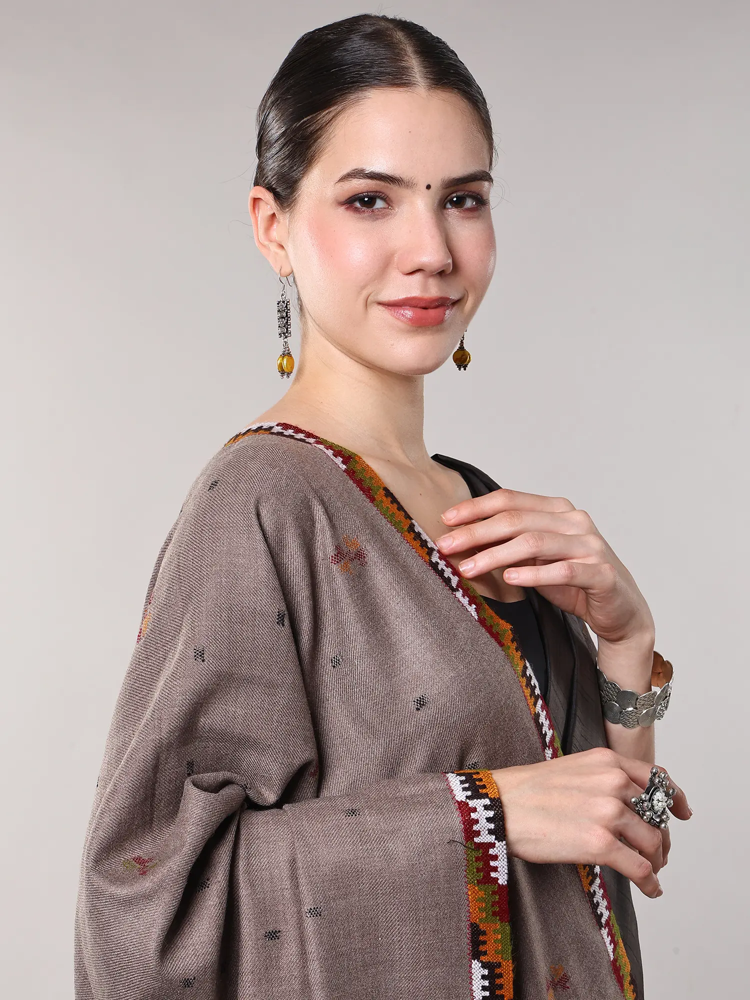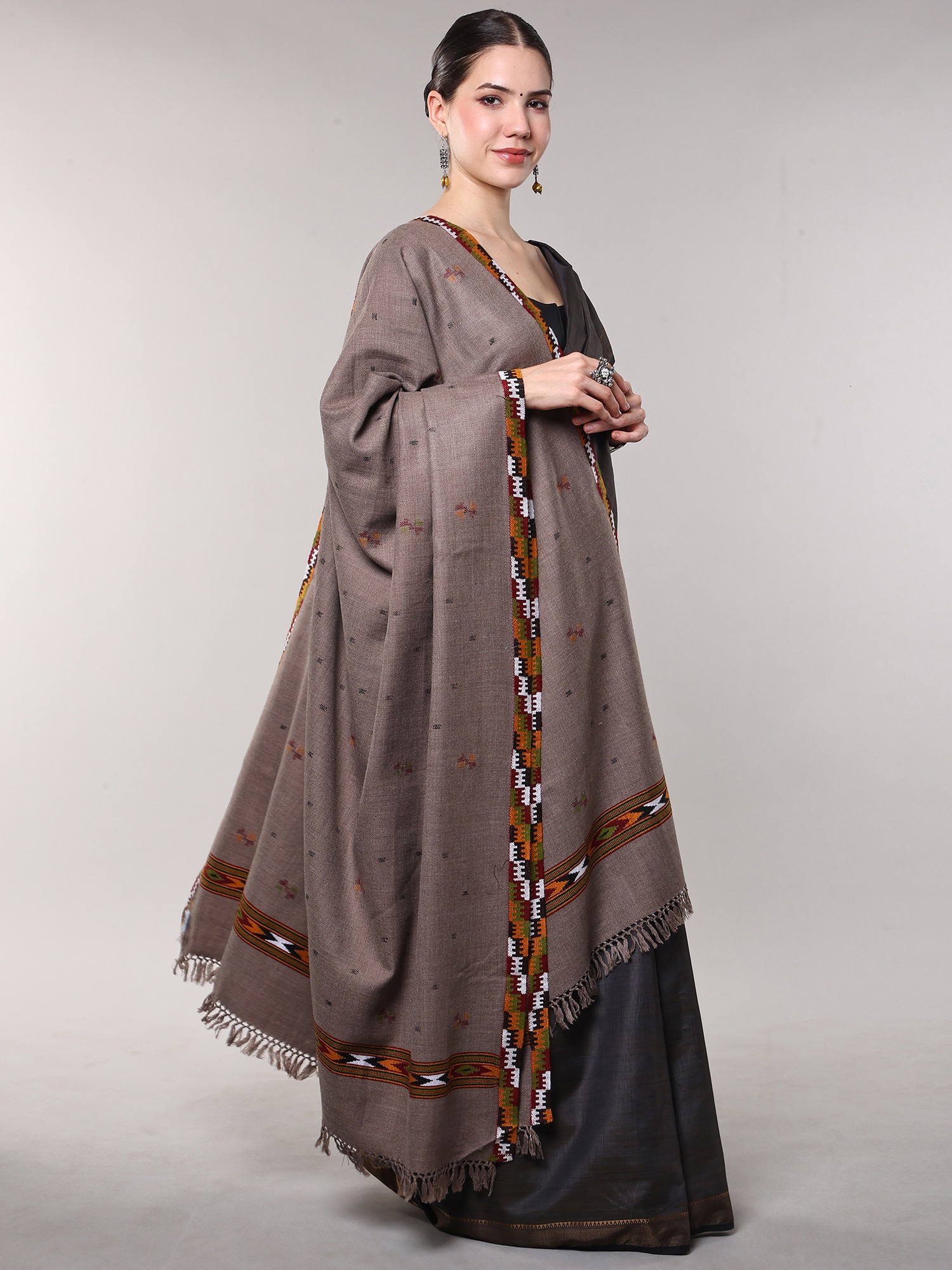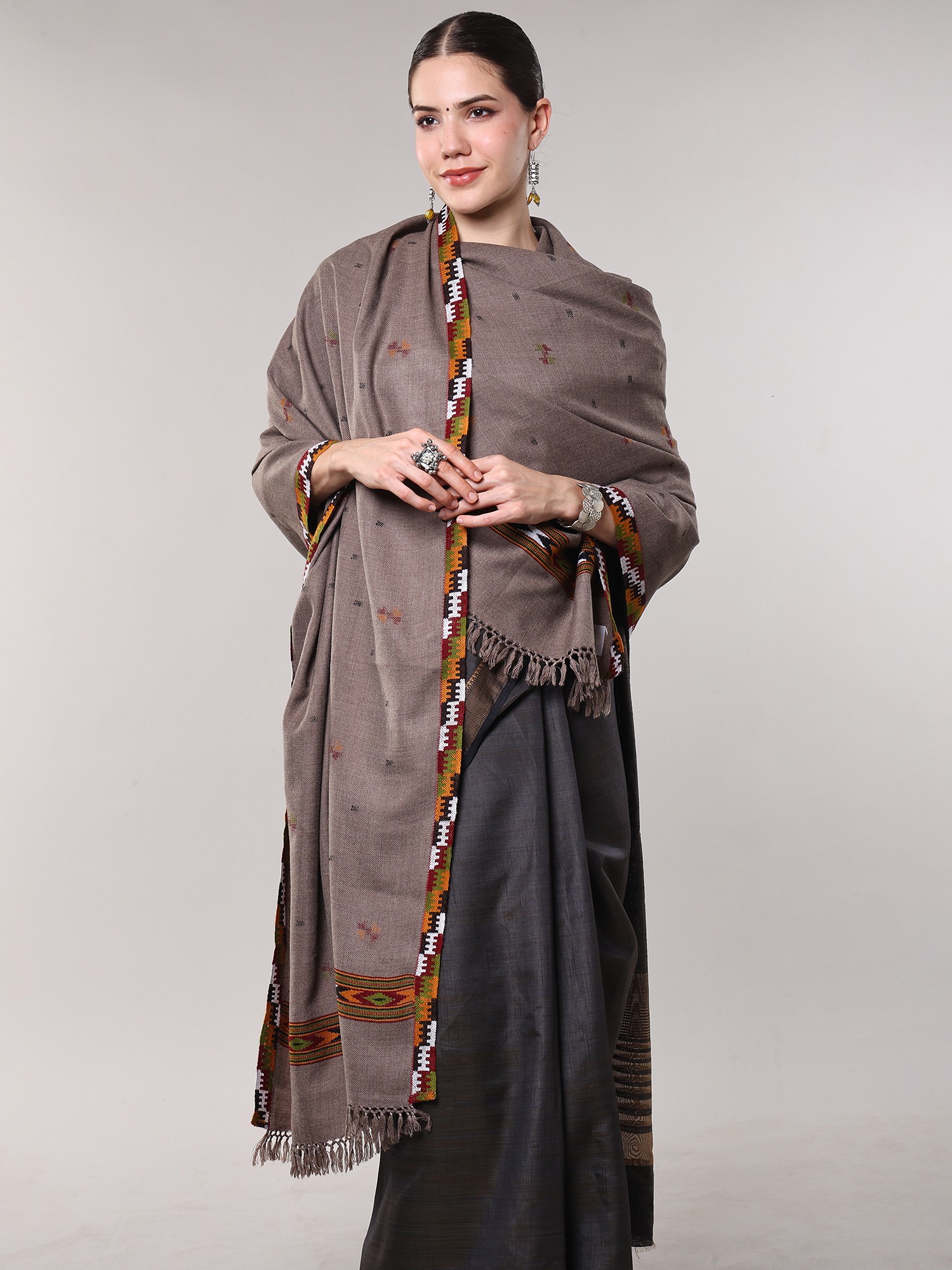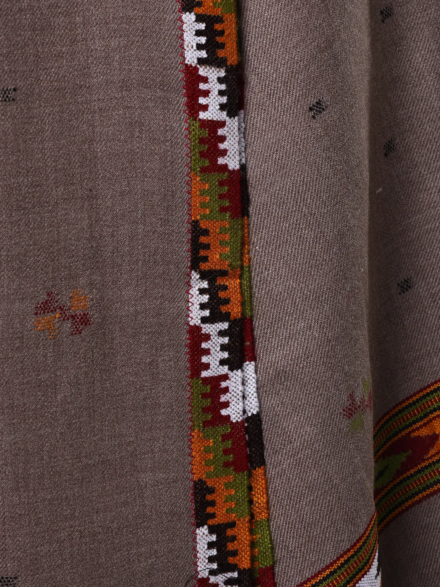 Brown-Lentil Wool Shawl from Kullu with Woven Bootis and Kinnauri Border (Unisex)