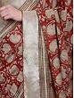 Indulge in the rich heritage and timeless elegance of this breathtaking Burnt-Brick Crepe Silk Kalamkari saree, handcrafted in Telangana, India. This saree is more than just clothing; it's a wearable work of art, a testament to the skill and artistry of traditional Indian textile craftsmanship. The vibrant burnt-brick hue forms a stunning backdrop for the intricate floral vine print, a classic motif within the Kalamkari tradition. The detail is exquisite, showcasing the meticulous hand-block printing technique that defines this iconic style. The soft, flowing crepe silk fabric drapes beautifully, creating an effortlessly graceful silhouette. The saree's subtle shimmer adds an extra touch of luxury, catching the light with every movement.