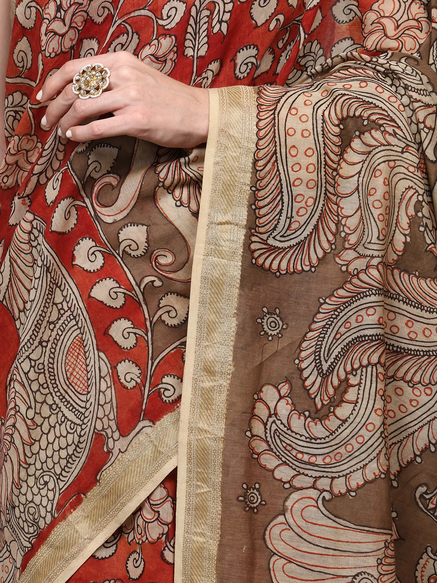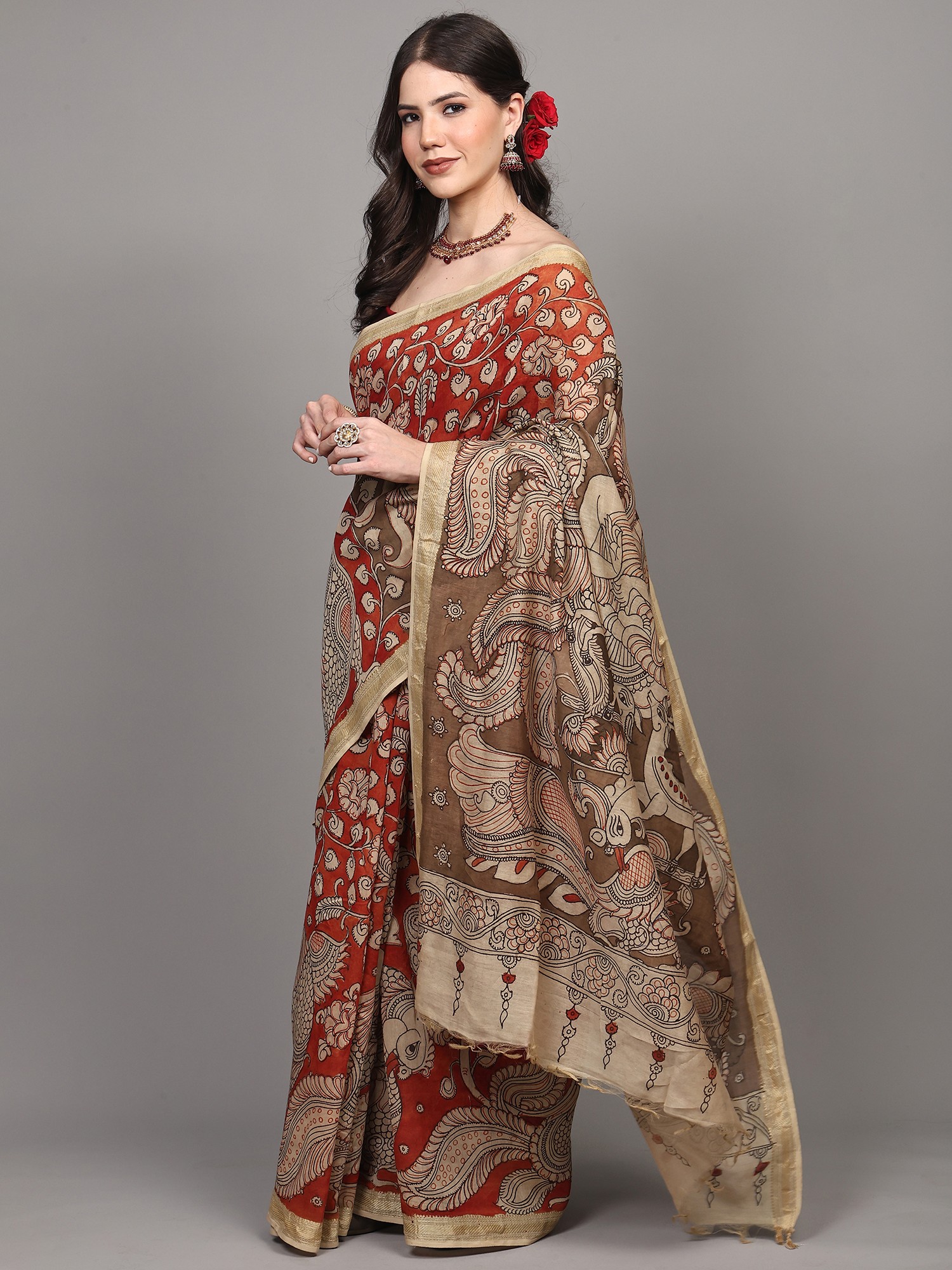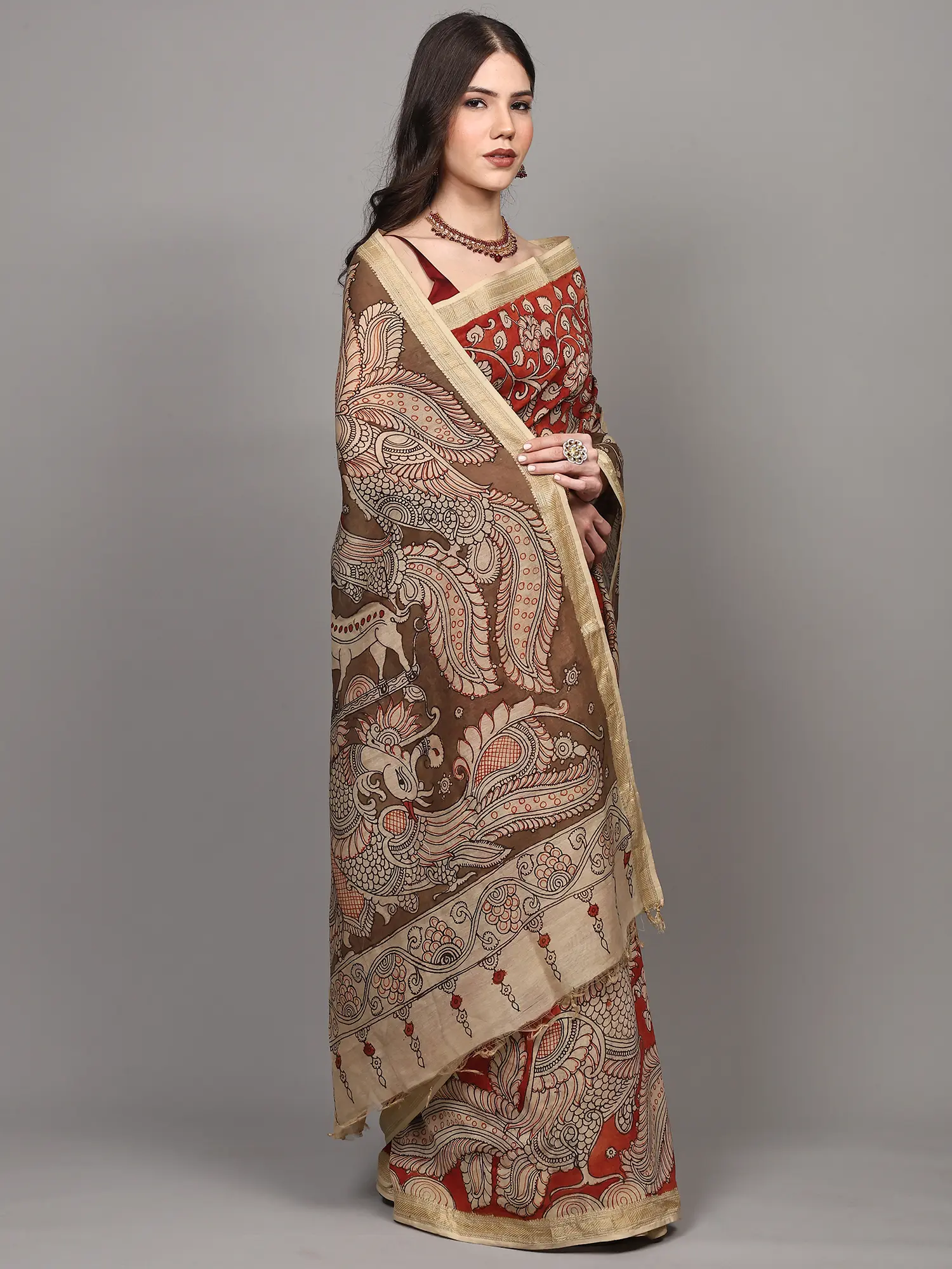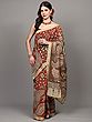 Burnt-Brick Pure Cotton Buddha with Fauna-Flora Printed Kalamkari Saree and Zari Border
