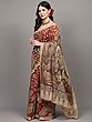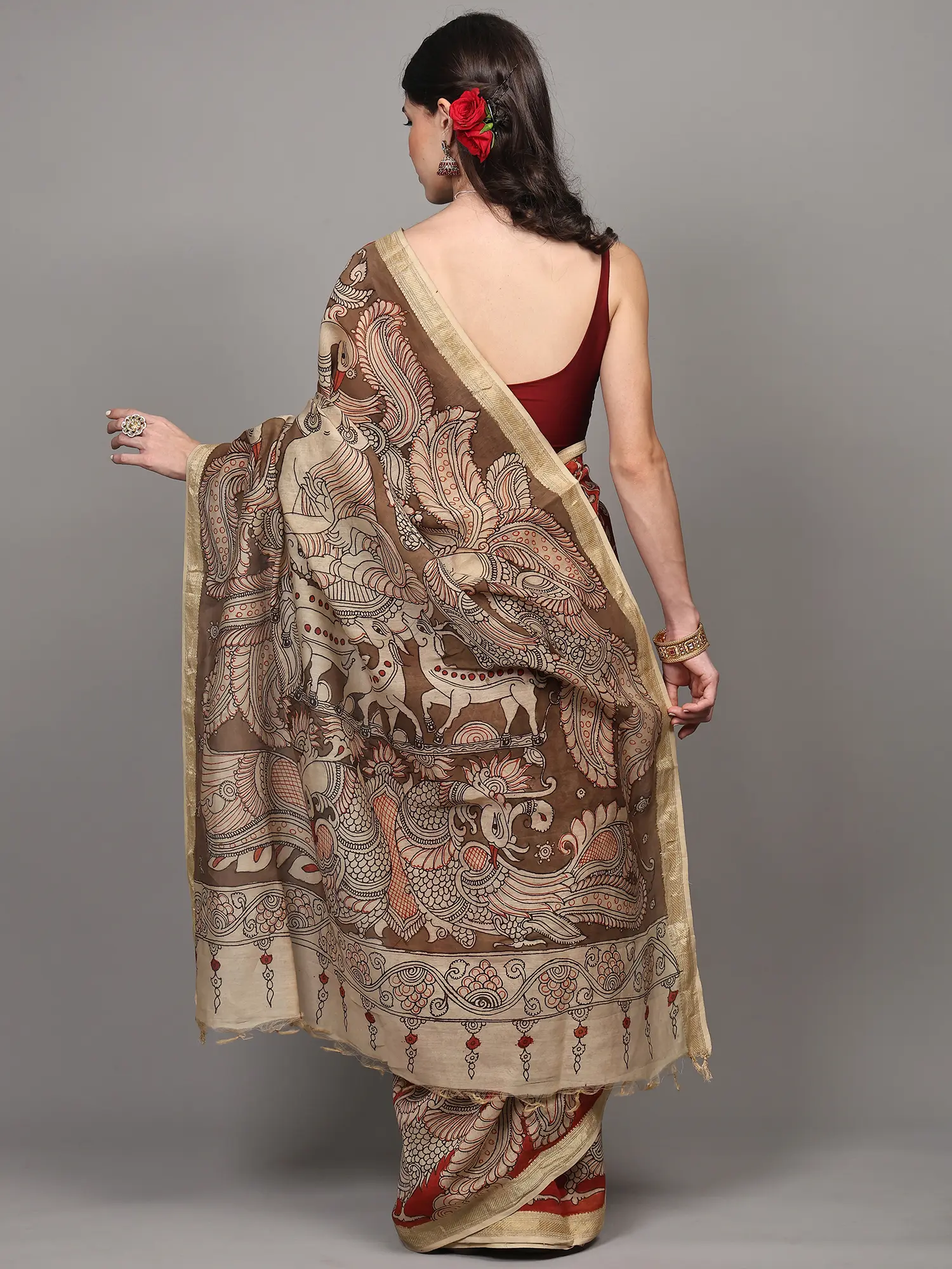 Adding a touch of understated grandeur is the shimmering zari border that elegantly frames the entirety of the saree. This golden accent provides a perfect counterpoint to the earthy tones of the print, lending a subtle opulence without overwhelming the artistic integrity of the design. The border is delicately woven, catching the light and adding a refined sheen that elevates the overall aesthetic. The pallu, adorned with a continuation of the detailed Kalamkari motifs, flows gracefully, making a statement with every movement.