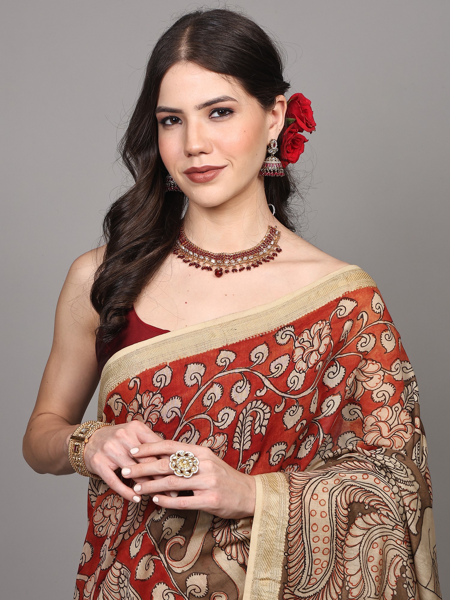 Mars-Red Kalamkari Saree with Printed Phool Bail All-Over from Telangana