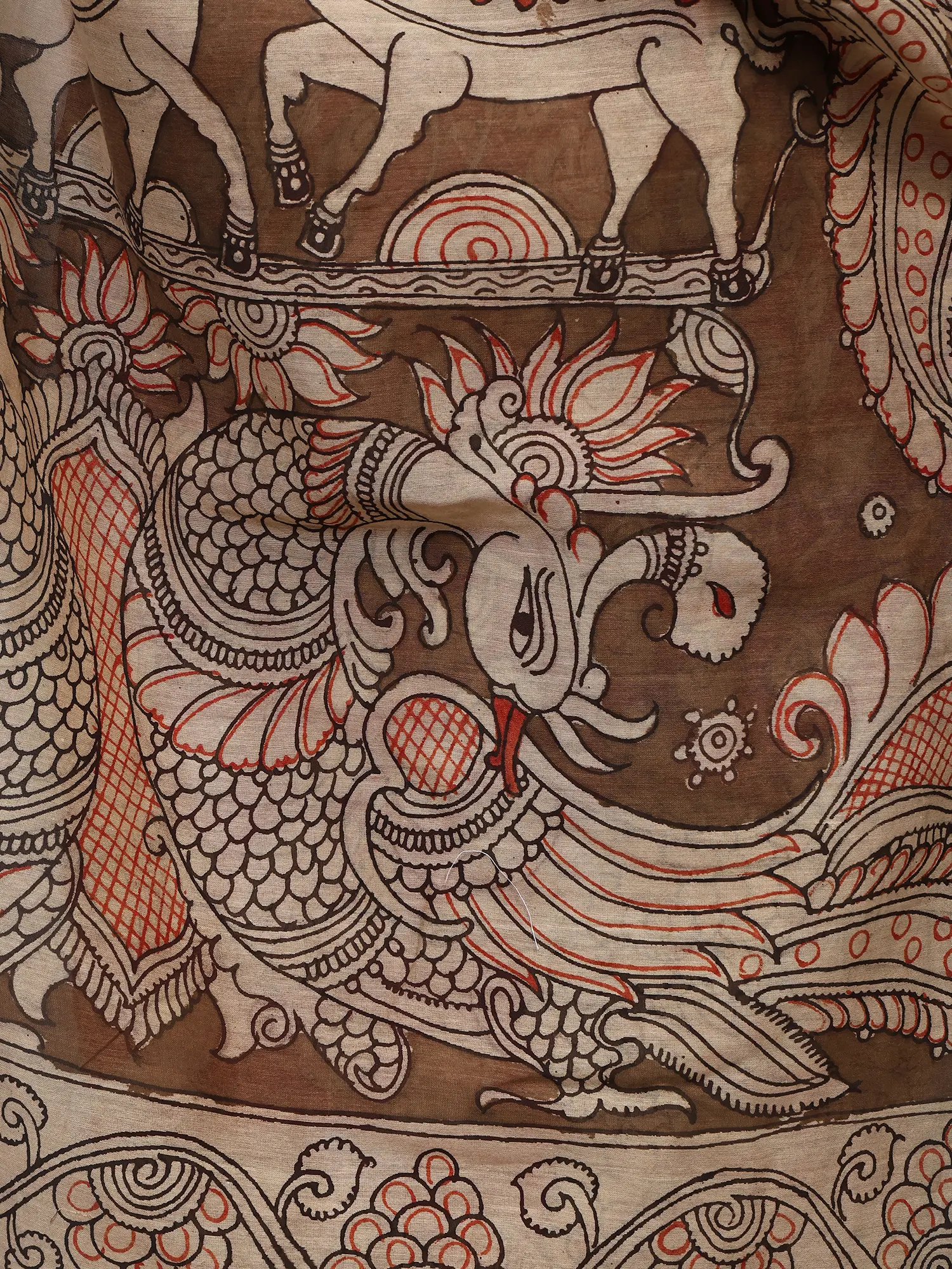 Mars-Red Pure Cotton Kalamkari Saree with Printed Nandi Ox and Peacock Pallu from Telangana