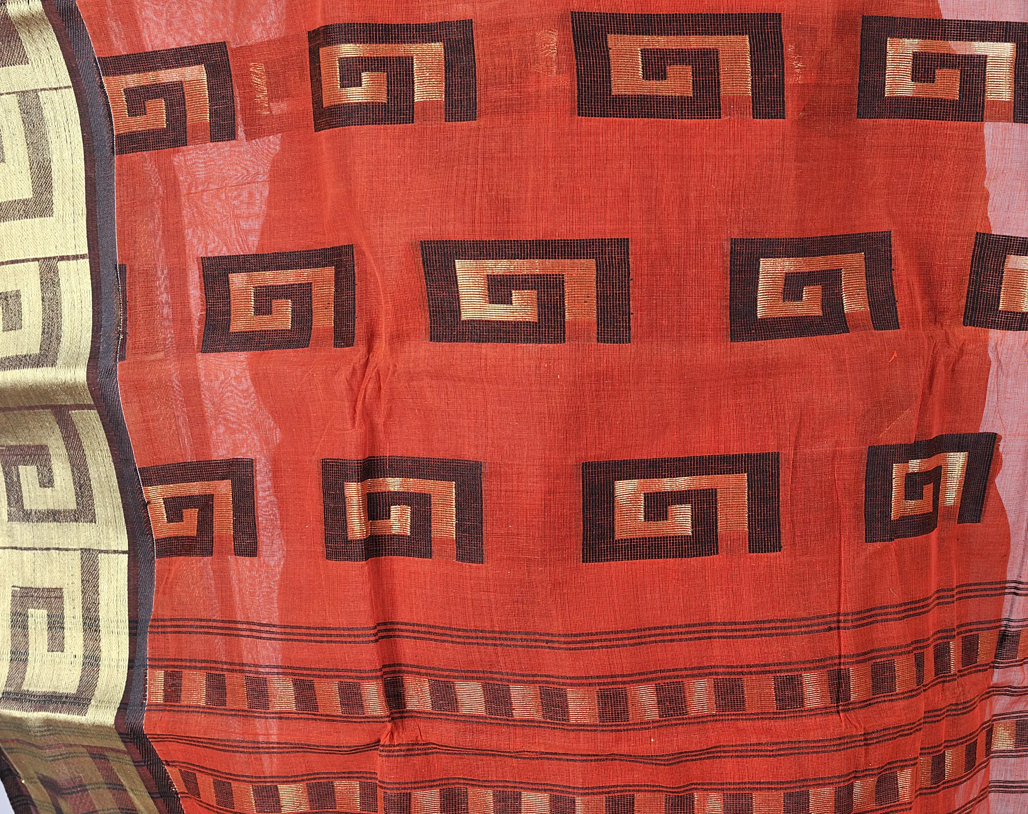 Burnt-Ochre Dhakai Sari from Kolkatta with Golden Thread Weave and Geometric Spirals