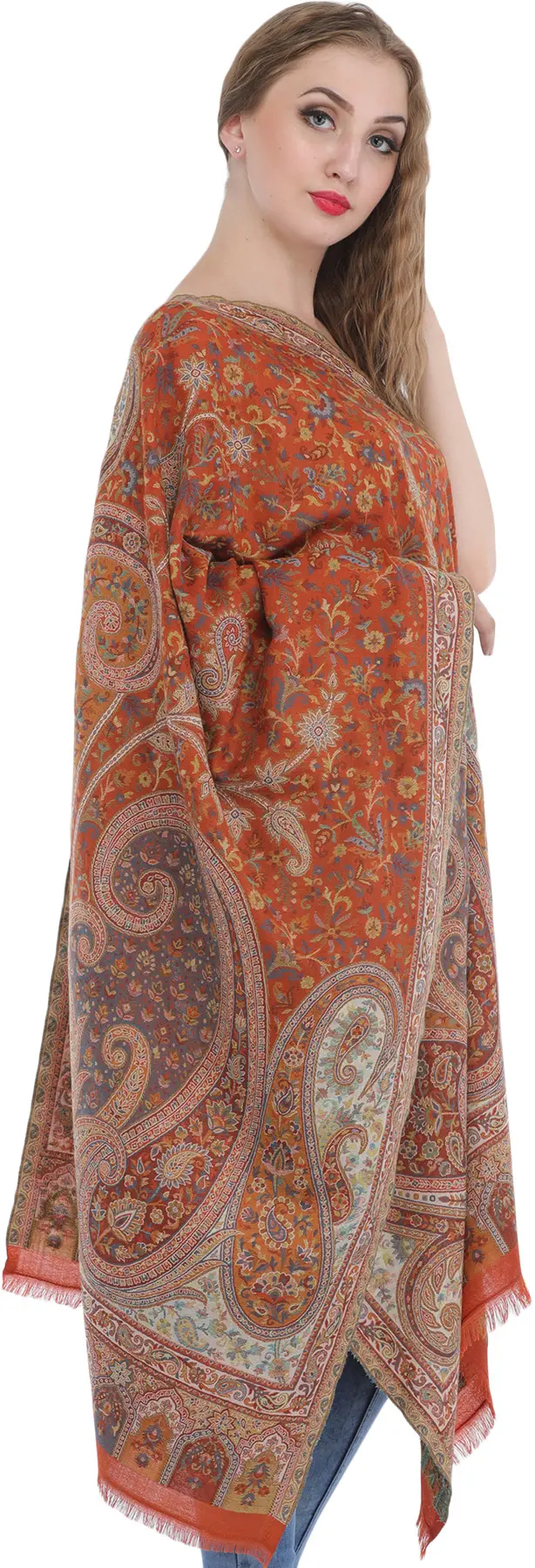 Burnt-Ochre Kani Jamawar Stole from Amritsar with Woven Paisleys and Florals