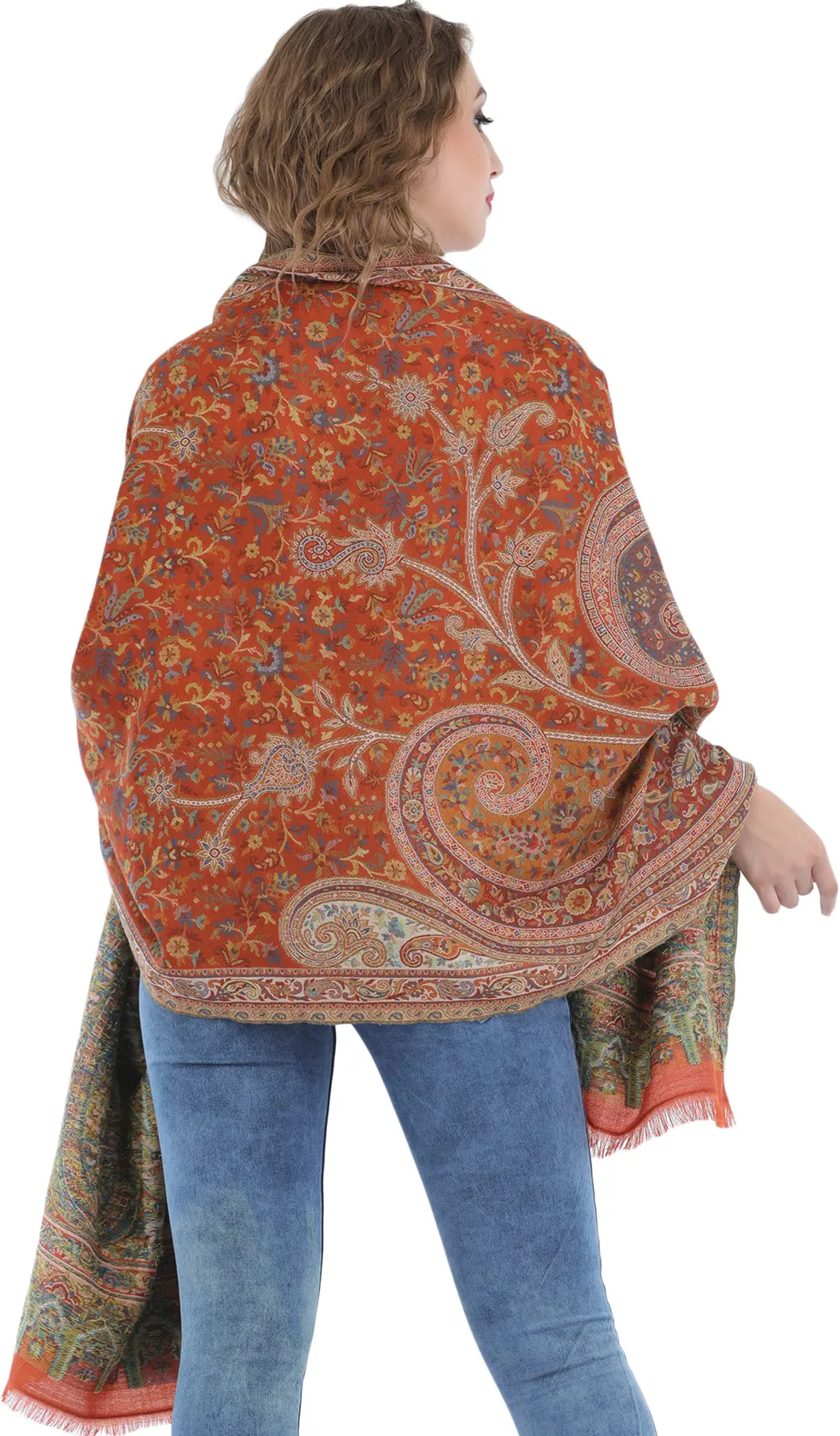 The Kani Jamawar technique is a complex and time-honored method of shawl weaving, where the design is created by interlocked threads, resulting in a reversible fabric with astonishing detail. This stole showcases the full beauty of this art form, with its complex patterns appearing almost painterly. The characteristic paisley motifs, with their teardrop-like curves and swirling tendrils, are a symbol of fertility and abundance, while the floral elements add a touch of natural elegance. The interplay of colors within the weave, from the deep burnt-ochre to subtle hints of other earthy tones and jewel-like accents, creates a visually dynamic and harmonious composition.