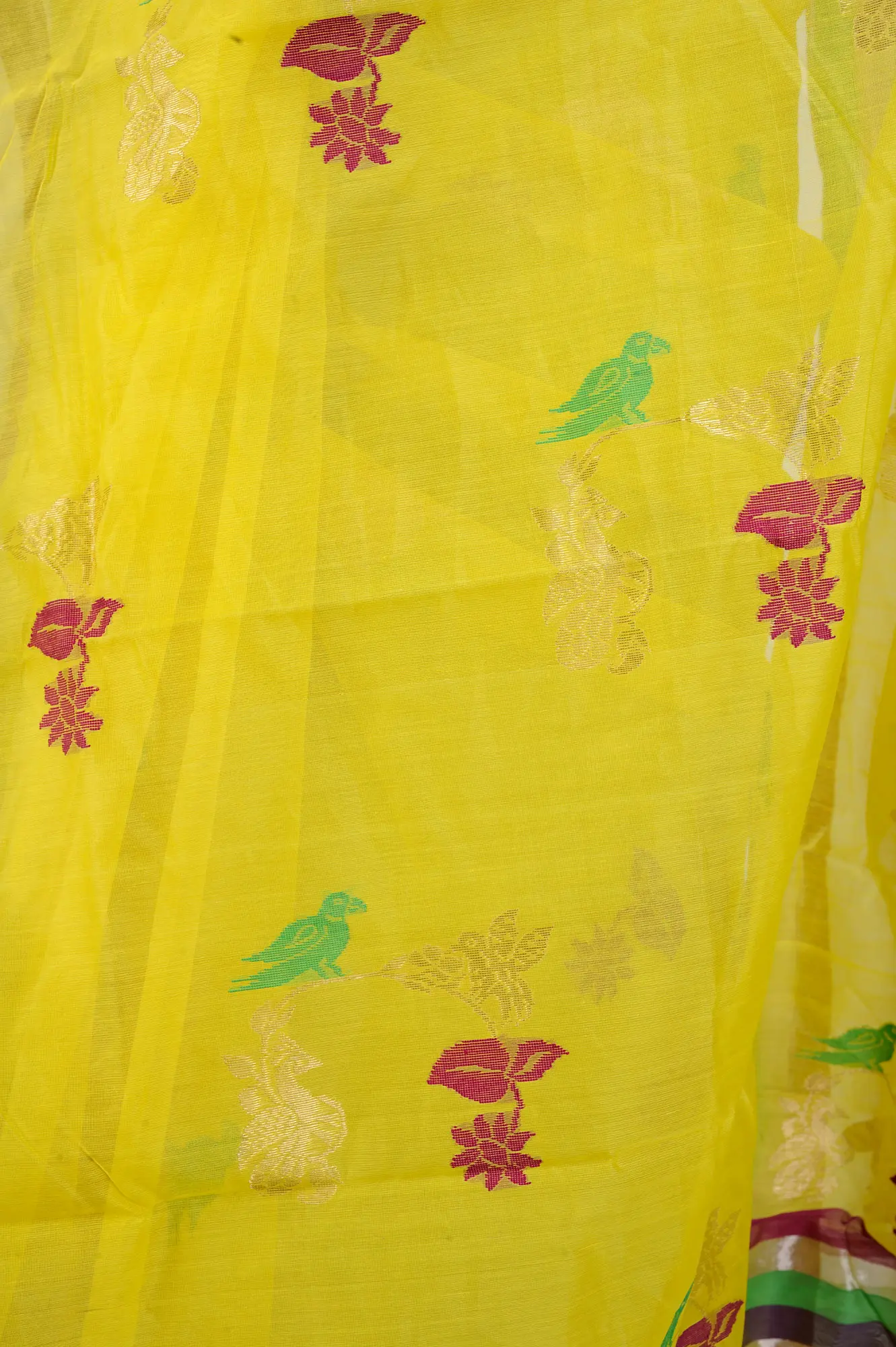Behold the radiant buttercup-yellow Chanderi saree, a canvas of elegance and grace. Hand-woven avian wonders grace its expanse, as delicate as dreams taking flight. The striped border, like paths on life's journey, adds depth to this saree. Wrap yourself in the artistry of nature, a reminder that beauty and freedom are intertwined.