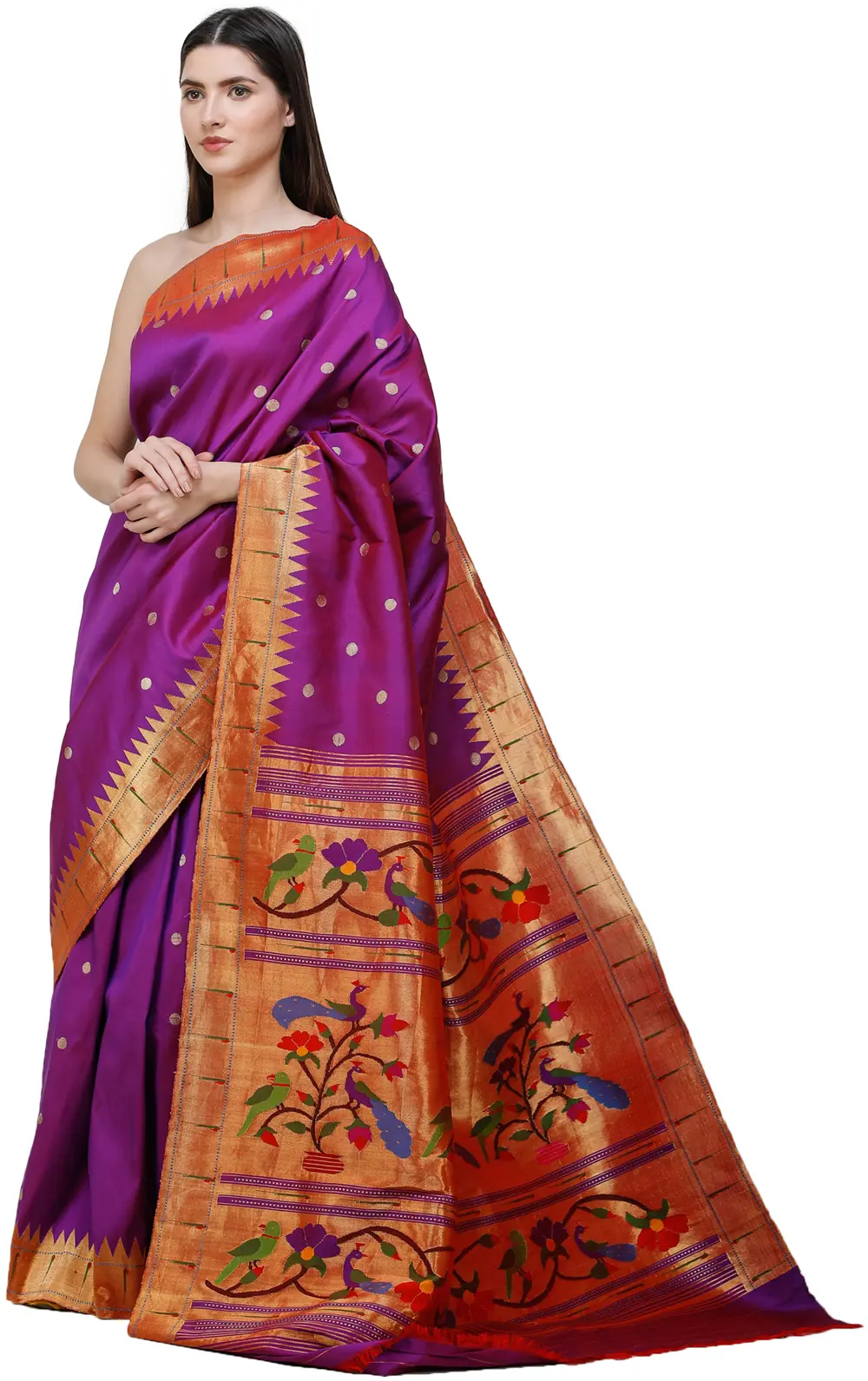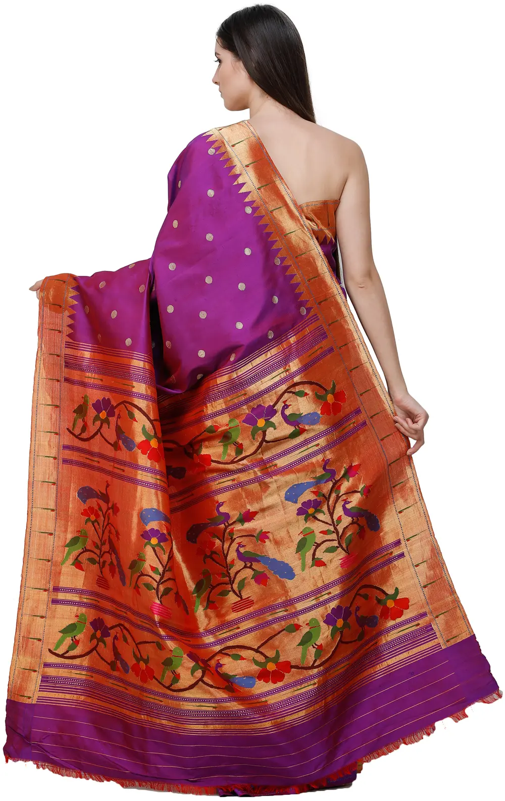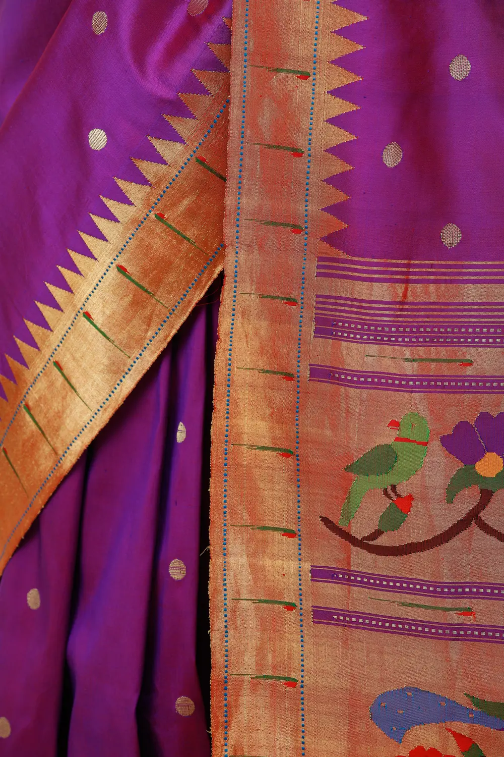 The foundation of the saree is an almost solid colour, the soft purple punctuated by sparsely placed gold booties. A border of moderate thickness woven with pure metallic thread of gold, known locally as zariwork, which extends into the field of the saree in closely juxtaposed triangles. Zoom in on the same to appreciate the luxuriance of the weave and the superior skill with which it has been executed. More than half the body of the endpiece is superimposed with the same zari weave, which is further embroidered with brilliantly coloured Indian birds such as parakeets and peacocks in their natural habitat.