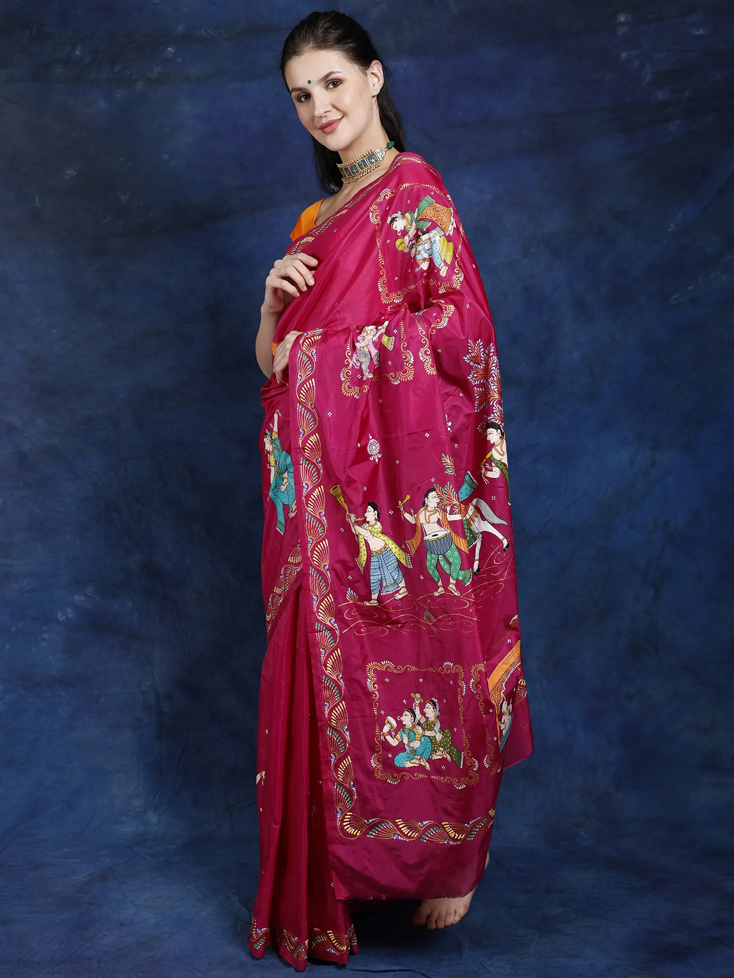 A simple vine adorns the border, outlining the appeal of marriage scenes painted on the body. Dancing women, men playing musical instruments, and bride and groom engaged in various rituals on the endpiece transform the silk saree into an artistic piece of traditional Indian wear.