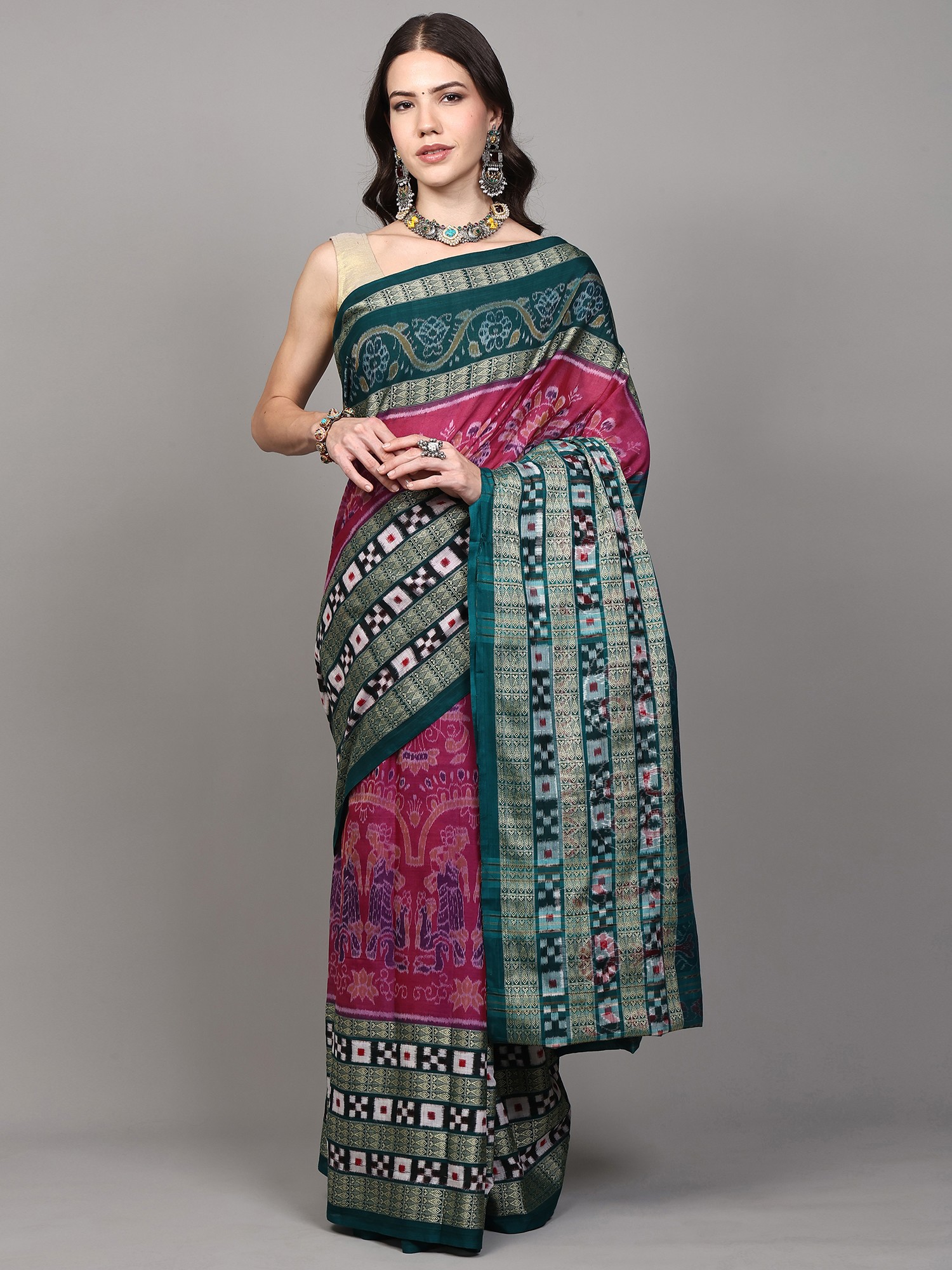 The beauty of this saree is further enhanced by its thoughtfully incorporated motifs. The body of the saree features delicate lady figure motifs, subtly woven into the fabric, adding a touch of graceful storytelling. These figures are rendered in complementary shades, creating a visual narrative that is both enchanting and refined. Complementing the body is a striking, wide woven border. This border is a masterpiece in itself, showcasing a dynamic geometric pattern with a captivating fish motif. The contrast between the soft elegance of the lady figures and the bold definition of the border creates a visually arresting ensemble, perfect for making a statement. The deep teal green of the border provides a grounding contrast to the vibrant pink, creating a harmonious and sophisticated colour palette.