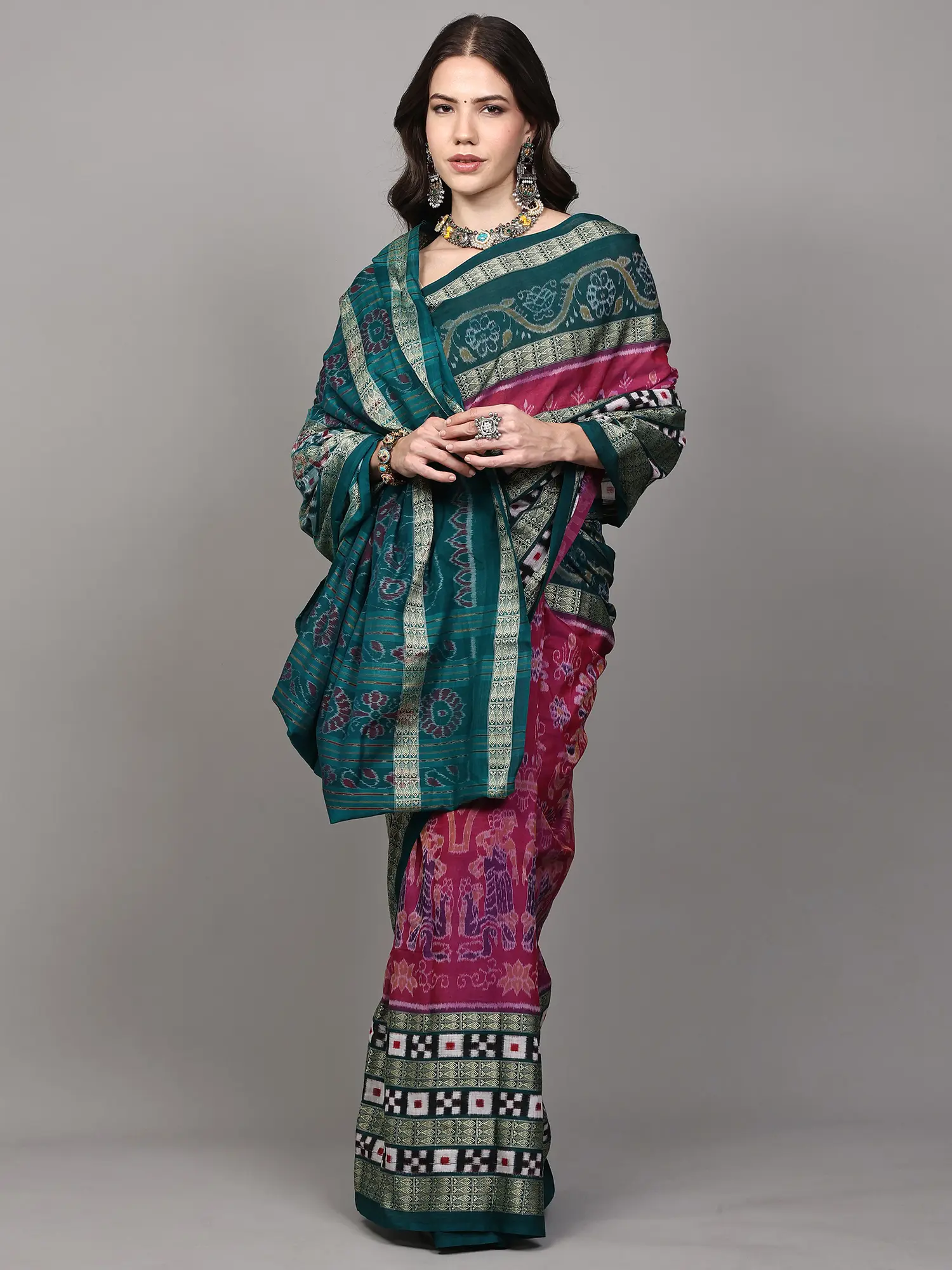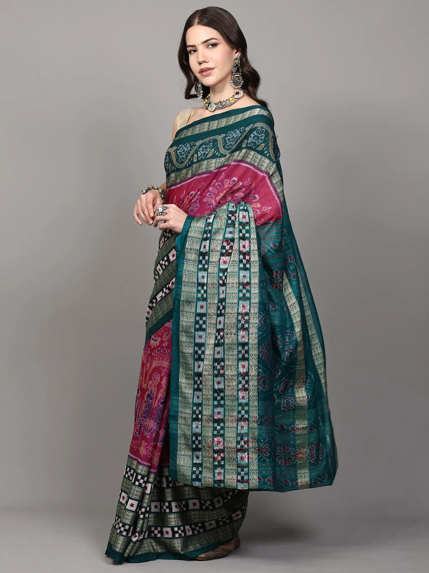 Handwoven Raw Silk Patola Saree With Meenakari Pallu And Zari Border