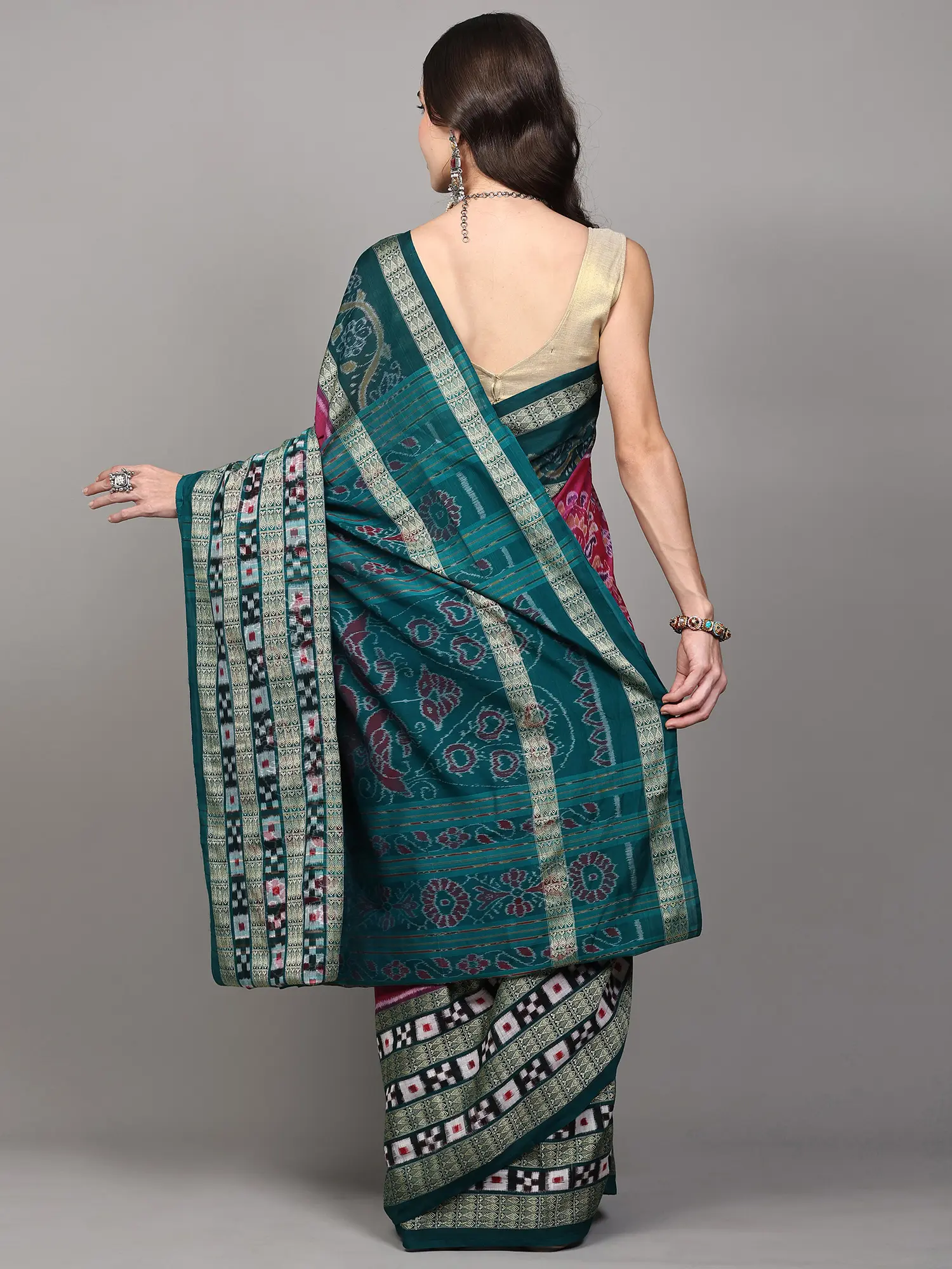 Immerse yourself in the rich heritage of Indian textiles with this exquisite pure cotton handloom saree, a testament to the intricate art of Sambalpuri Ikat weaving. Crafted with meticulous care, this saree is more than just an garment; it's a wearable piece of art that tells a story of tradition, skill, and timeless elegance. The vibrant cactus flower pink hue of the body serves as a captivating canvas for the detailed craftsmanship that defines this unique creation.