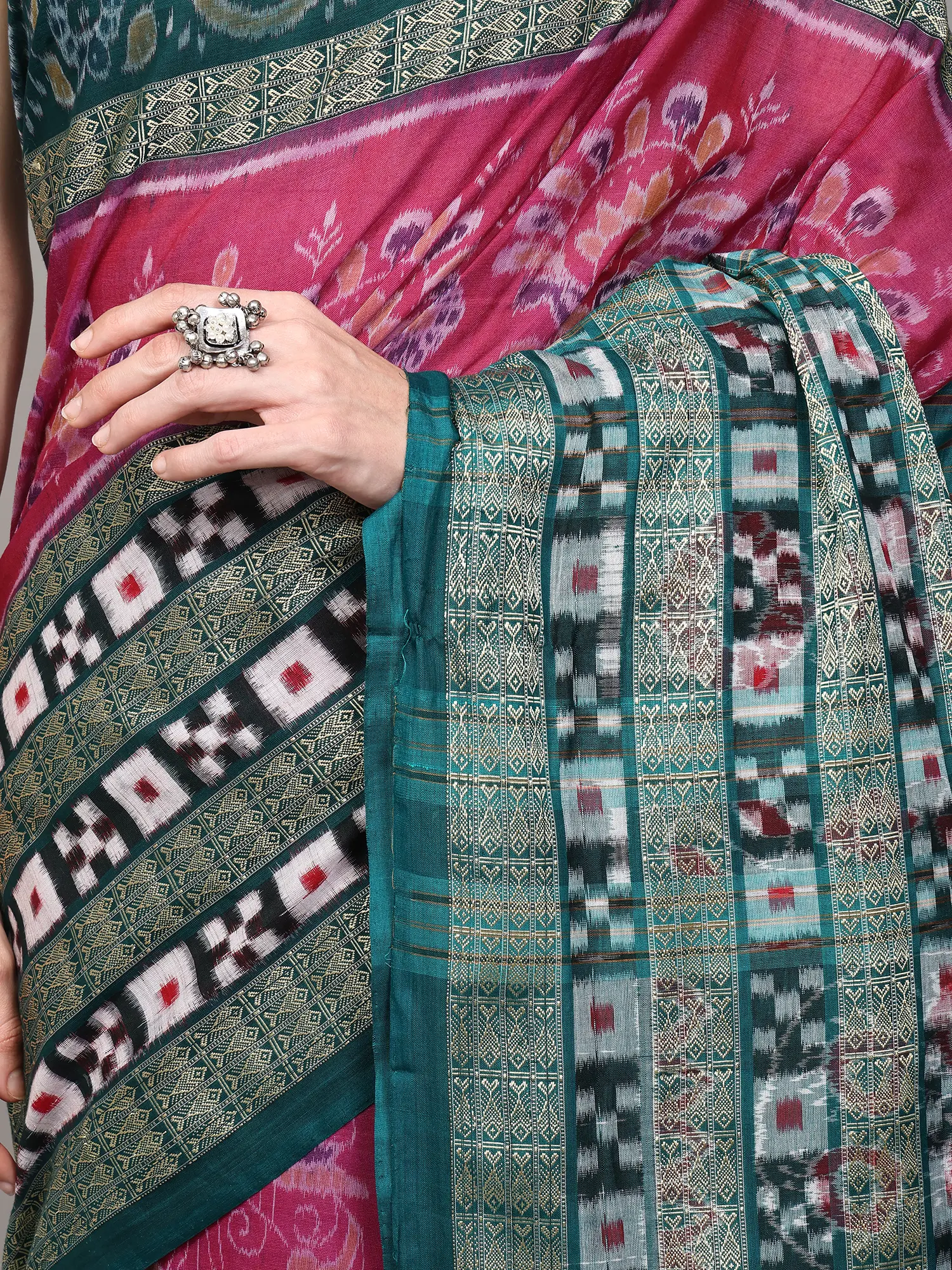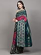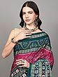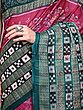 Green and Red Handloom Ikat Saree with Floral Motifs and Rudraksha Border from Sambalpur