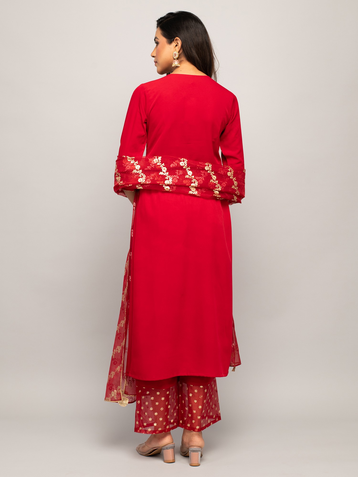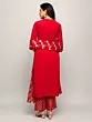 Step into the spotlight with this captivating ensemble, a perfect blend of traditional aesthetics and contemporary design. The vibrant cadmium-red hue exudes confidence and joy, making it an ideal choice for festive celebrations and special occasions. Crafted from luxurious crepe fabric, this outfit promises a comfortable and flattering drape, allowing you to move with grace and ease. The kurta features a sleek, straight silhouette that complements various body types. Its clean lines are enhanced by delicate sequins work, adding a subtle shimmer that catches the light beautifully. Notice the thoughtful placement of these embellishments, creating a focal point that draws the eye without being overwhelming. The round neckline is both elegant and versatile, making it easy to accessorize with your favorite jewelry.
