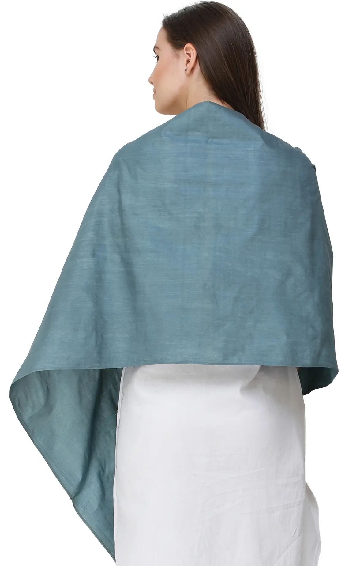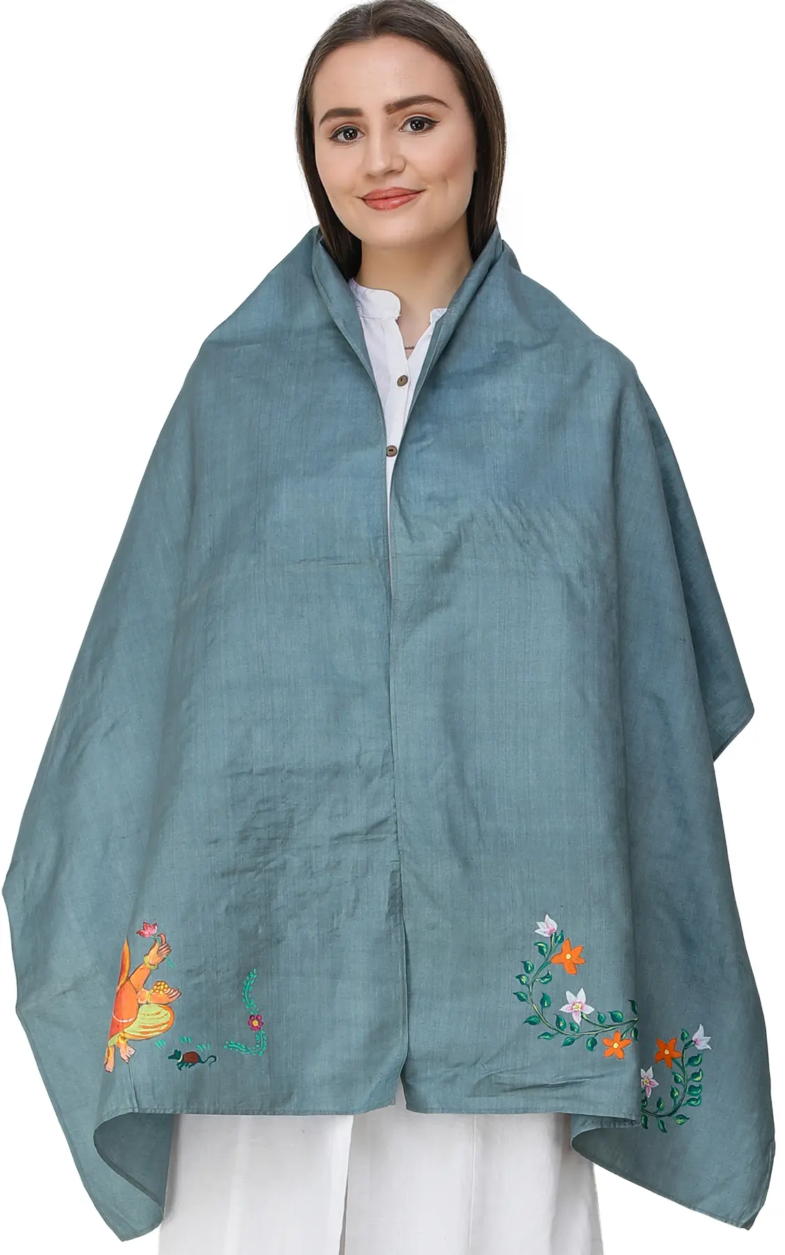 Discover a blend of spiritual significance and artisanal craftsmanship with this exquisite stole. Crafted from a luxurious cotton silk blend, this accessory offers a soft drape and a subtle sheen, making it perfect for both everyday wear and special occasions. The captivating cameo-blue hue provides a calming backdrop, evoking a sense of peace and tranquility.