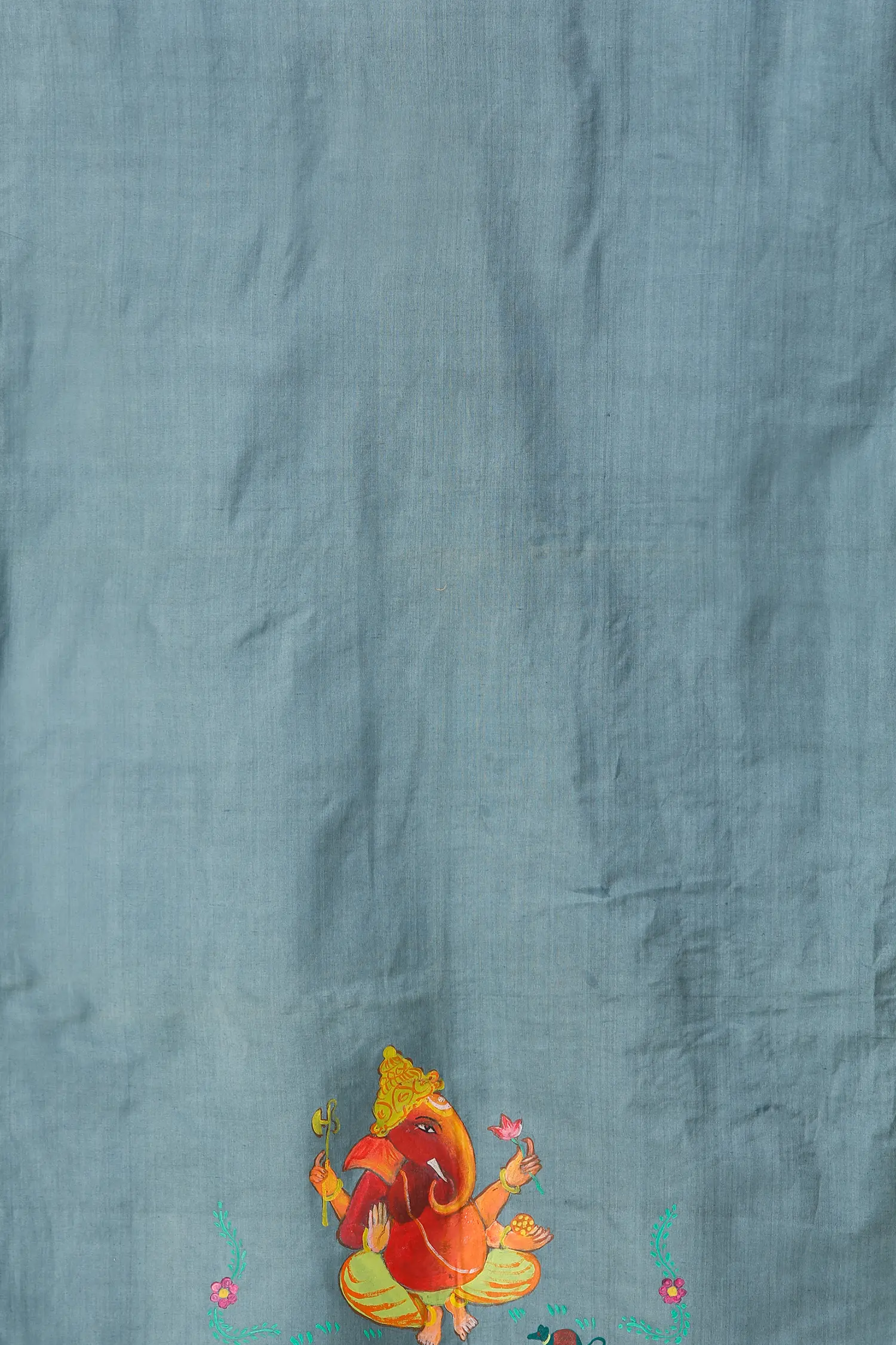 Adorning the edge of this beautiful stole is a delicate hand-painted motif featuring Lord Ganesha, the revered Hindu deity of wisdom, prosperity, and new beginnings. Each stroke of the artist's brush brings to life the benevolent form of Ganesha, surrounded by a charming vine of blooming flowers and lush green leaves. This intricate artwork is not merely decorative; it's a testament to devotion and a symbol of auspiciousness, making this stole a meaningful addition to your prayer rituals or as a statement piece. The vibrant colors of the flowers, a mix of gentle pinks and lively oranges, create a beautiful contrast against the serene blue, drawing the eye and adding a touch of elegance.
