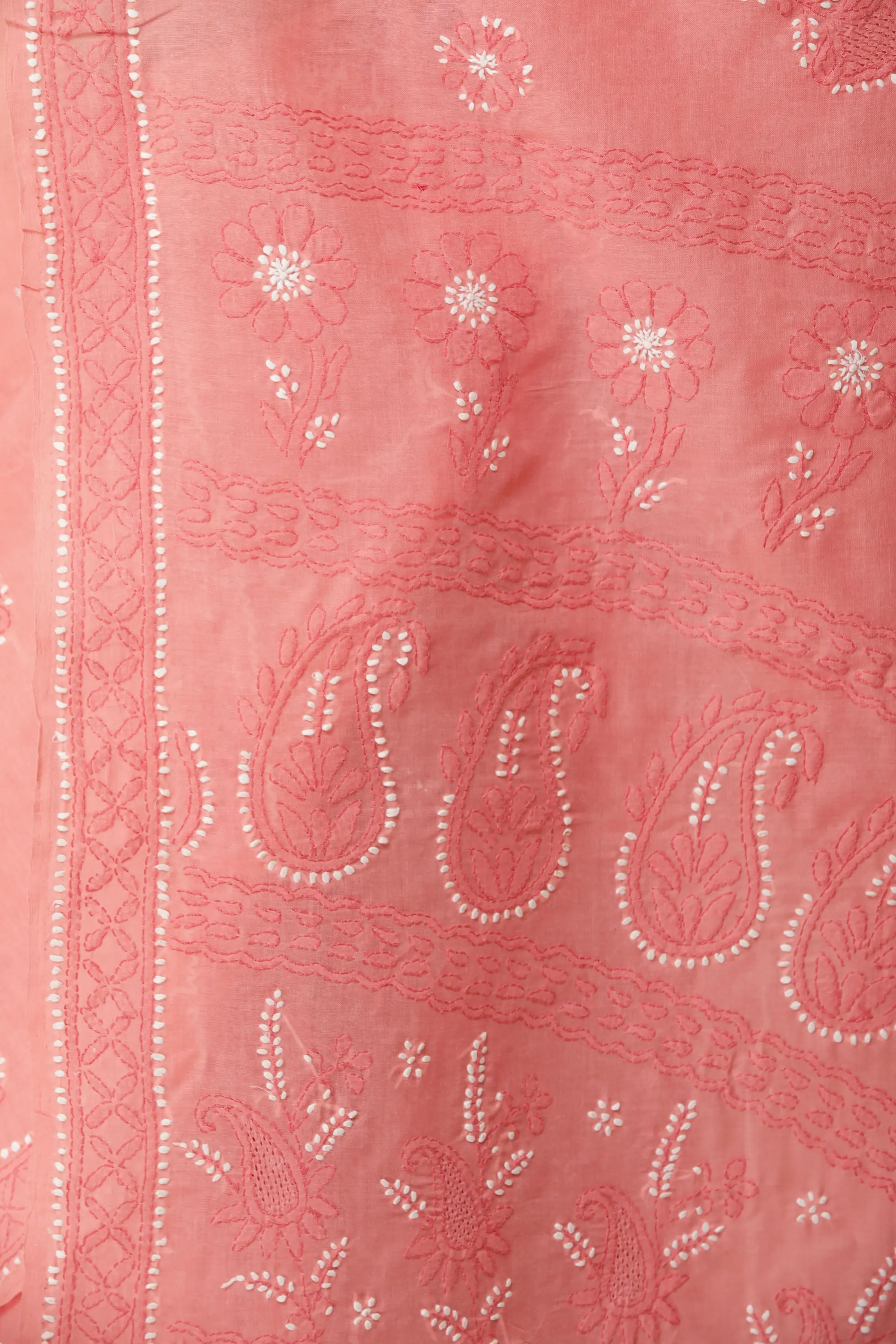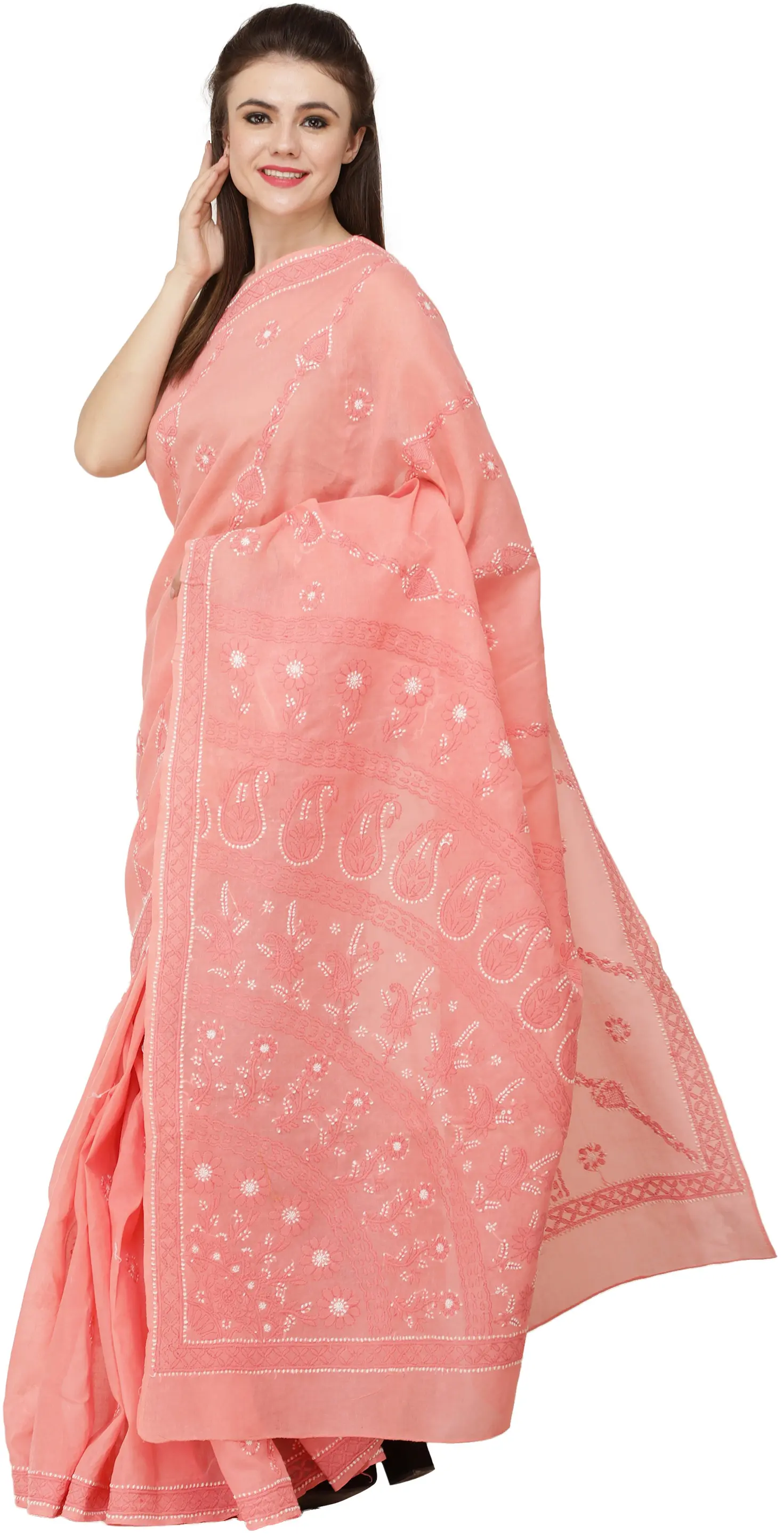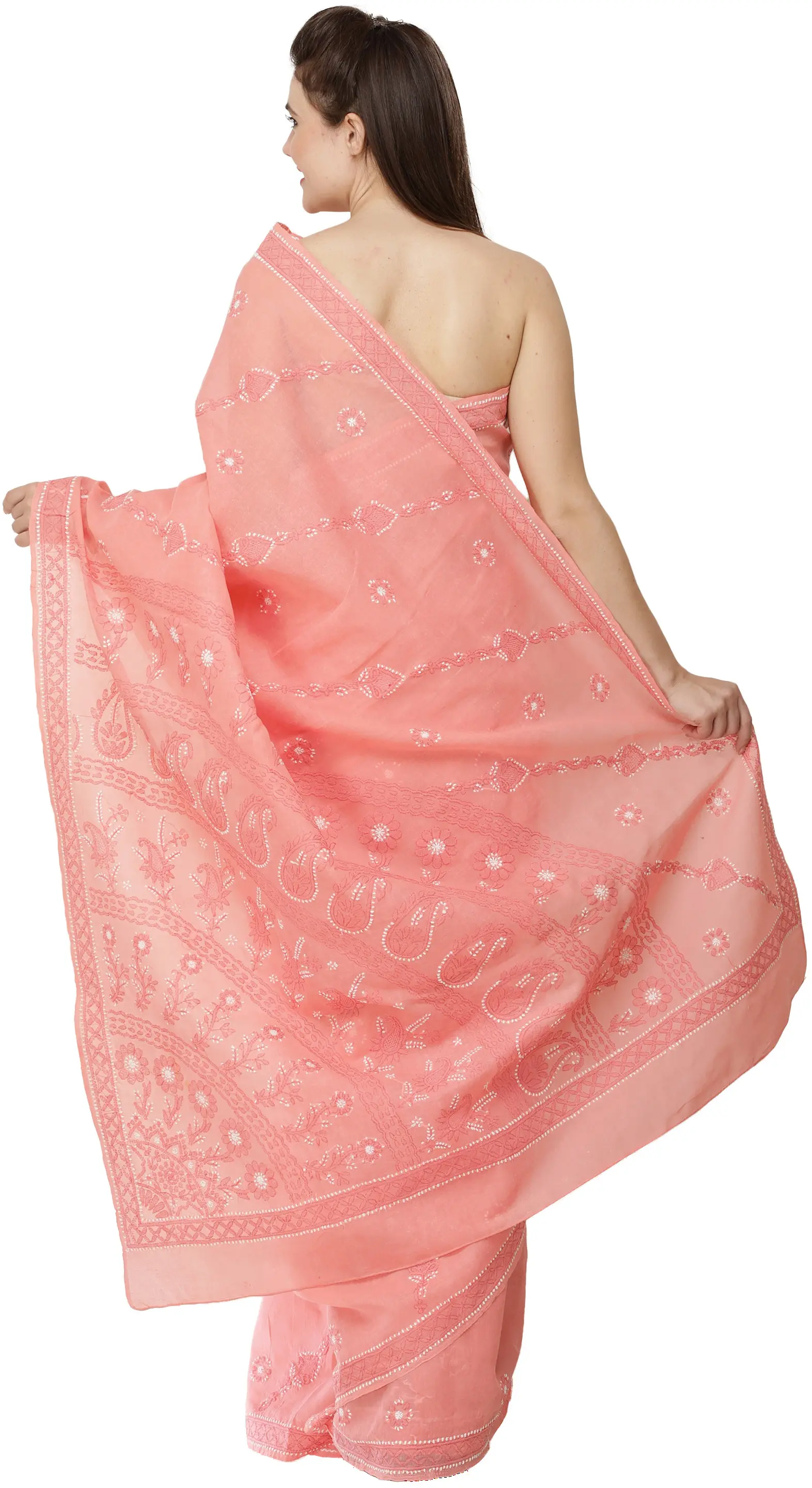 One of the most prominent features of the Lucknow Chikankari work is the stitches. Each and every stitch is done to perfection and the neatness in the work is hard to find elsewhere. The delicate and artfully done hand-embroidery gives the garment a look of richness and skillfulness, which is exactly what you pay for. Floral patterns and Chikankari go hand in hand. Due to its strong Persian influence, flowers have always been a staple with stems, buti and leaves added in to complete the design. Small flower motifs are spread across the sari to give it more elegant and sophisticated look.
