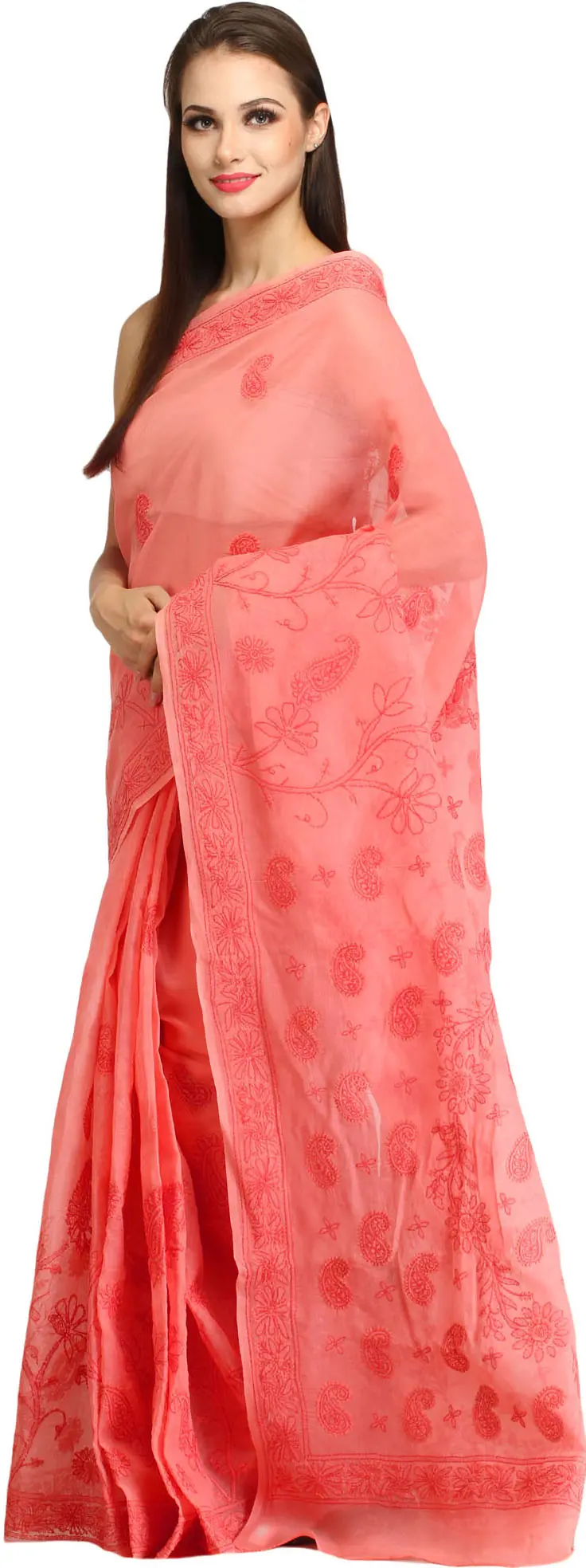 Salsa-Red Long Kurta Top/Kameez from Lucknow with Chikan Embroidery
