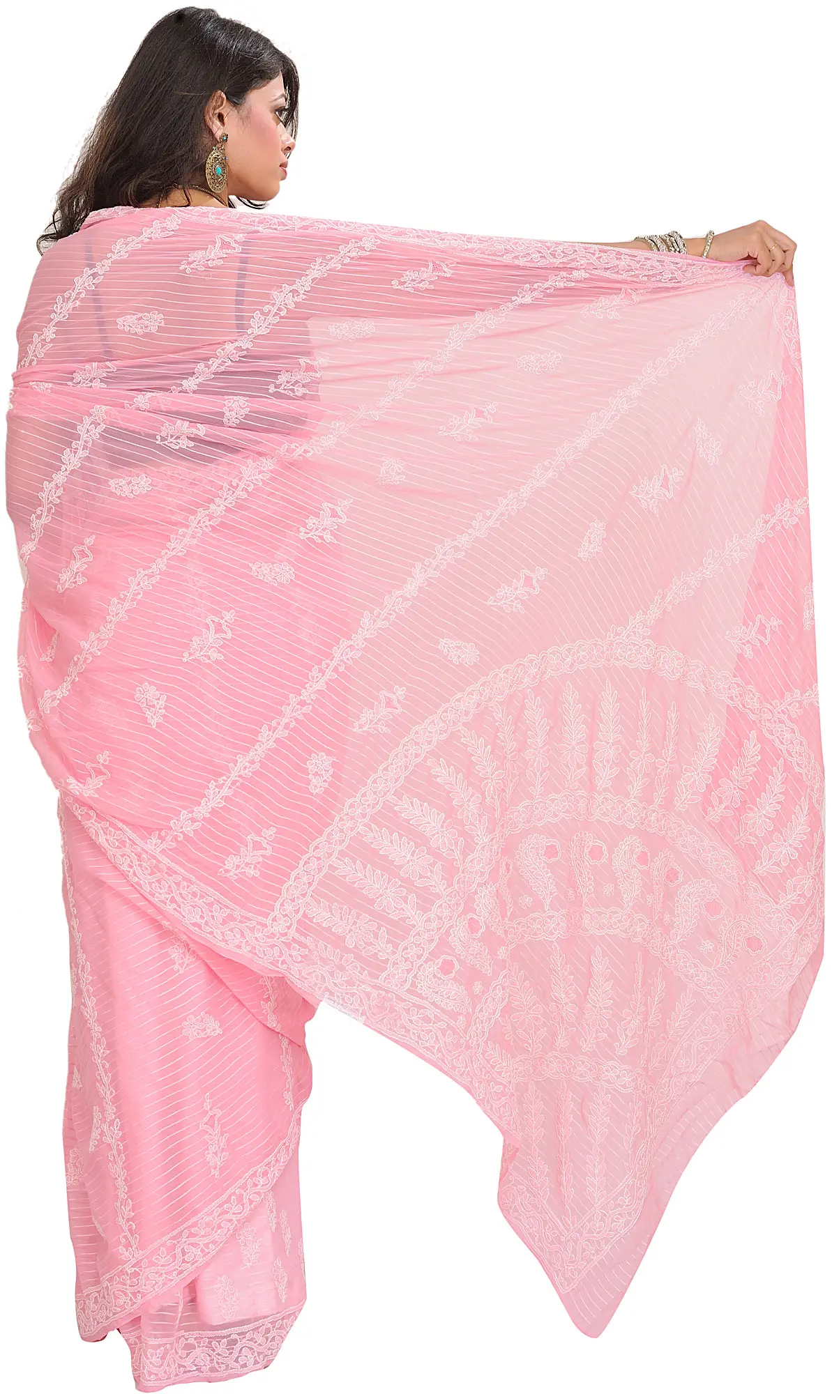Egret-White Georgette Saree from Lucknow with Chikan Embroidered Paisleys by Hand