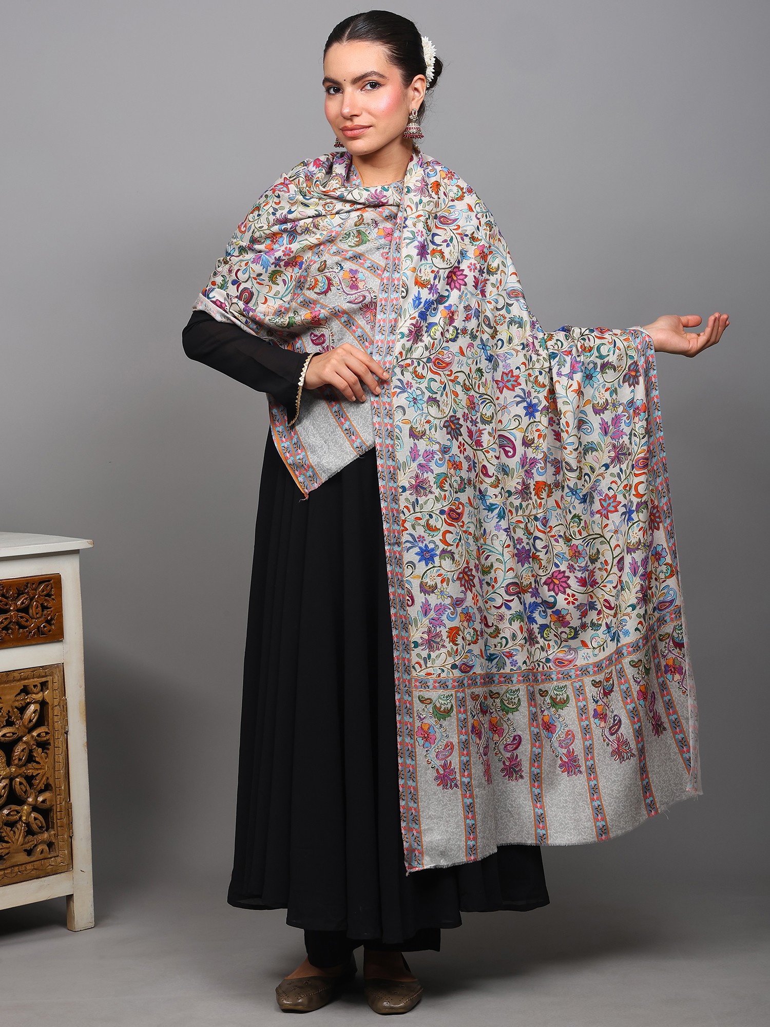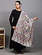 Black-Onyx Pure Wool Stole with Aari Embroidered Flowers from Kashmir