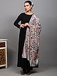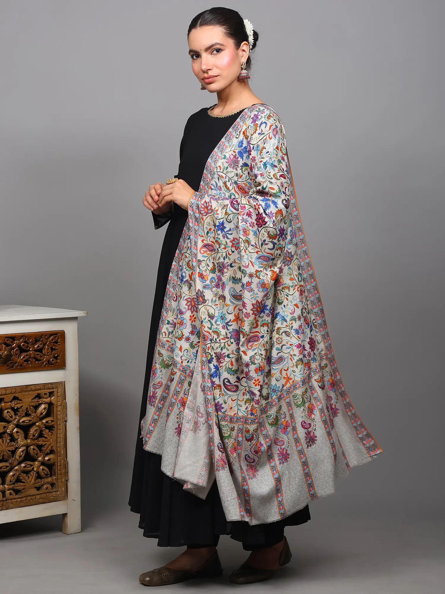Moonless-Night Pure Pashmina Shawl with Heavily Detailed Floral Multi-coloured Kalamkari Embroidery