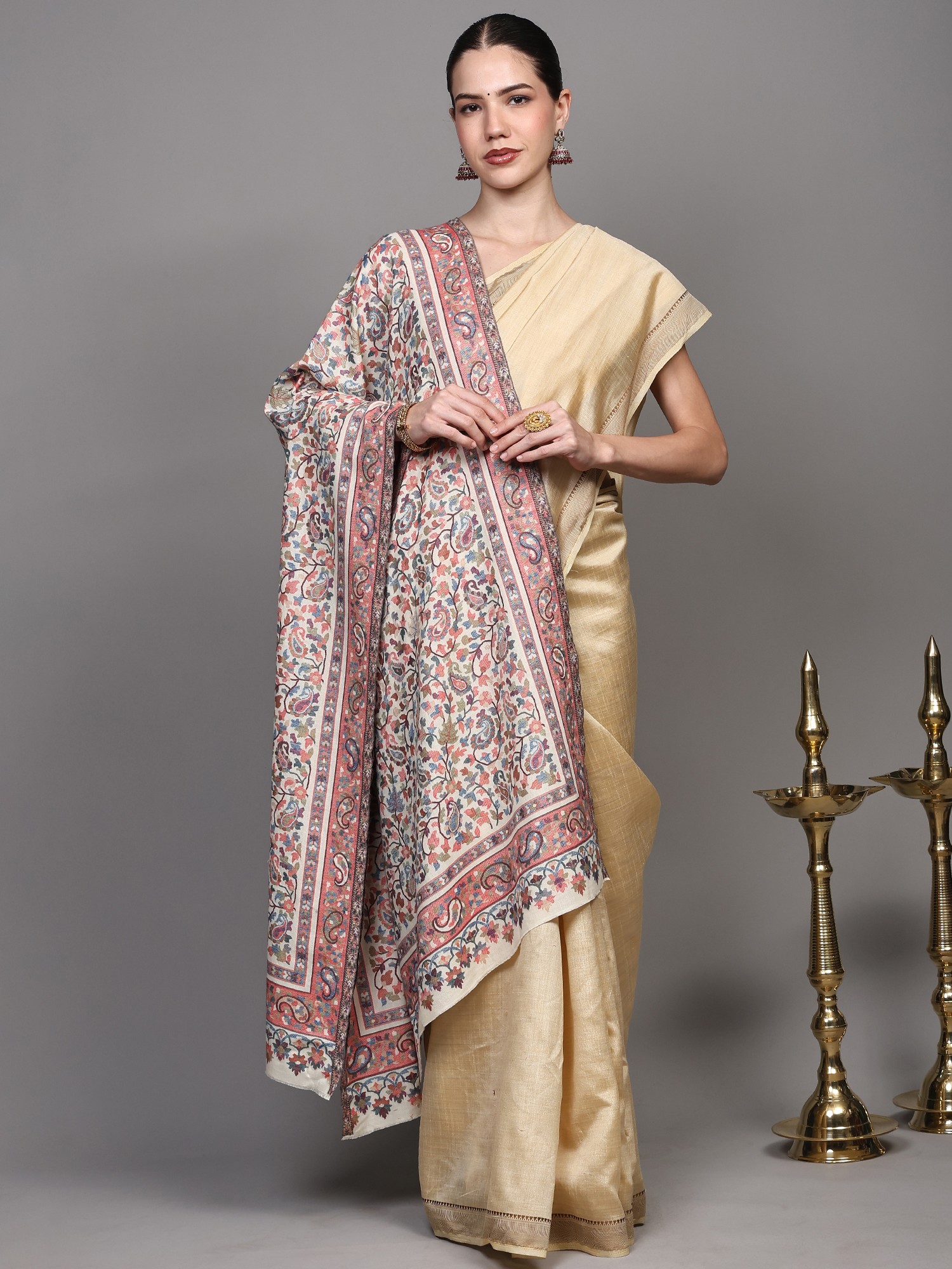 The visual narrative of this shawl is one of abundant beauty. The background, a serene Cannoli cream, allows the vibrant, yet subtle, interplay of colors within the woven design to truly shine. Delicate floral sprigs, rendered in shades of rose, sapphire, and emerald, are scattered throughout, creating a sense of ethereal bloom. These are complemented by the classic paisley motifs, each outlined with precision, adding a touch of regal sophistication. The border of the shawl features a more prominent arrangement of these designs, framed by subtle stripes, drawing the eye and accentuating the overall grandeur of the piece.