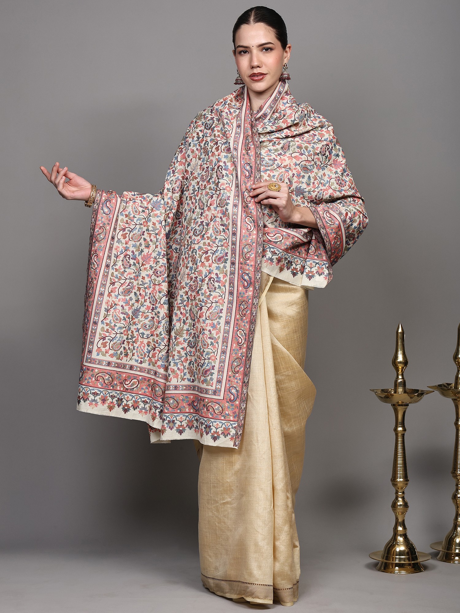 Adorn yourself with an heirloom piece that whispers tales of tradition and artistry. This exquisite wool shawl, a testament to the celebrated Kani weaving technique, is a symphony of intricate patterns and delicate hues. The Cannoli cream base provides a soft canvas for a mesmerizing all-over motif, where blooming flowers and graceful paisleys intertwine in a dance of color and form. Each thread is meticulously woven, creating a texture that is both rich and inviting, promising warmth and unparalleled elegance.