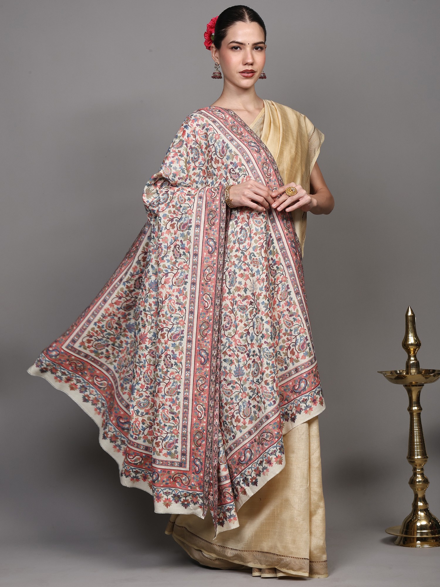 Pure Wool Kani Jamawar Shawl from Amritsar with Embroidered Flowers and Paisleys
