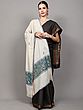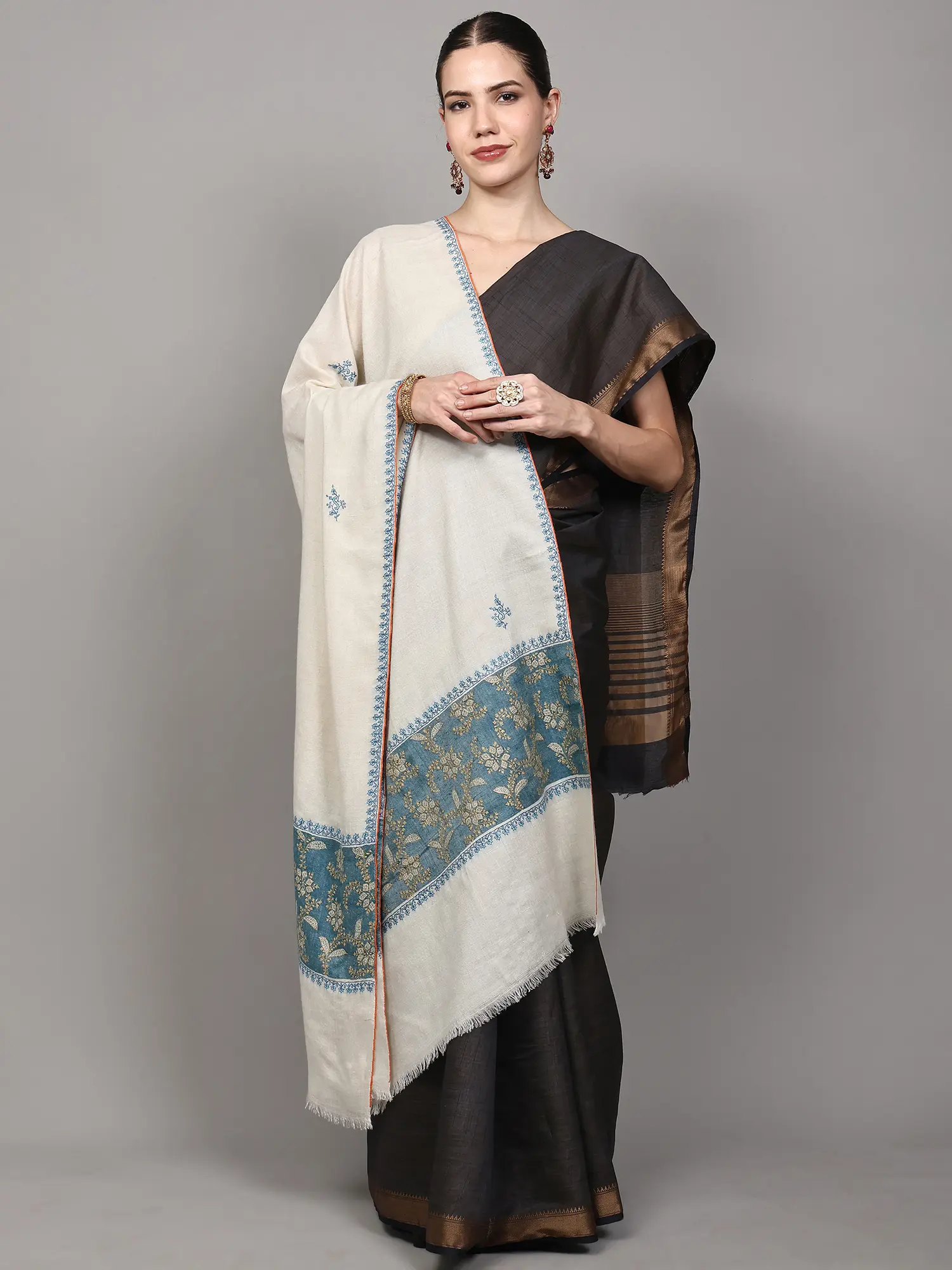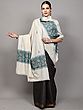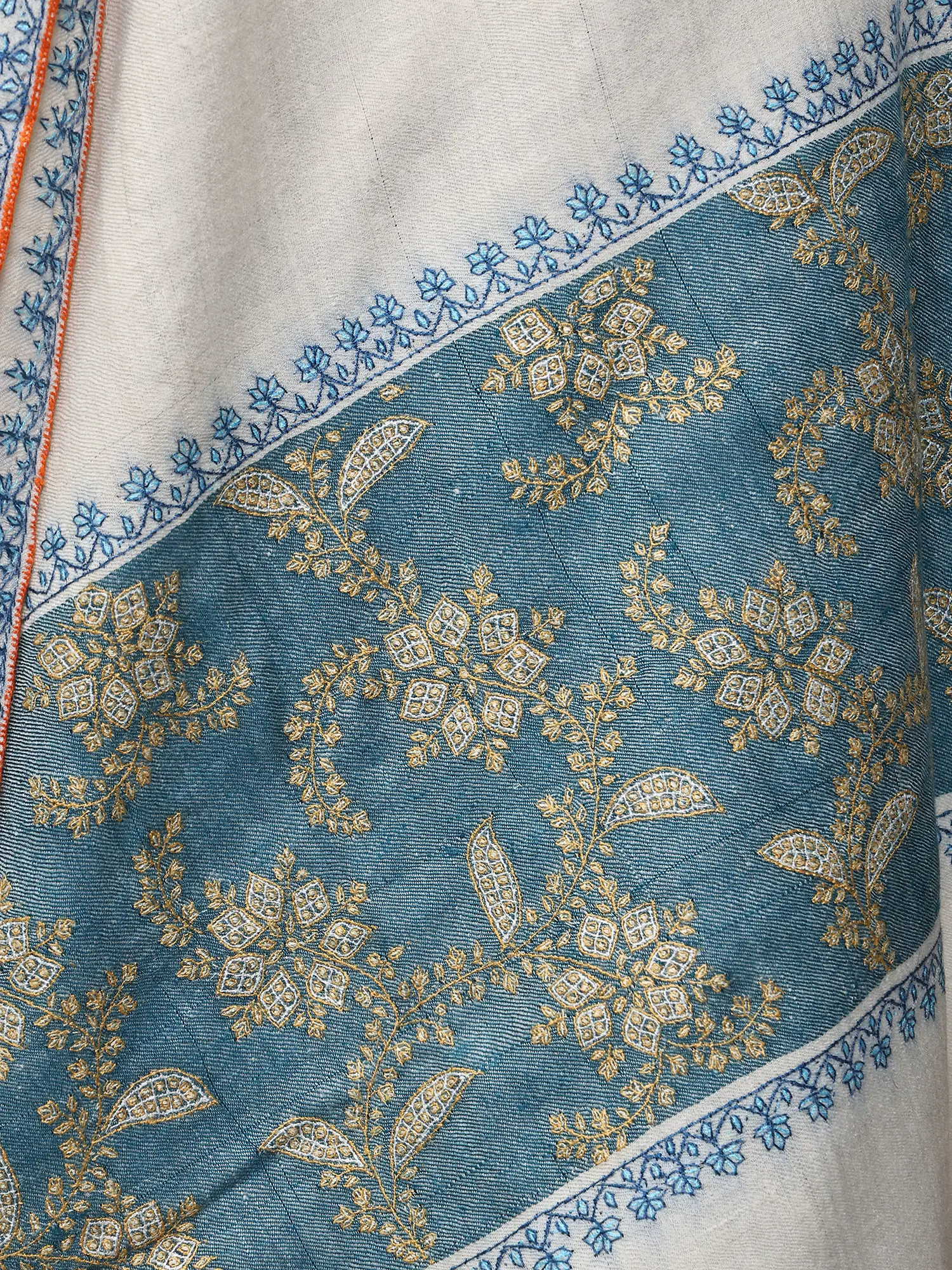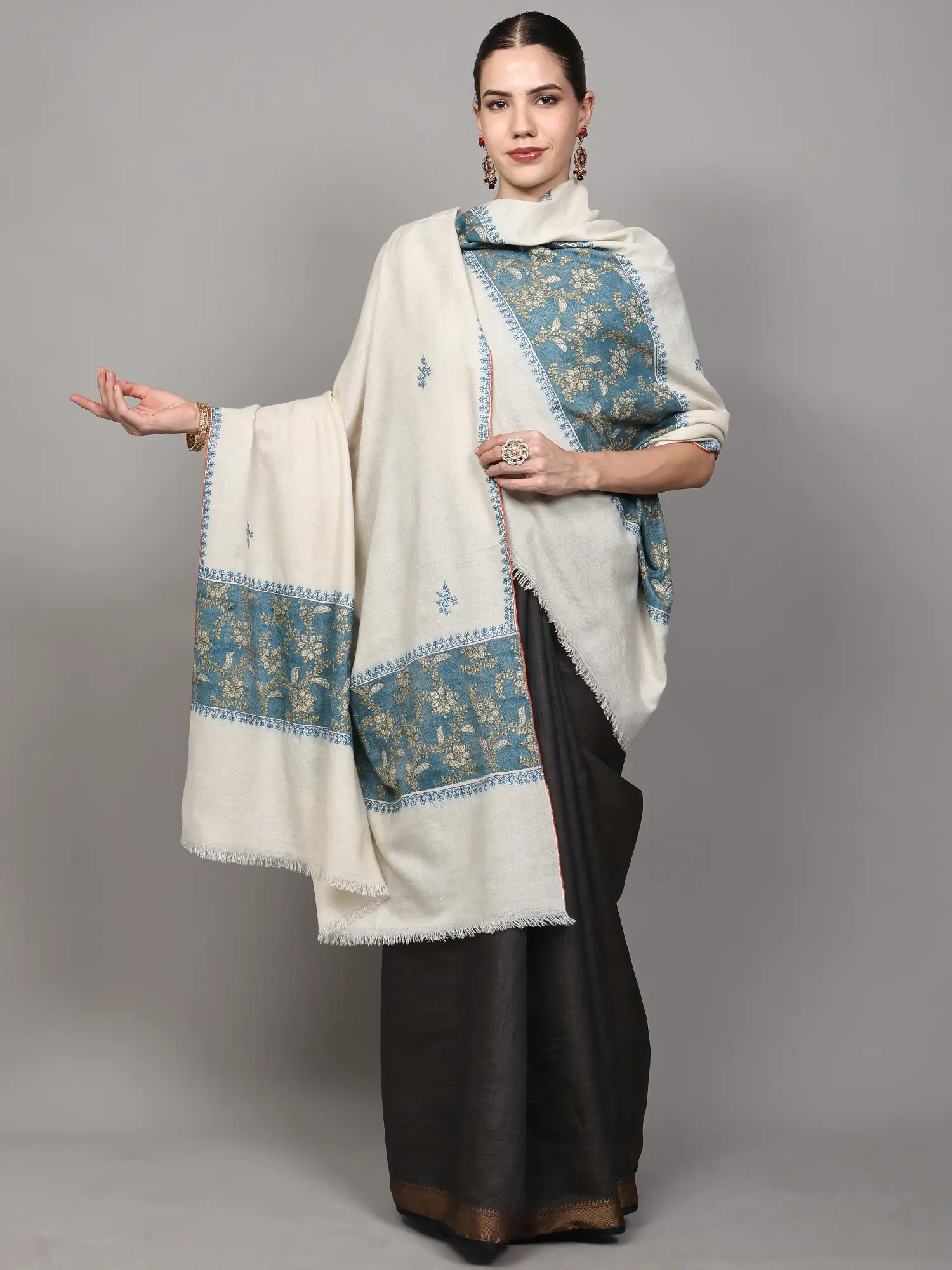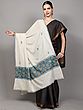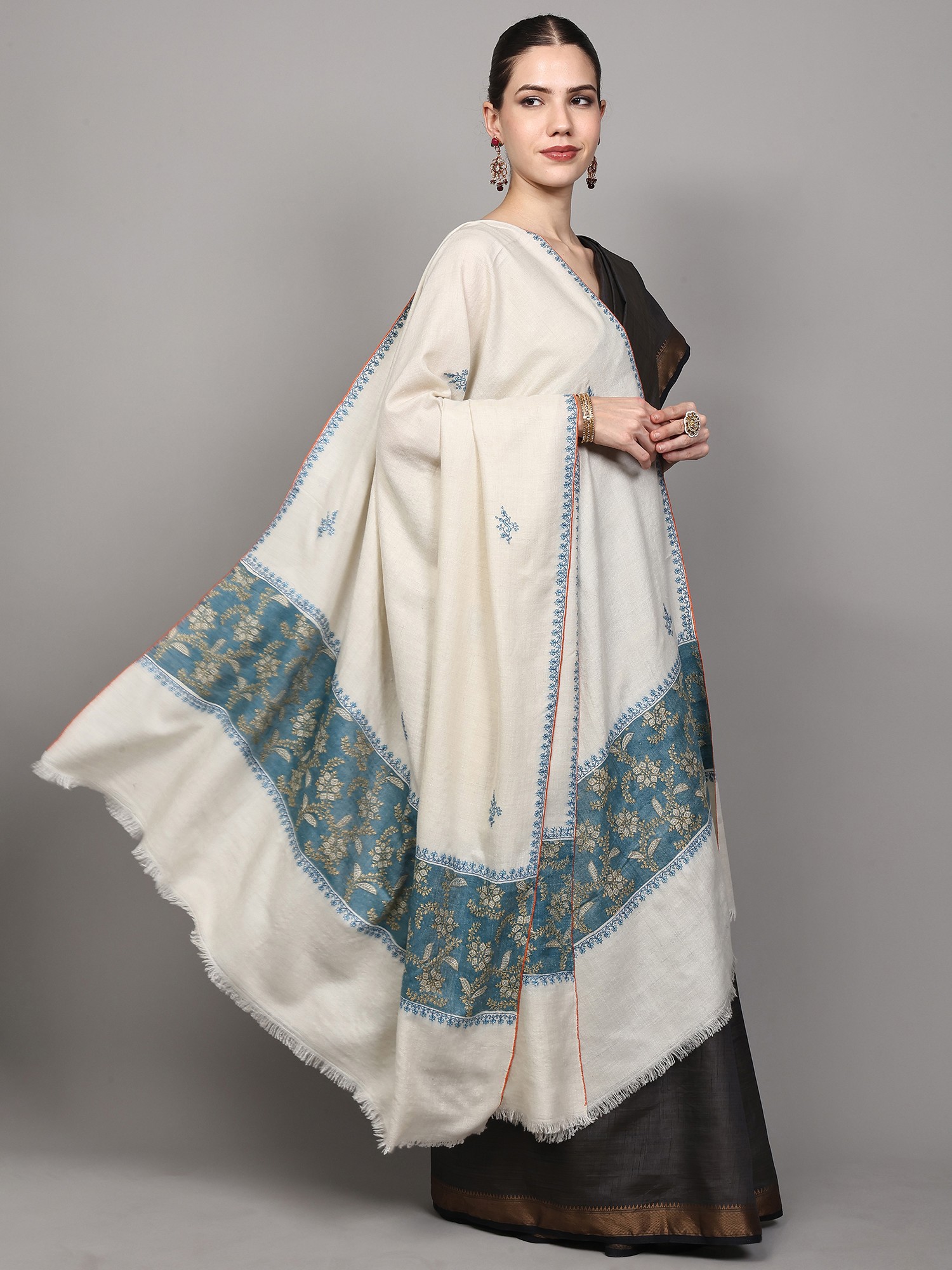 The true magic of this shawl lies in its Sozni hand embroidery. Delicate floral motifs bloom across the creamy expanse, each stitch a whisper of dedicated artistry. This traditional Kashmiri embroidery technique involves meticulously working thread through the fabric to create raised, intricate patterns. The subtle blue threads used for these scattered blossoms add a touch of refined color without overpowering the shawl's inherent grace. ––––––––––––––––––––